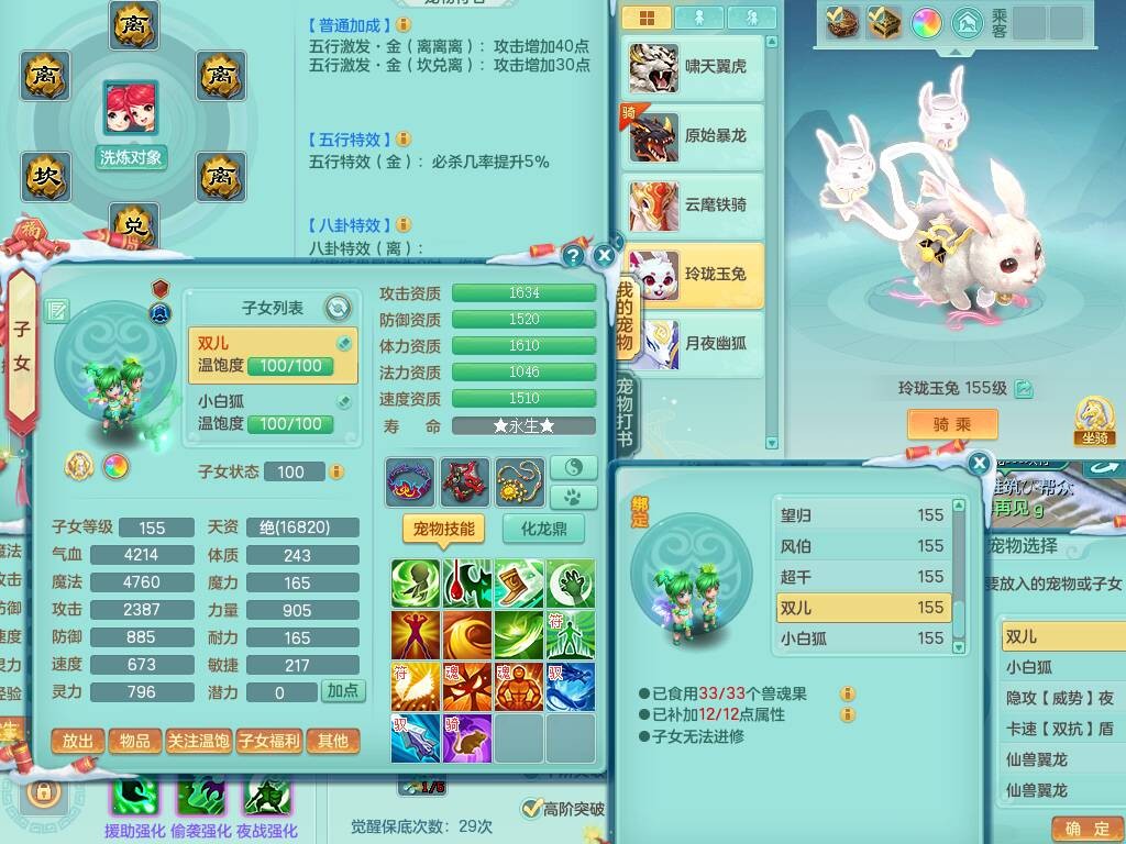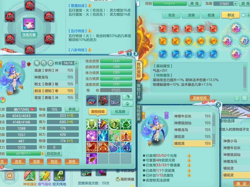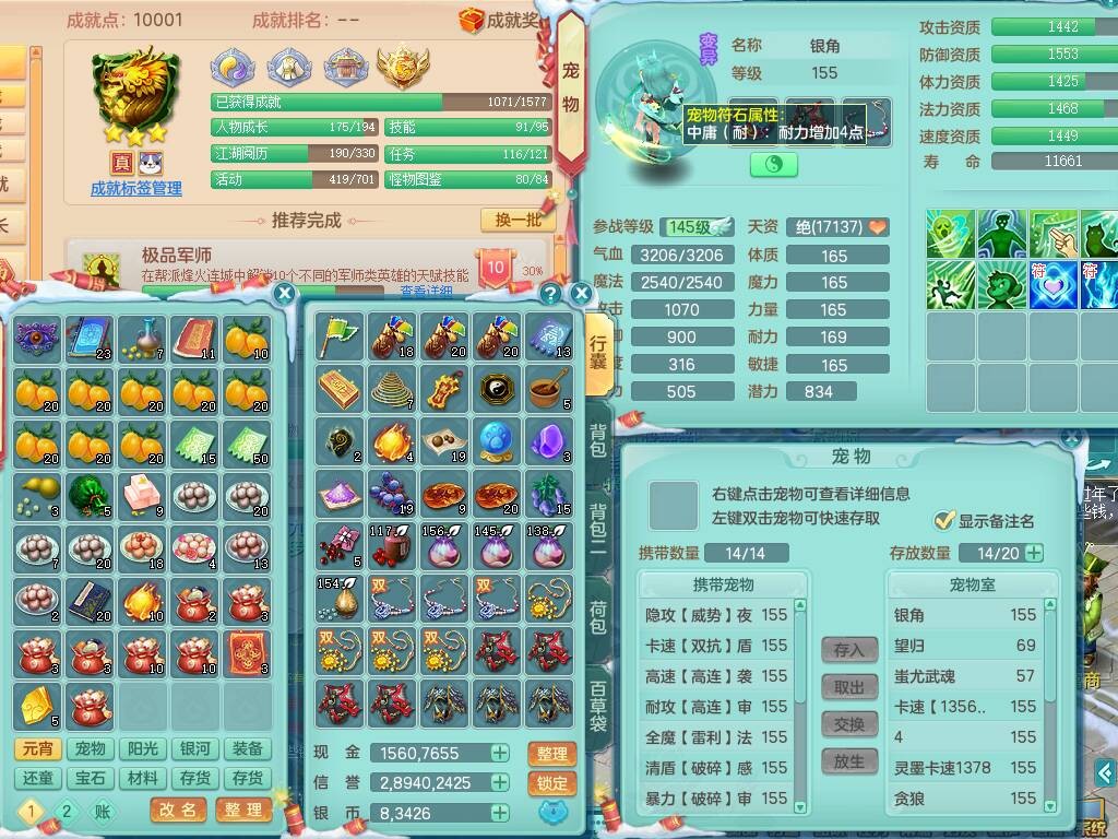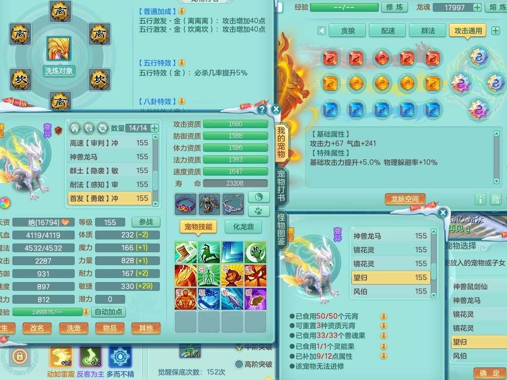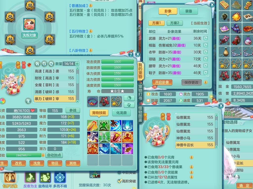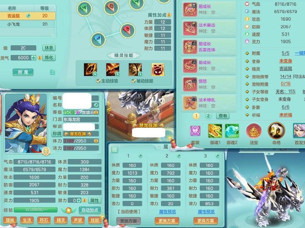 20-9882,2020区159男龙宫精灵怒,5龙2龙皮,4内胆神,1破镜,【8只觉醒,已潜龙】,1宠皮,4位靓号,3只六技能镜花灵,1只6技能龙姬,1特殊(锤子),法爆单加53武器,266易成长单加55项链,易成长五雷衣服,法缭鞋,有回春武器,封锁慈航单加52武器,5.5基础鼎+70攻,280血,9个纯六字,1个五字,15只满果子,宠排在榜,仓库46神兽内丹碎片,5个坐骑,原始暴龙泰坦+洪荒+西瓜冰武器