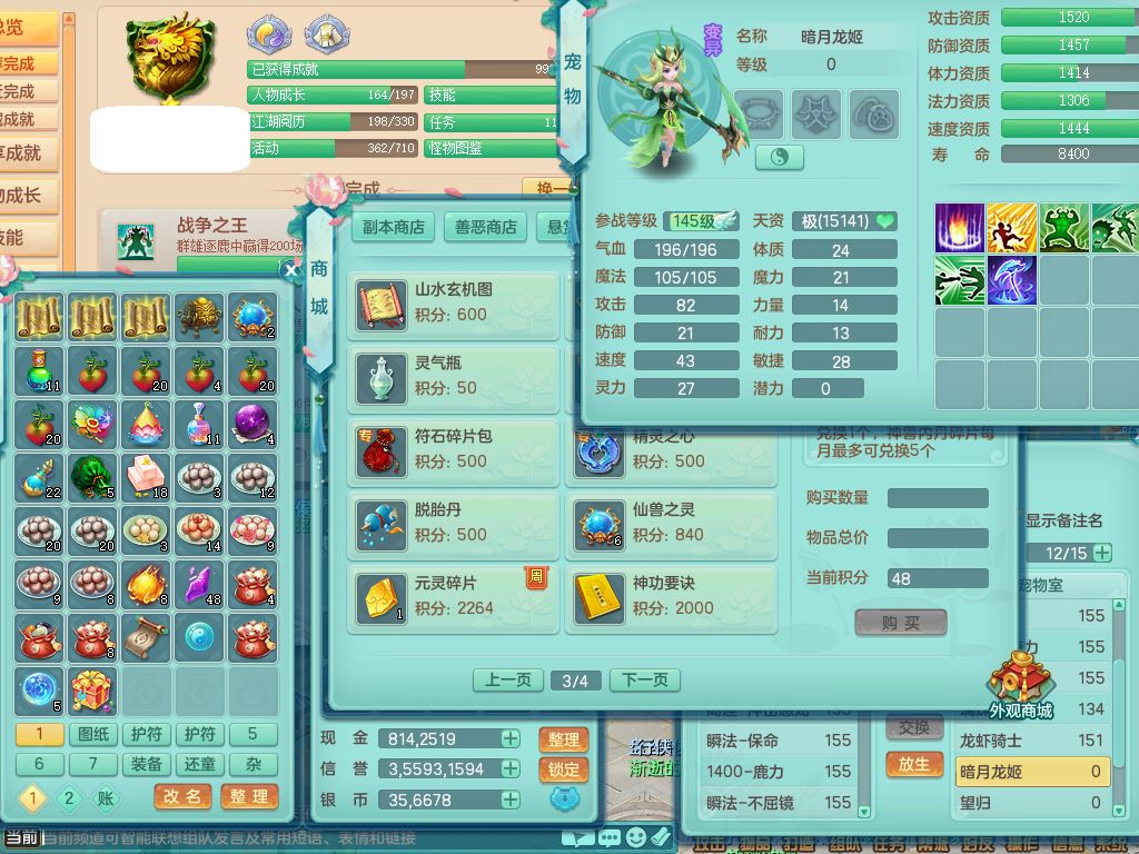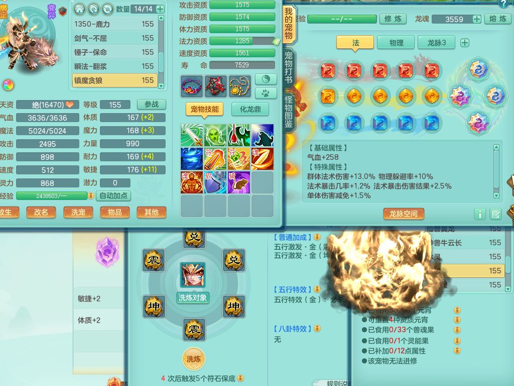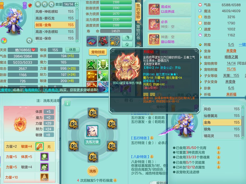 ss9979三生万物159男万兽【暴龙泰坦+火焰之力】精灵歌,2龙(换)1内1龙马(无内)1皮,3镜花灵,8只满果子7觉醒7个纯6字,9红,924单加必杀武器,Y以战头,崩山衣服,Y晶清腰带,迅捷四海鞋,法系单加Y衣服,252Y五雷项链,法缭四灵鞋,鼎5.0+70,52天月卡,永久背饰精灵皮肤,65果子,48内丹碎片,2只双人坐骑