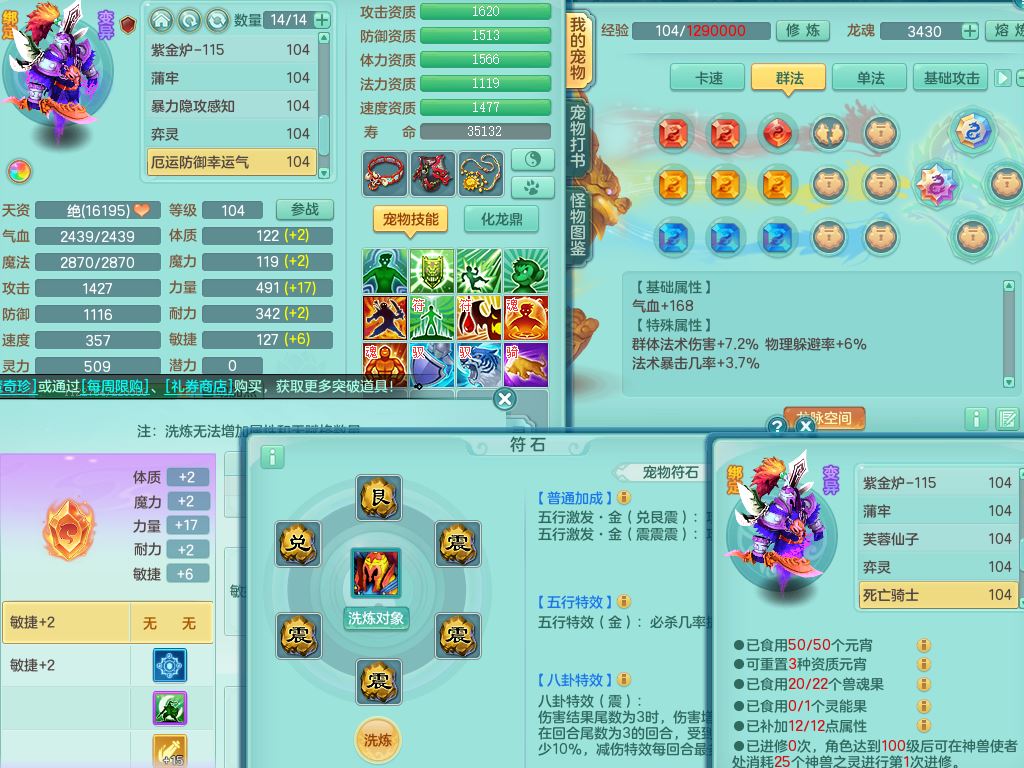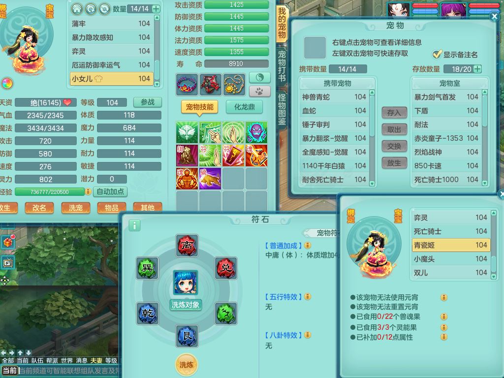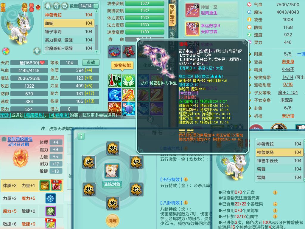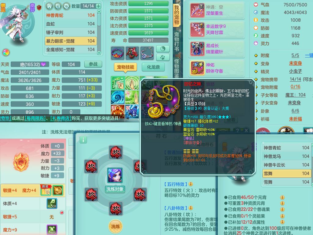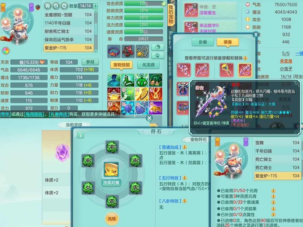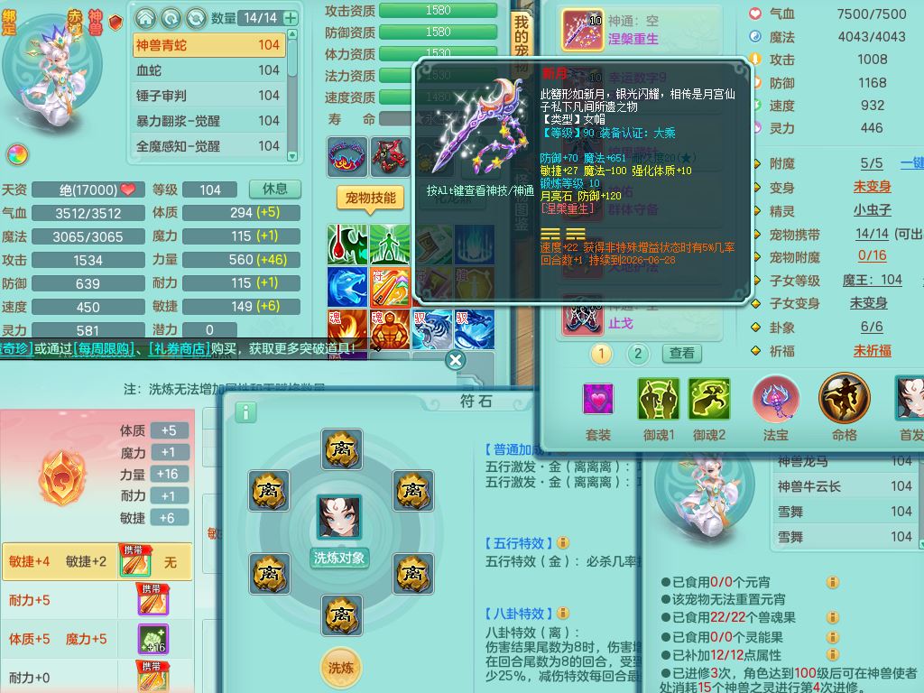 tx10011天下无双99女盘丝双系精灵,3内丹神(1青蛇1龙马)1破境,17只满果子5觉醒5个纯6字,10红愤怒6特,幸运四海武器,Y笑里衣服,神佑群体守备,愤怒罗汉腰带,物理551单加狂暴武器,崩山衣服,Y破血头,破甲鞋,鼎3.0+42+168,2套符石,31天月卡,庭院154房屋191,永久外观精灵皮肤,45内丹碎片,飞行双人坐骑