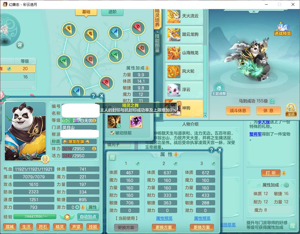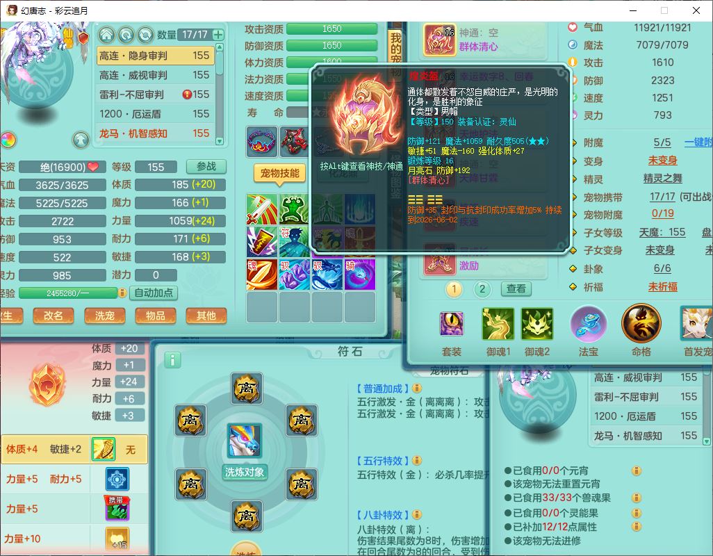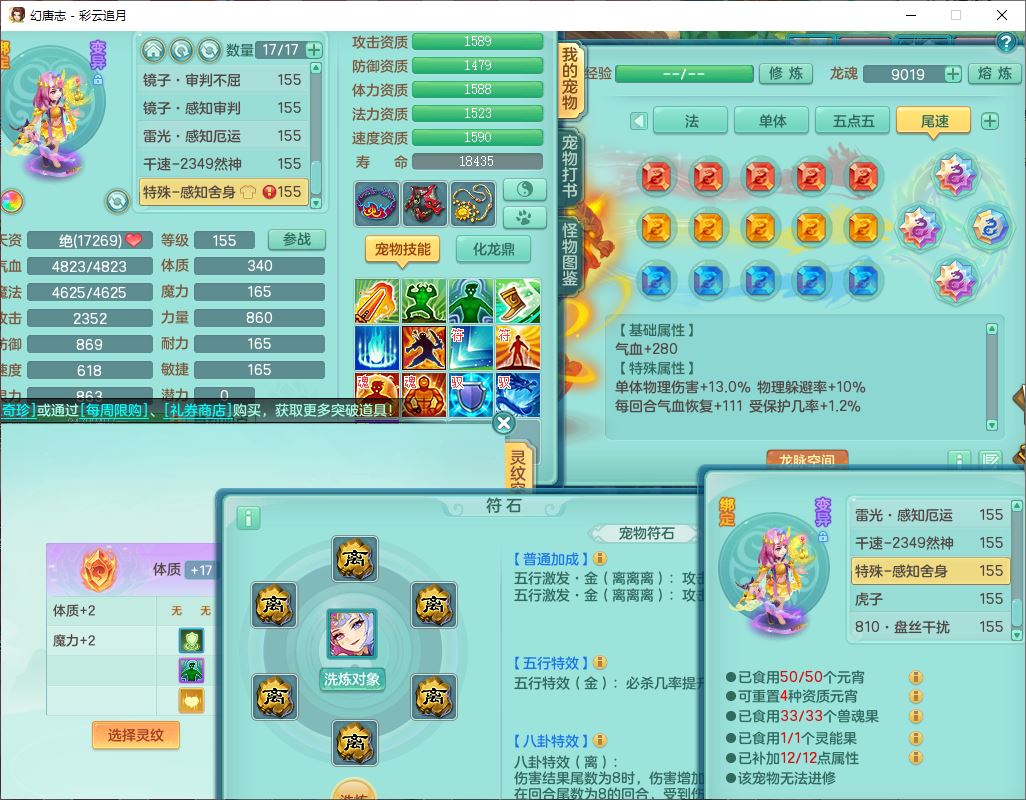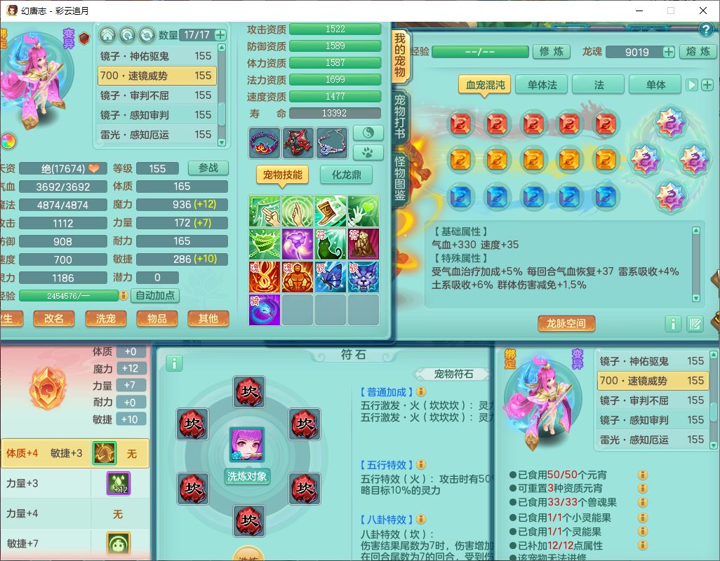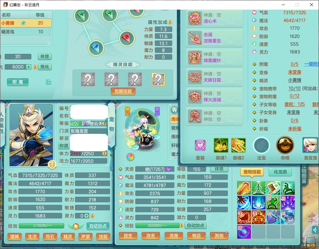 cy10035彩云追月159男灵月【潜龙+马到成功+暴龙逍客】精灵舞,8位靓号,4龙(换、1破境)2内(1龙马)1望归4镜花6特殊(夺命、雷光、舍身,堕天、以战、墨守兽决)1金炉,8觉醒3宠皮11六字1五字5四字21只满果子,9红装备,幸运回春武器,愤怒疾速腰带,Y激励鞋子,有物理装,狂暴四海武器,Y腰带,Y帽子,神佑项链,鼎5.5+70+280,2套符石,119天月卡,永久外观、精灵皮肤,15个内丹碎片,93个兽魂果,8坐骑(2双人飞行),带3个150奶粉