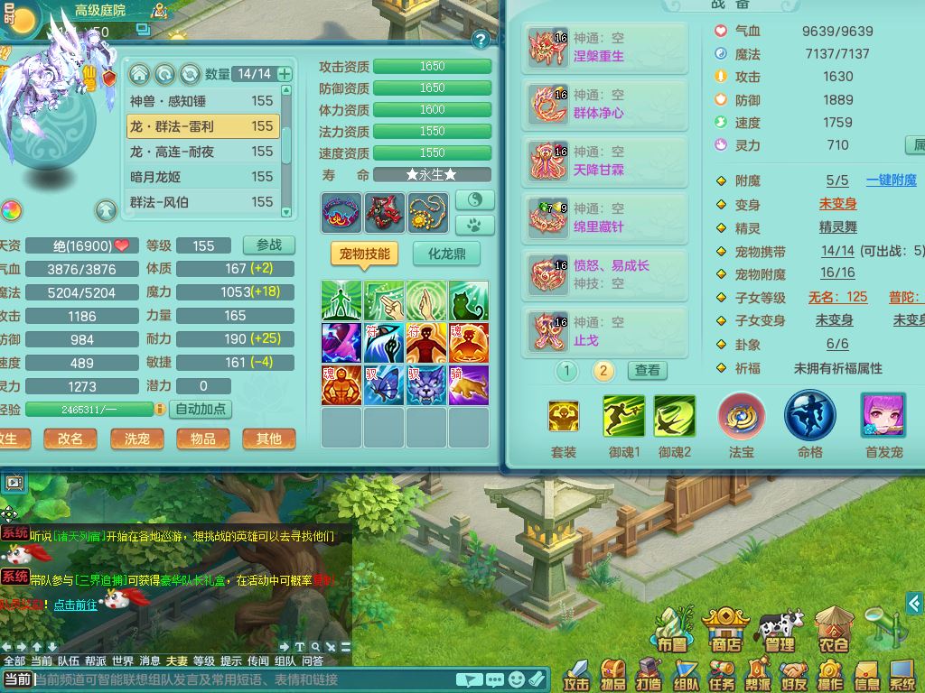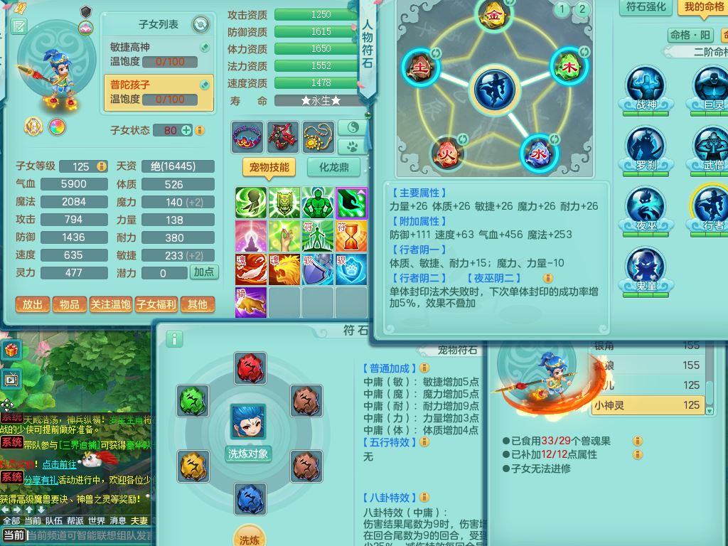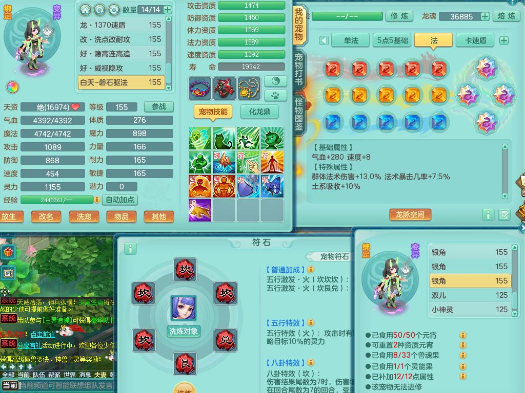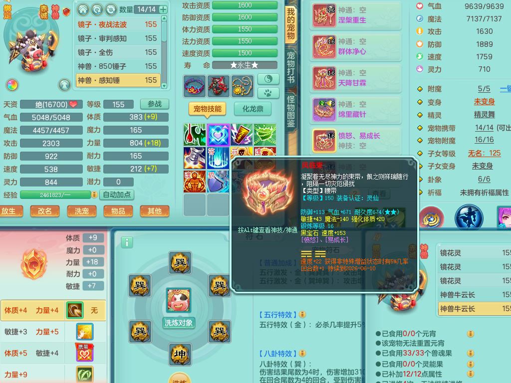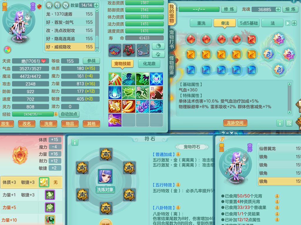 jn10079今年勇159女天魔【潜龙号】精灵舞,2内丹龙1龙(换,无内)3内(1青蛇)特殊(墨守)4镜花灵1龙姬,18只满果子9觉醒7个纯6字,愤怒5特,单加愤怒Y腰带,鼎5.5+70+280,永久外观精灵皮肤,823W神武币,宠排在榜,3坐骑(1只双人)