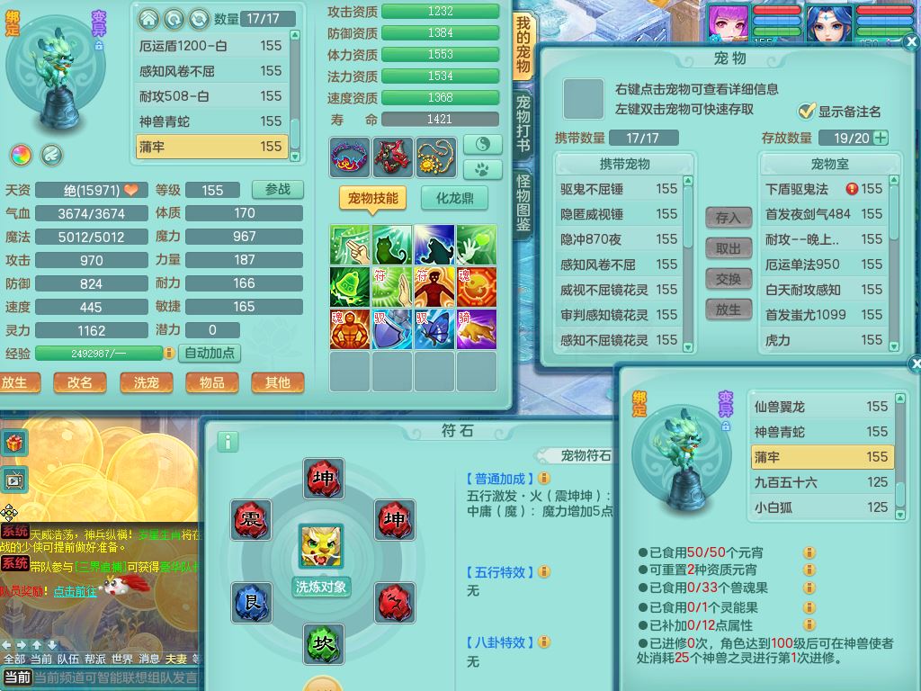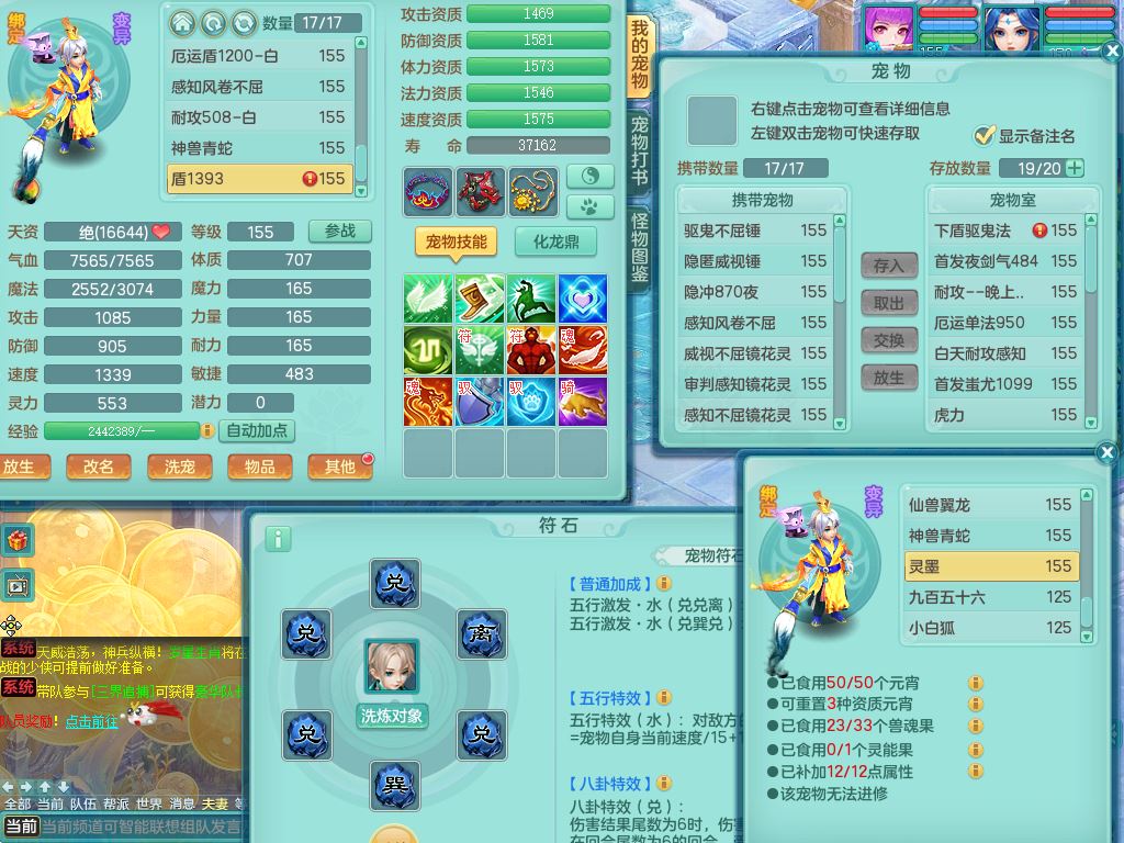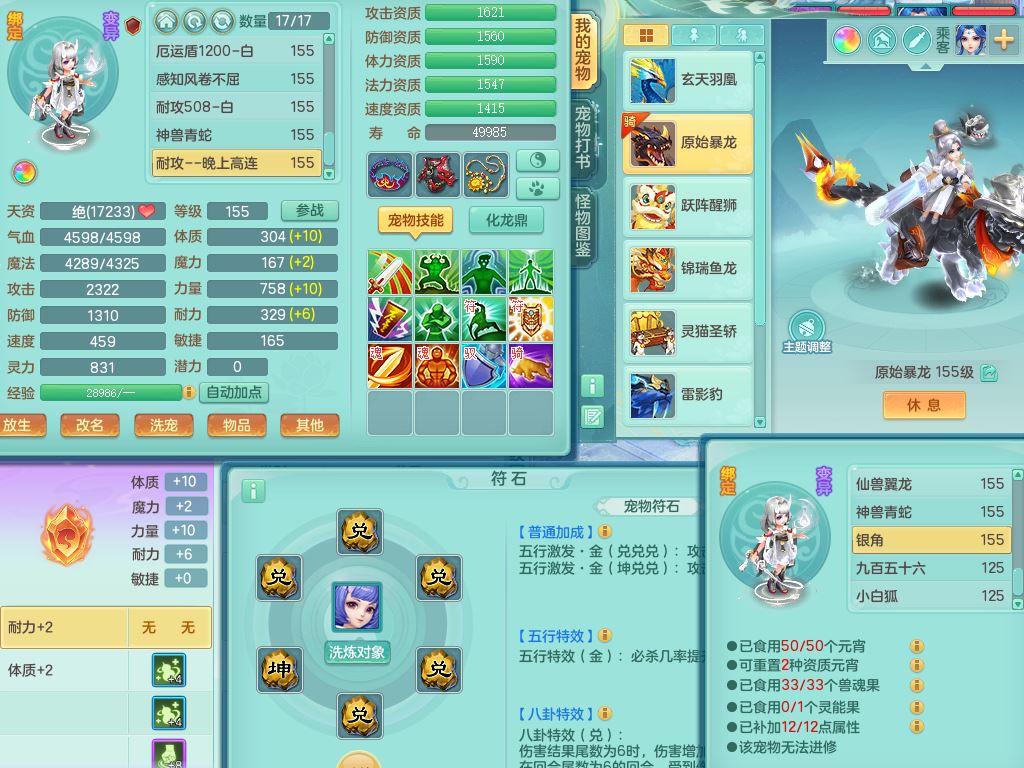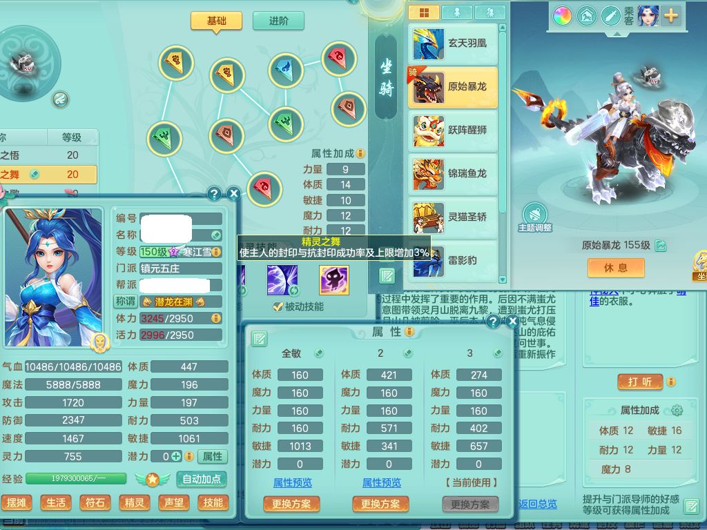 lt10080龙腾九州159女五庄【潜龙号+暴龙逍客+西瓜冰】精灵歌+舞+悟,2套星穹,3内丹龙(换)3内丹神9皮,4特殊(风卷/雷厉/烈焰/琴音兽决)6镜花灵1龙姬,17格子27只满果子17觉醒14个纯6字,11红,愤怒6特,Y晶清头,Y慈航武器,愤怒Y3红腰带,Y野兽鞋,法系星辰之拥,法爆慈航武器,法缭水清鞋,274单加Y项链,鼎6.0+70+280,冰晶庭院233房屋173,永久外观精灵皮肤,900W神武币,宠排在榜,7坐骑(5只双人)