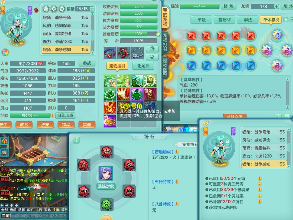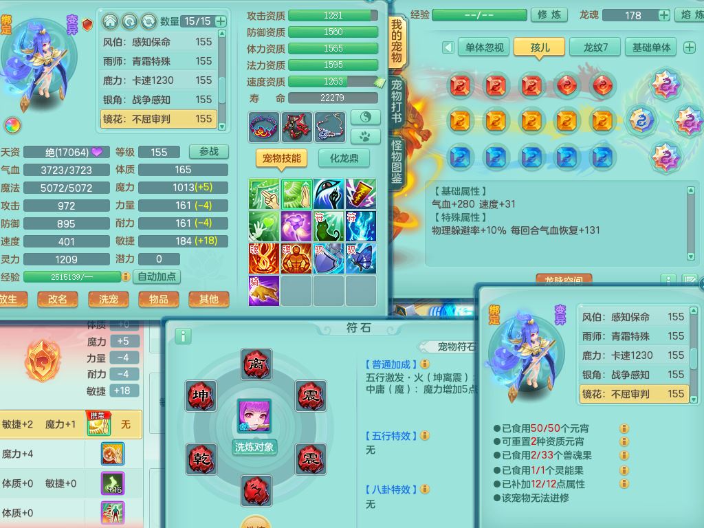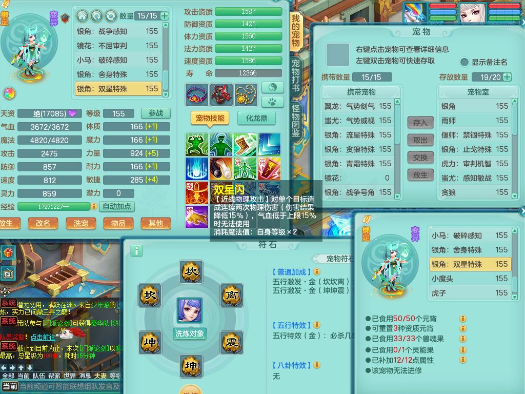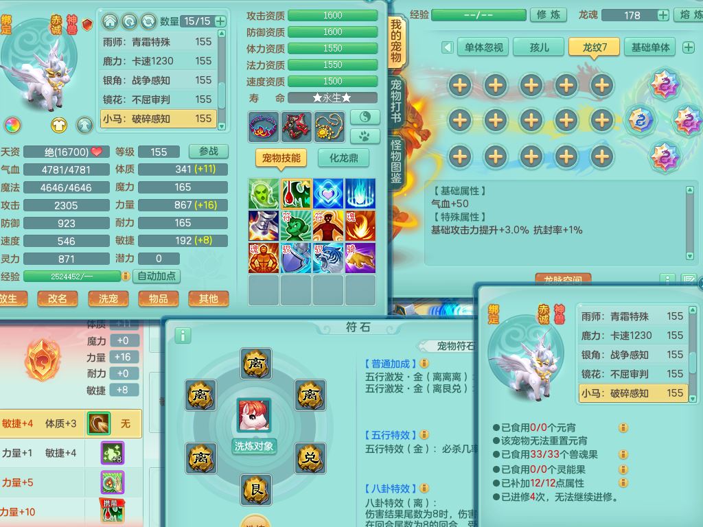 jx10117锦绣河山159双开号,万兽【准潜龙,只差1条符石,1条附加,混沌龙纹】精灵歌,1内丹龙(破境)2内丹神4皮,10特殊(流星/噬风/青霜*2/号角*2/舍身/双星/以战/禁锢兽决)综合17只满果子14觉醒8个纯6字,8红,928单加连击四海武器,以战衣服,幸运坚毅项链,崩山鞋,鼎3.0+70+280,76天月卡,庭院161房屋164,永久外观精灵皮肤,双人坐骑,地府【准潜龙,只差1宝宝2条附加,4颗血石头】精灵歌,1内丹青蛇(破境)1皮5特殊(虎虎/双星/怒破/号角/以战)3镜花灵1龙姬,综合9只满果子12觉醒,8红震怒6特,鼎5.5+70,33仙兽灵,双人坐骑
