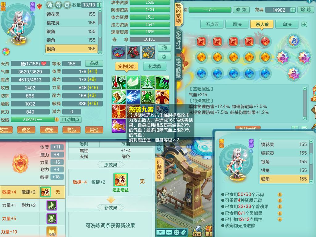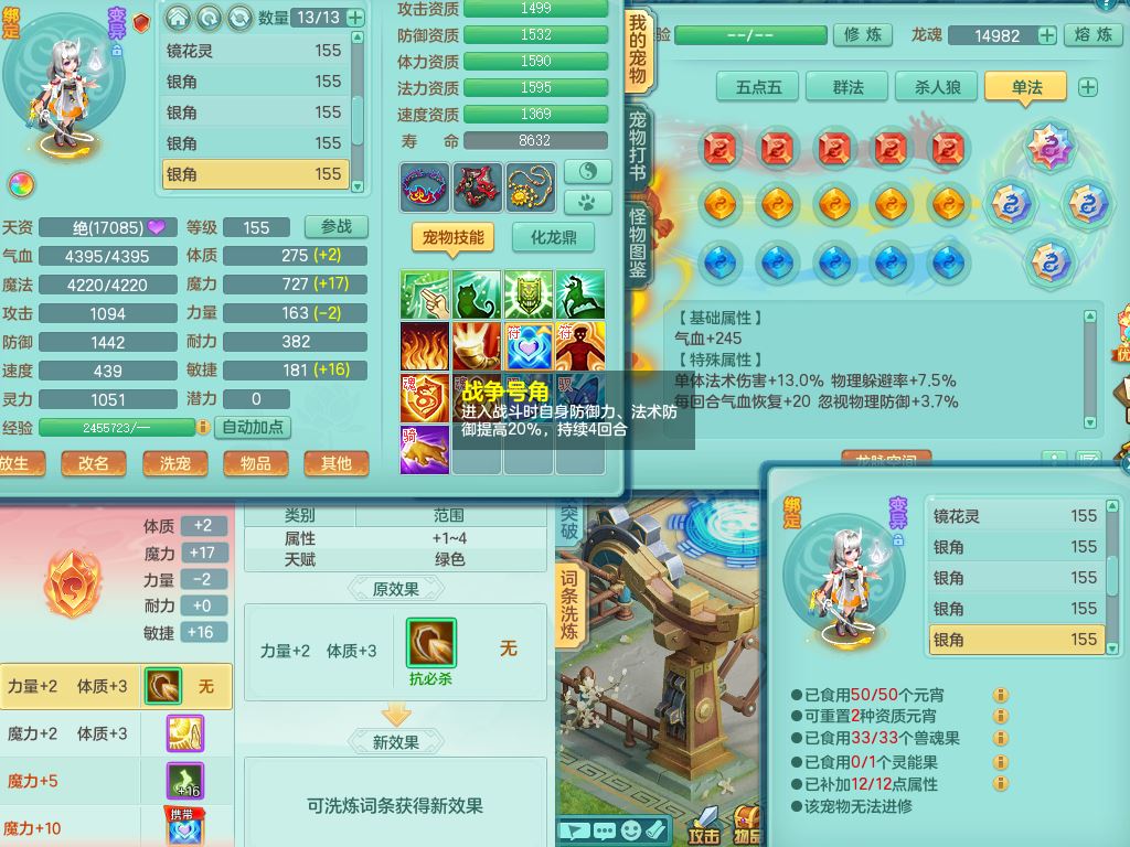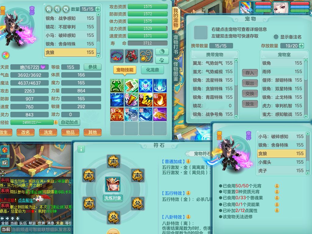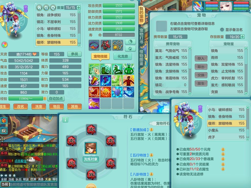 jx10117锦绣河山159双开号,万兽【准潜龙,只差1条符石,1条附加,混沌龙纹】精灵歌,1内丹龙(破境)2内丹神4皮,10特殊(流星/噬风/青霜*2/号角*2/舍身/双星/以战/禁锢兽决)综合17只满果子14觉醒8个纯6字,8红,928单加连击四海武器,以战衣服,幸运坚毅项链,崩山鞋,鼎3.0+70+280,76天月卡,庭院161房屋164,永久外观精灵皮肤,双人坐骑,地府【准潜龙,只差1宝宝2条附加,4颗血石头】精灵歌,1内丹青蛇(破境)1皮5特殊(虎虎/双星/怒破/号角/以战)3镜花灵1龙姬,综合9只满果子12觉醒,8红震怒6特,鼎5.5+70,33仙兽灵,双人坐骑