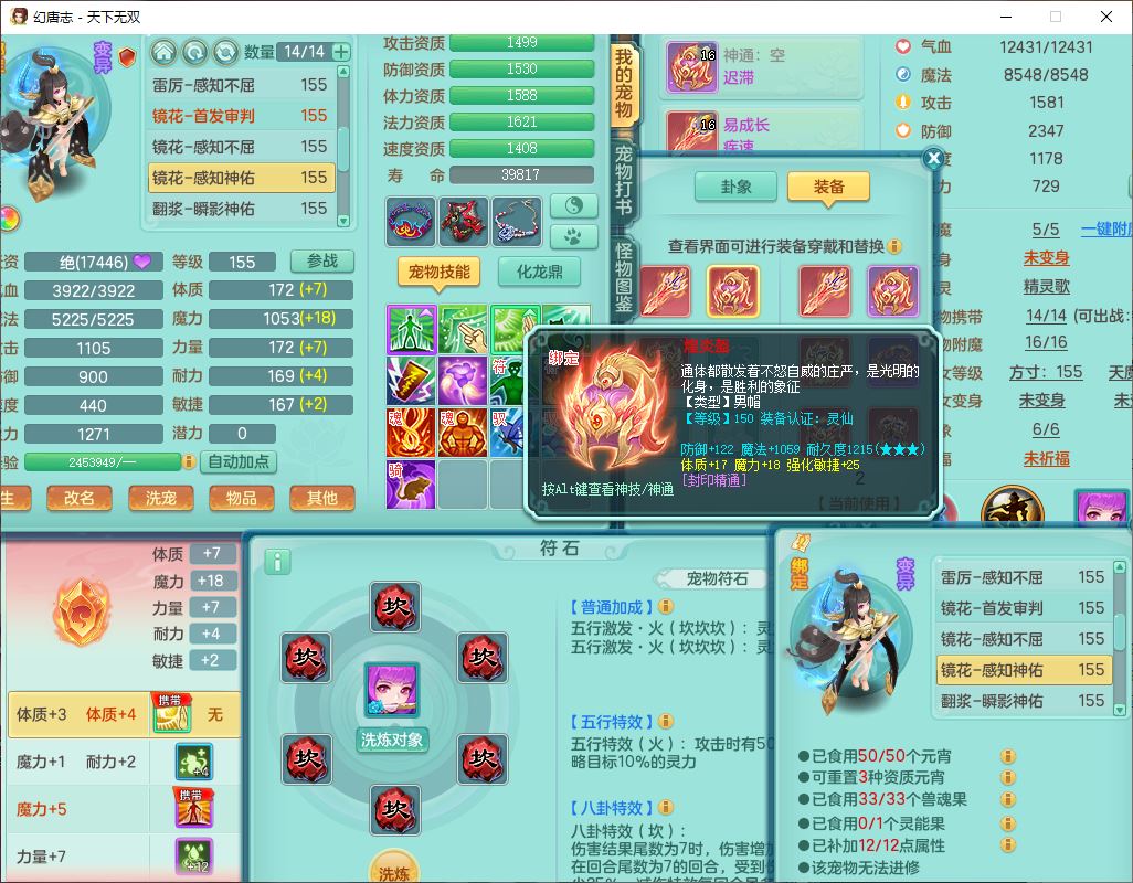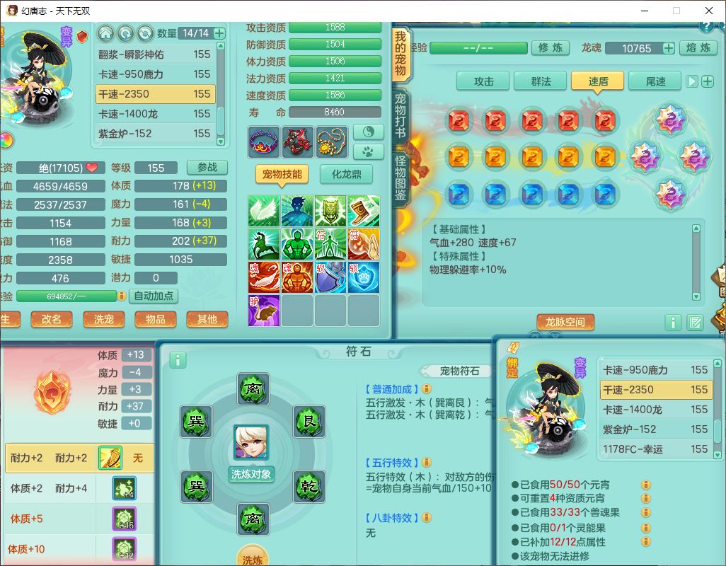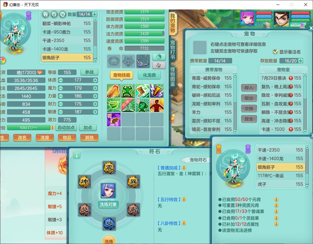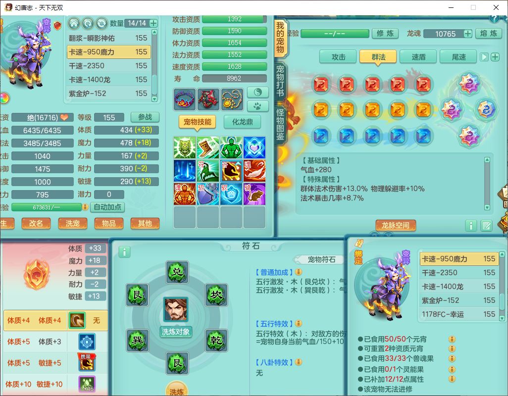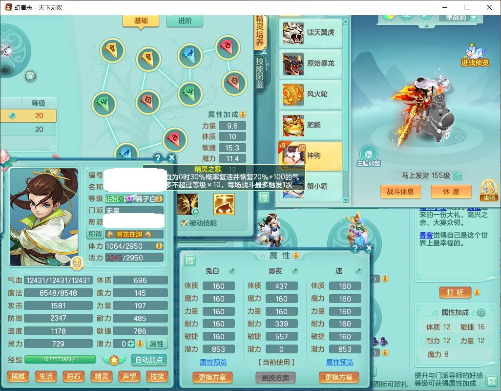tx10124天下无双159男无量【潜龙+马上发财+暴龙猎手+火焰之力+西瓜冰】精灵歌,1龙无内1内丹青蛇3镜花1望归1龙姬1金炉5特殊(青霜、雷利、翻江,羽袭、破碎兽决),17觉醒1宠皮11六字2五字3四字综合22只满果子,7红装备,Y疾速武器,仓库多装备,回春法术反制武器,封锁武器,封印精通帽子,鼎6.0+70+280,164天月卡,庭院157,永久外观、精灵皮肤,5坐骑(1双人飞行)