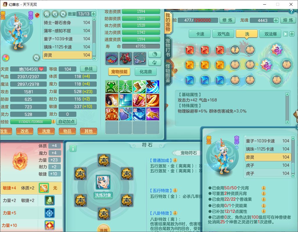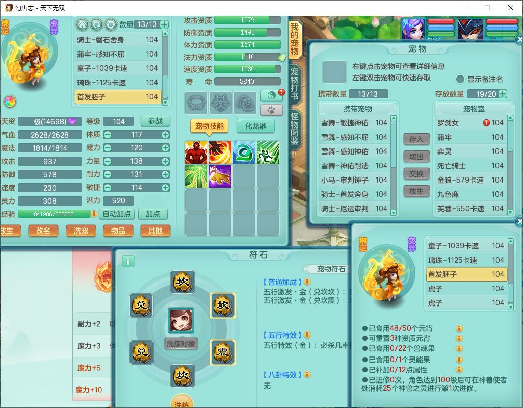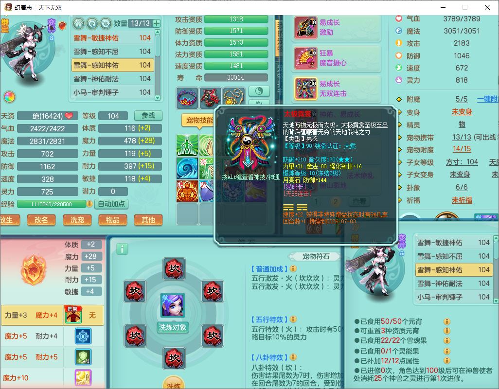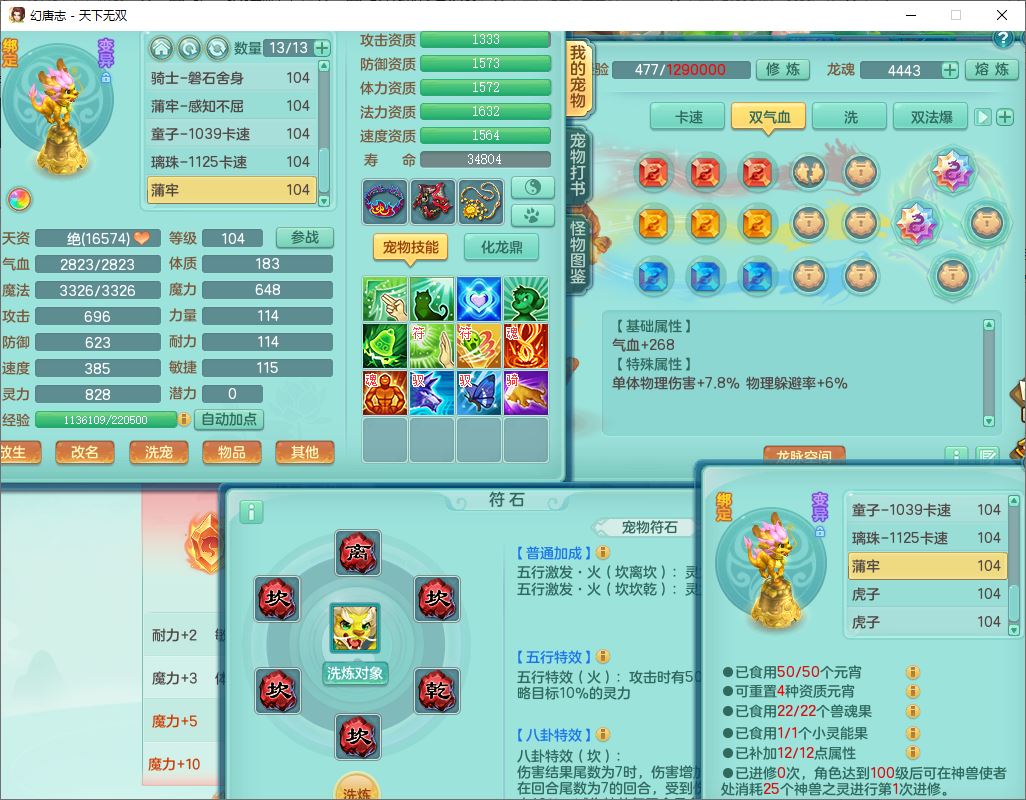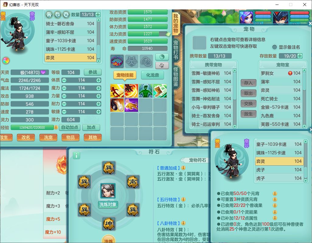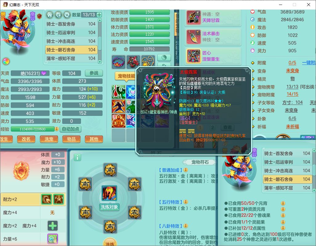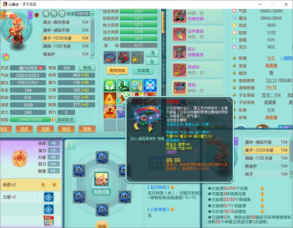 tx10146天下无双99男万兽【准潜龙号,差1只宝宝3条小附加】力敏、体敏、全魔精灵,1内丹龙马4翻江5舍身1童子1金炉,11觉醒8六字2五字9四字24只满果子,12红装备,Y激励帽子,狂暴魔音武器,Y破血衣服,神佑Y项链,Y法缭崩山鞋子,一套法系装备,法爆武器,匠心慈航衣服,162单加Y项链,五雷鞋子,鼎2.5+42+168,3套符石,永久外观、精灵皮肤,20个仙兽灵,48个内丹碎片,3坐骑(1双人飞行),带150奶粉
