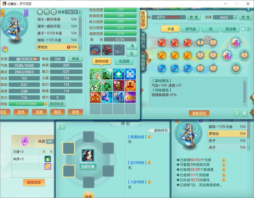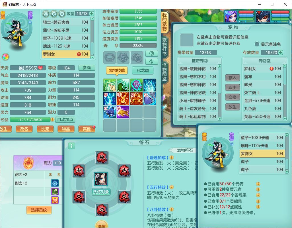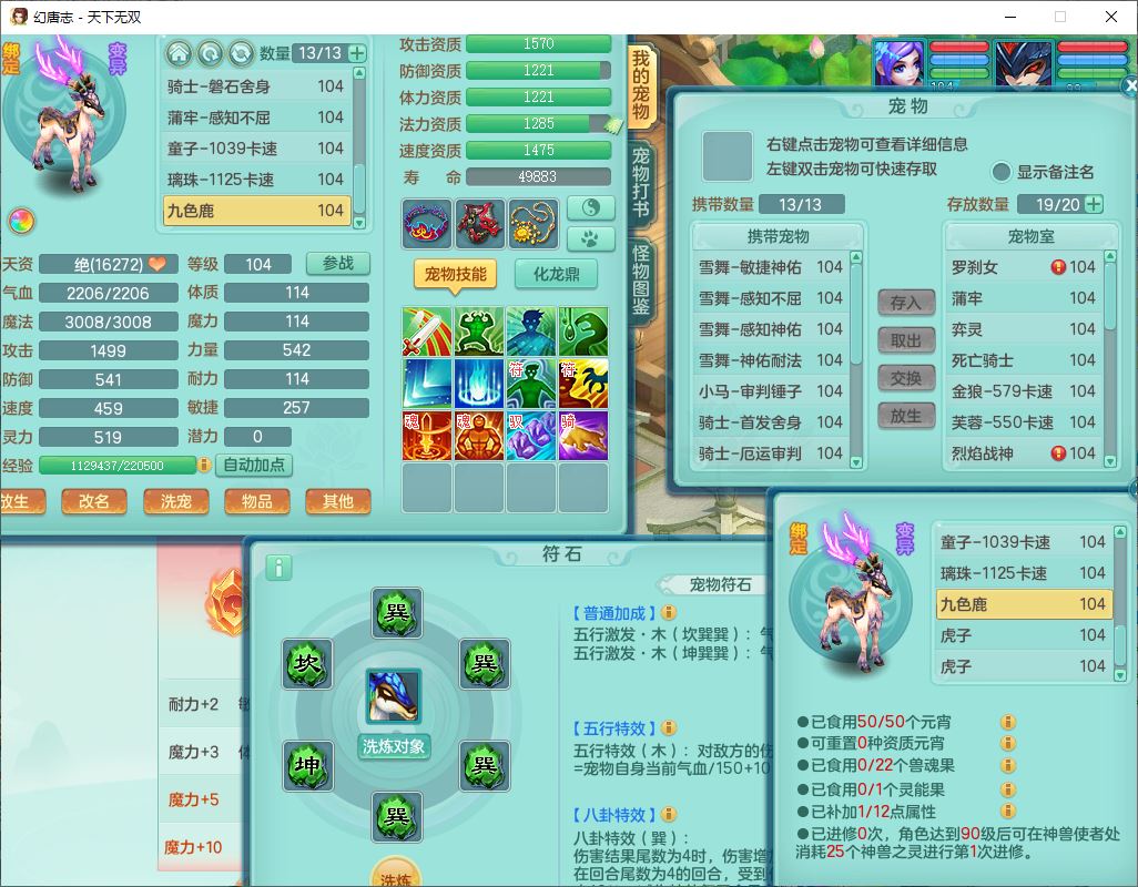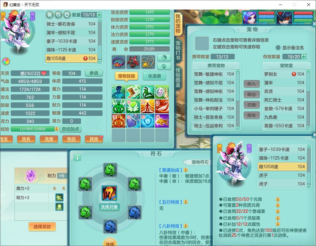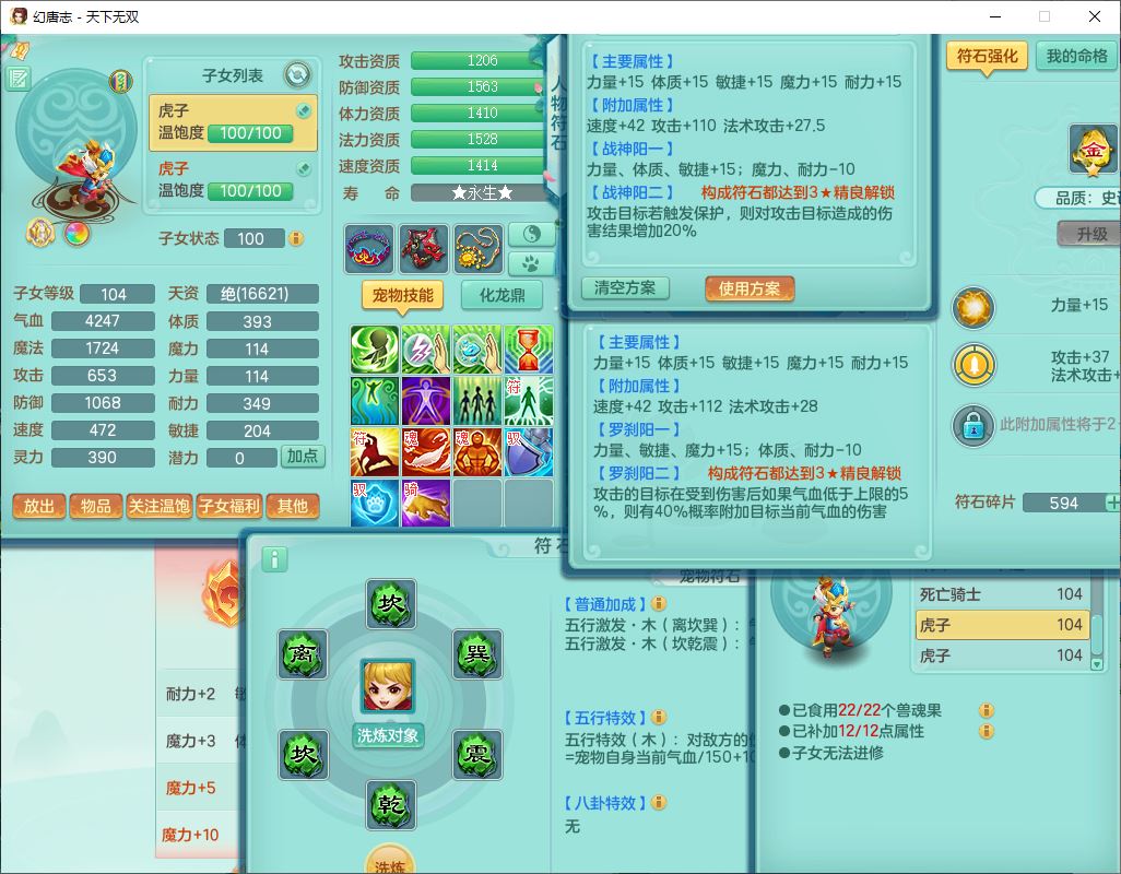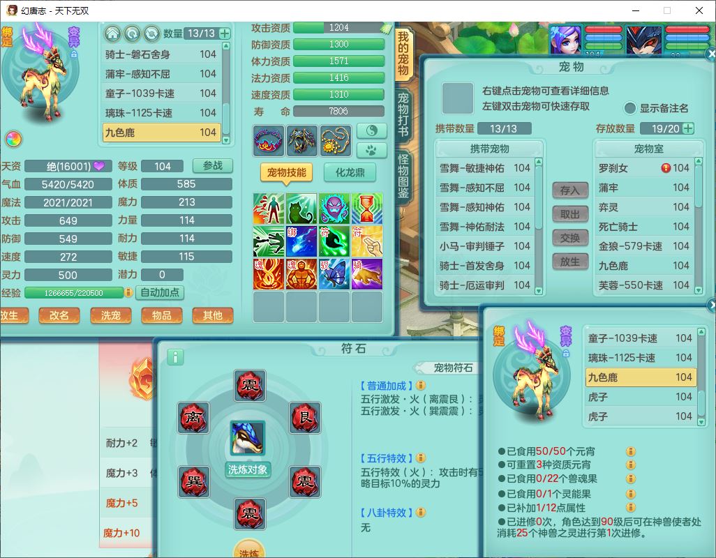 tx10146天下无双99男万兽【准潜龙号,差1只宝宝3条小附加】力敏、体敏、全魔精灵,1内丹龙马4翻江5舍身1童子1金炉,11觉醒8六字2五字9四字24只满果子,12红装备,Y激励帽子,狂暴魔音武器,Y破血衣服,神佑Y项链,Y法缭崩山鞋子,一套法系装备,法爆武器,匠心慈航衣服,162单加Y项链,五雷鞋子,鼎2.5+42+168,3套符石,永久外观、精灵皮肤,20个仙兽灵,48个内丹碎片,3坐骑(1双人飞行),带150奶粉