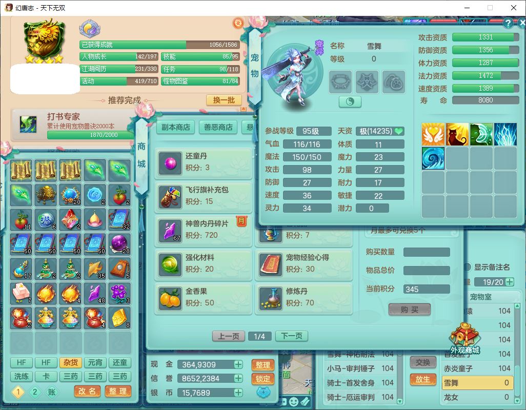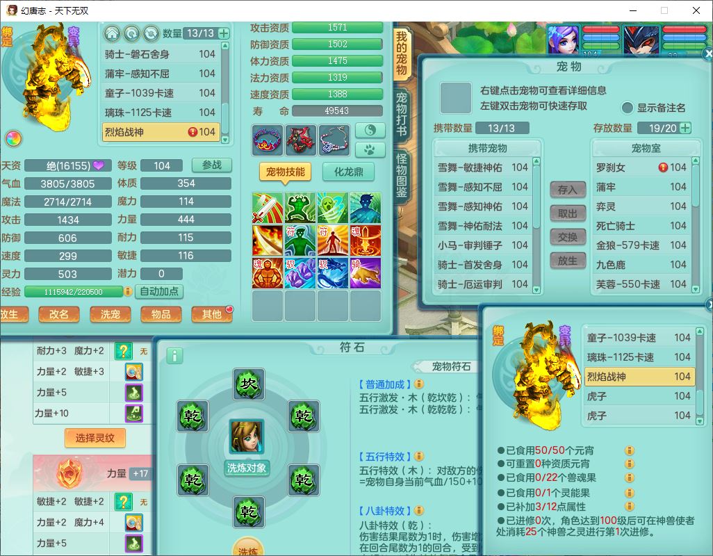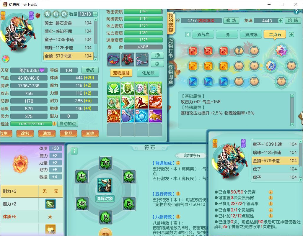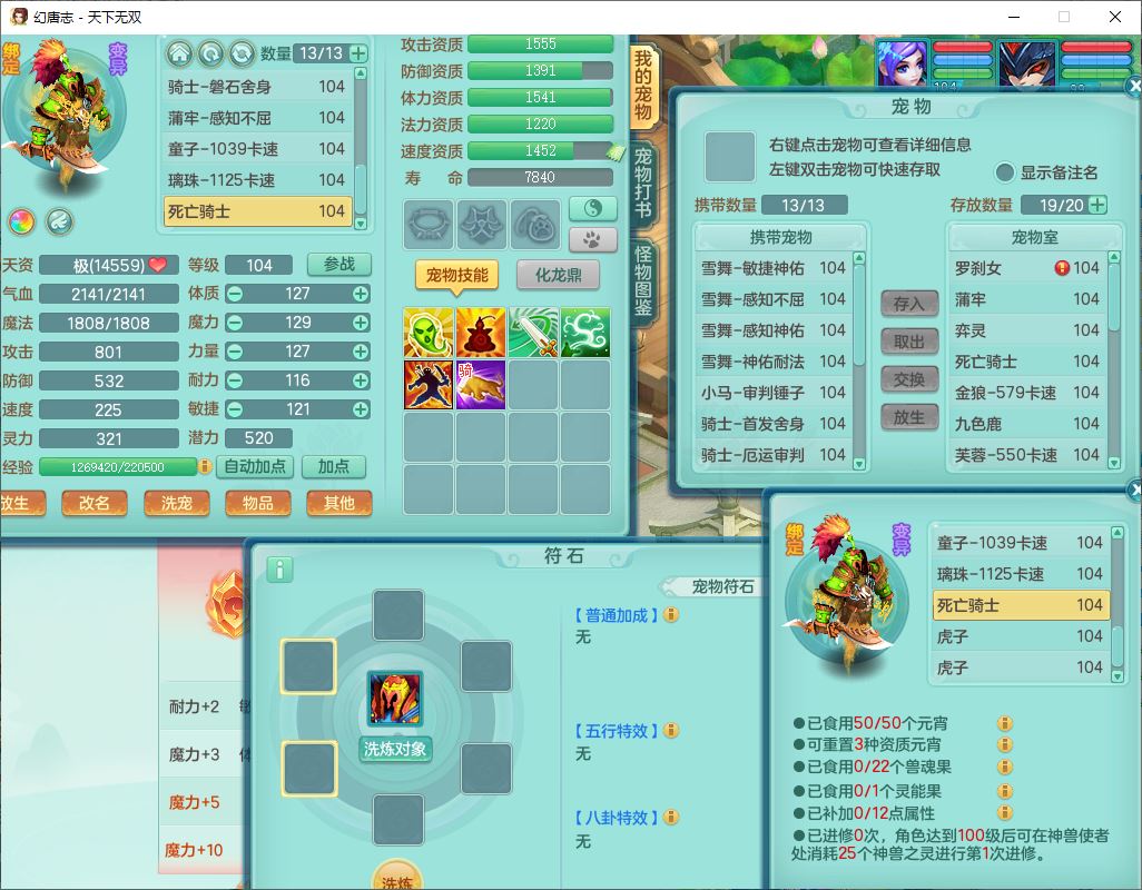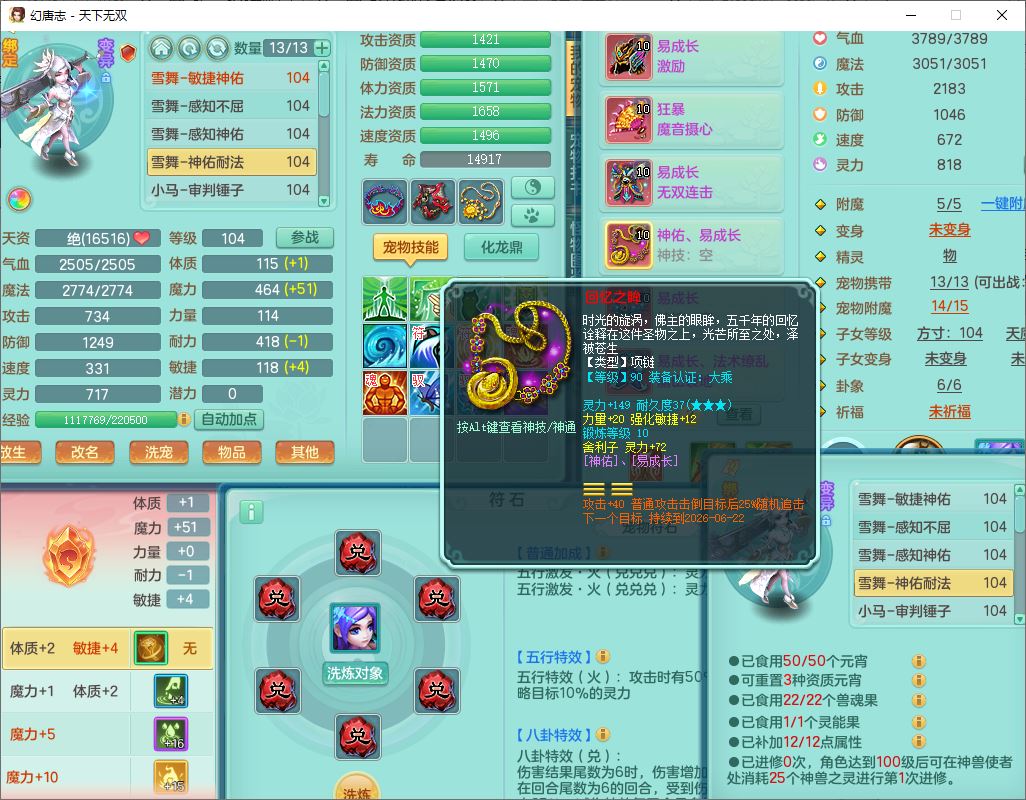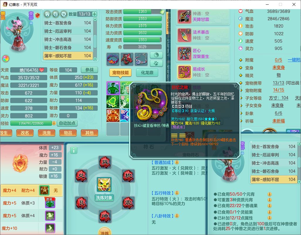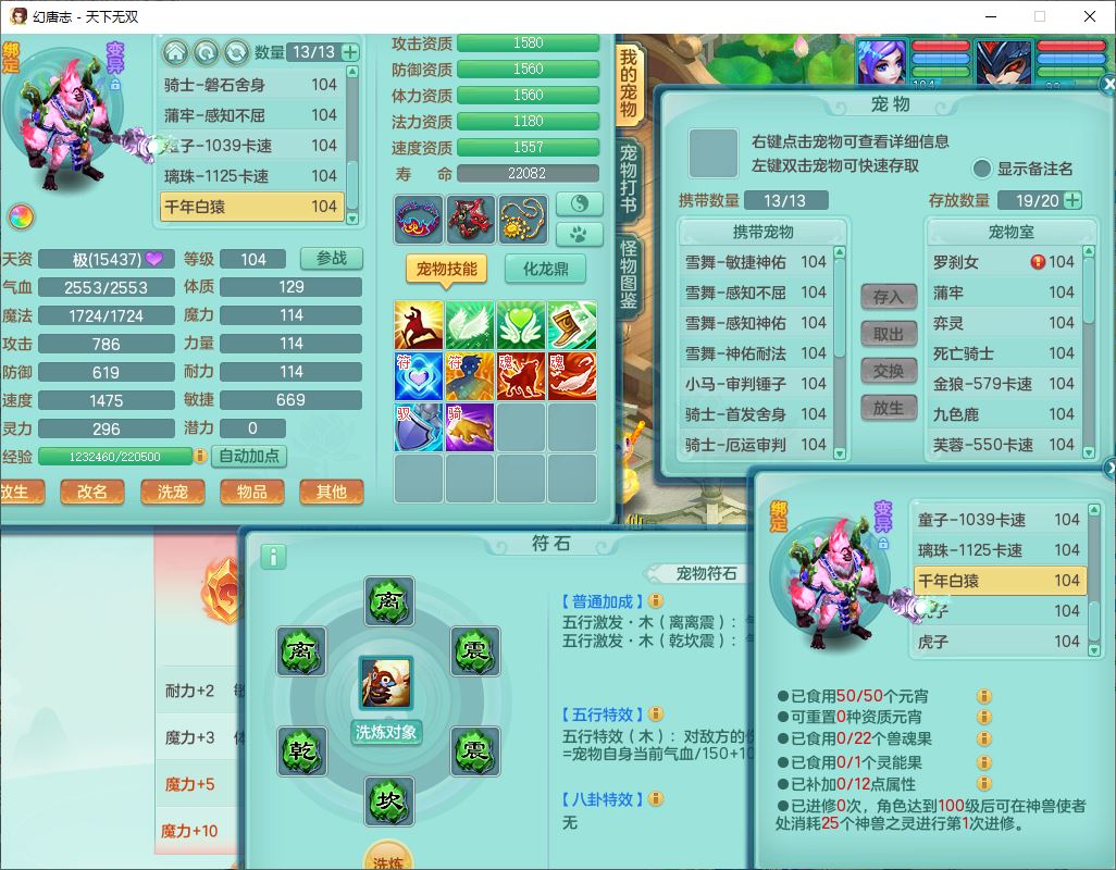 tx10146天下无双99男万兽【准潜龙号,差1只宝宝3条小附加】力敏、体敏、全魔精灵,1内丹龙马4翻江5舍身1童子1金炉,11觉醒8六字2五字9四字24只满果子,12红装备,Y激励帽子,狂暴魔音武器,Y破血衣服,神佑Y项链,Y法缭崩山鞋子,一套法系装备,法爆武器,匠心慈航衣服,162单加Y项链,五雷鞋子,鼎2.5+42+168,3套符石,永久外观、精灵皮肤,20个仙兽灵,48个内丹碎片,3坐骑(1双人飞行),带150奶粉