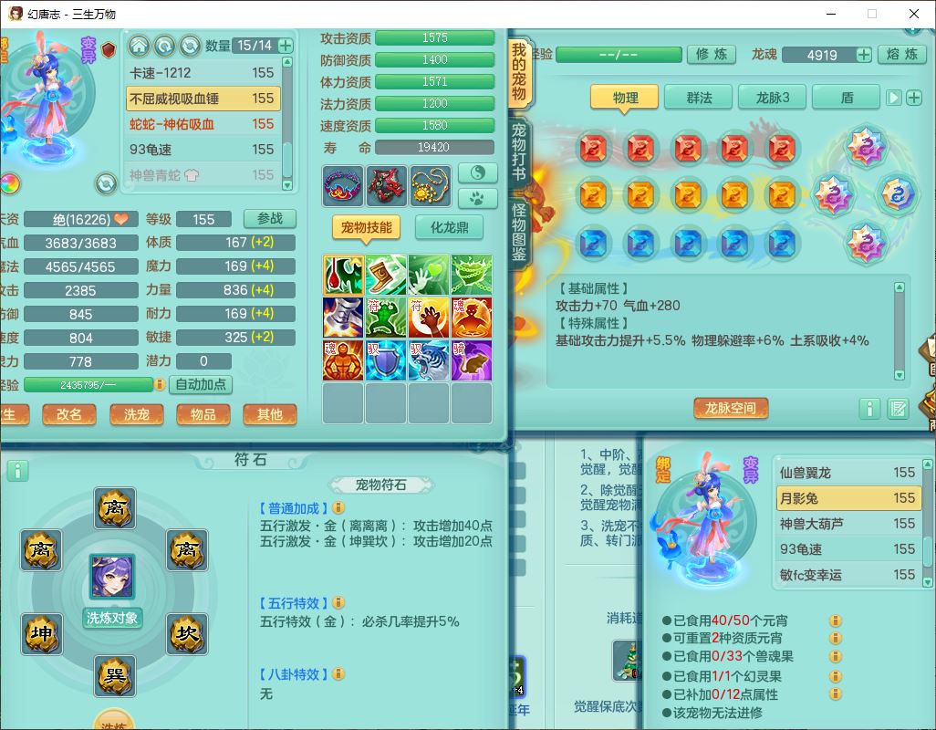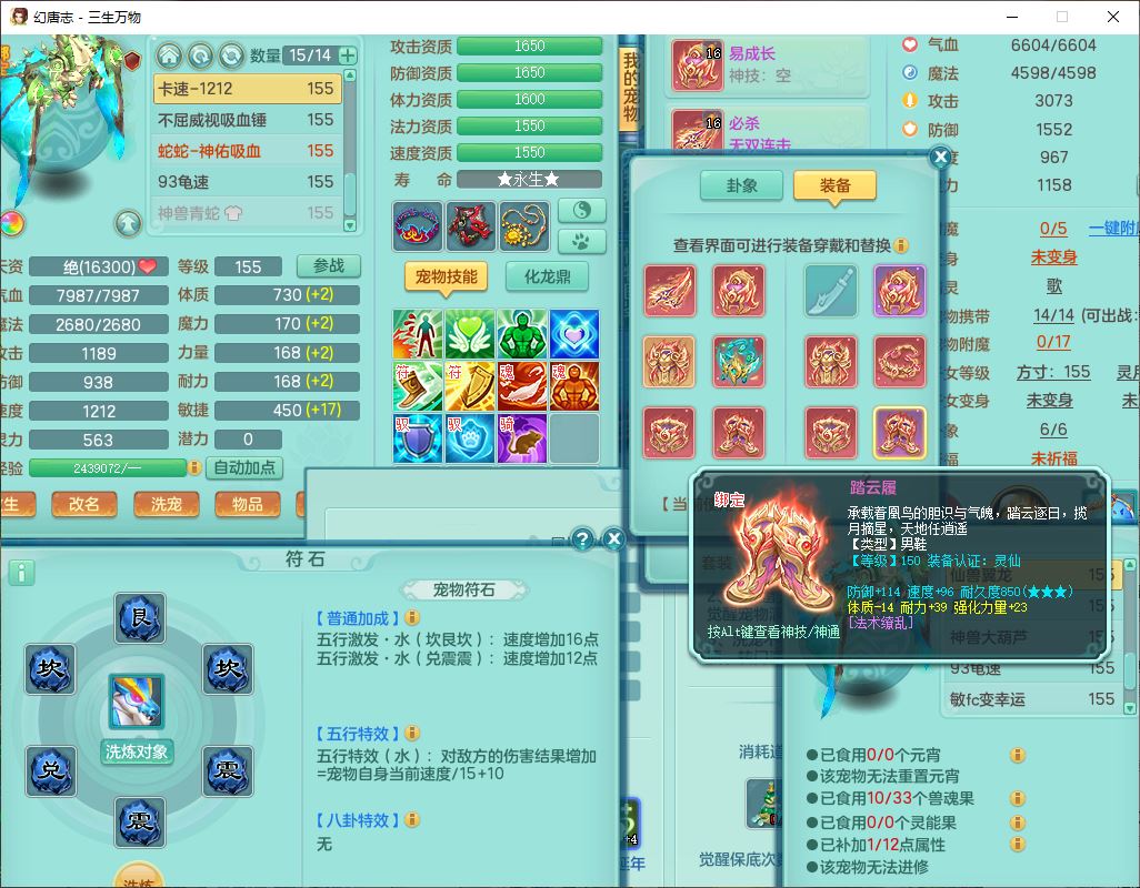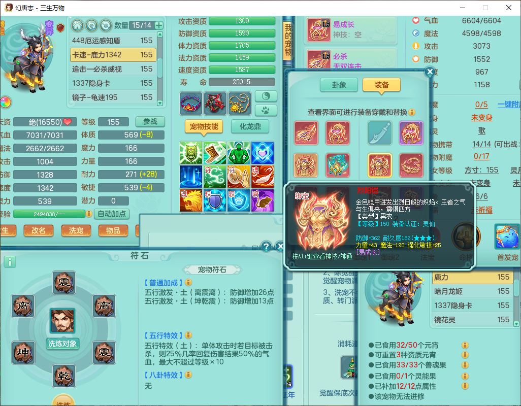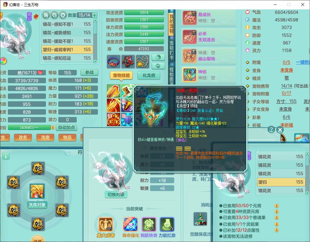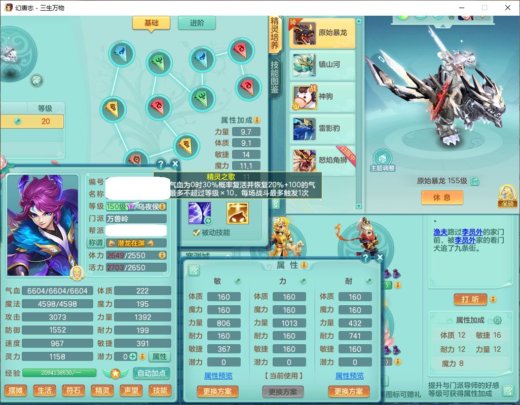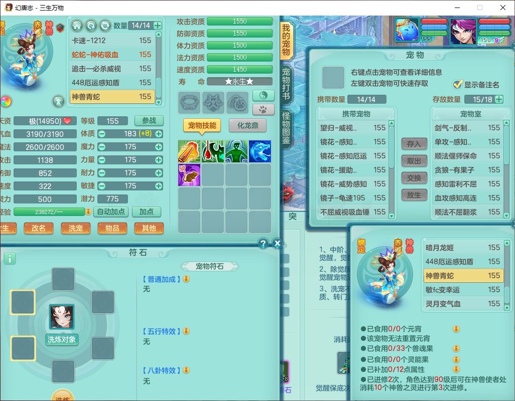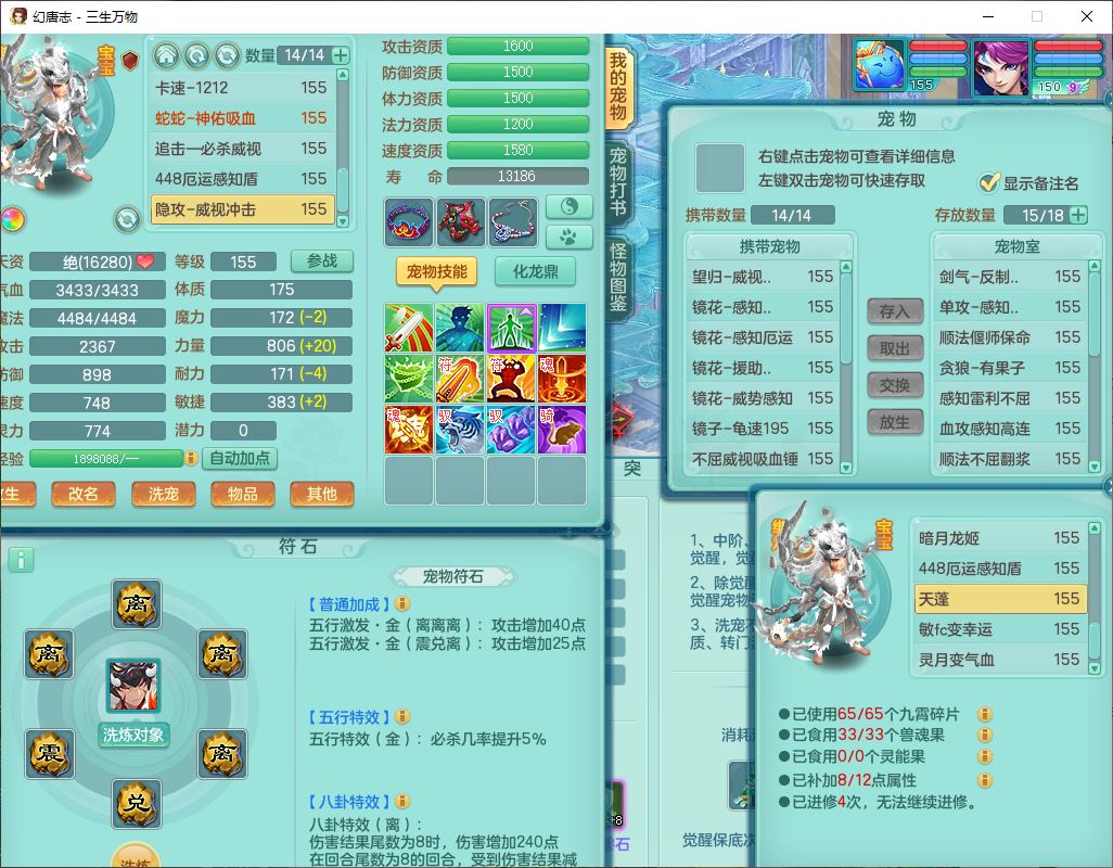 ss10148三生万物159男万兽【暴龙泰坦+马上发财+火焰之力+西瓜冰+潜龙号】精灵歌,1龙(换、无内)2神兽(1青蛇,1无内、带蛇影)1望归5镜花1龙姬,9觉醒3宠皮7六字4四字综合12只满果子,7红装备,必杀破血武器,崩山衣服,有法系装,五雷帽子,260Y项链,法缭鞋子,鼎5.5+70+280,冰晶庭院166房屋174,永久外观、精灵皮肤,103W神武币,1神兽内丹,4坐骑