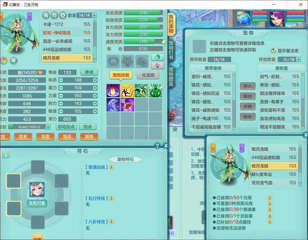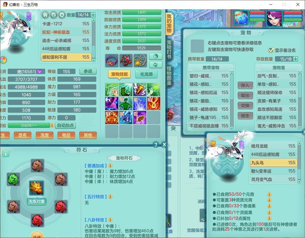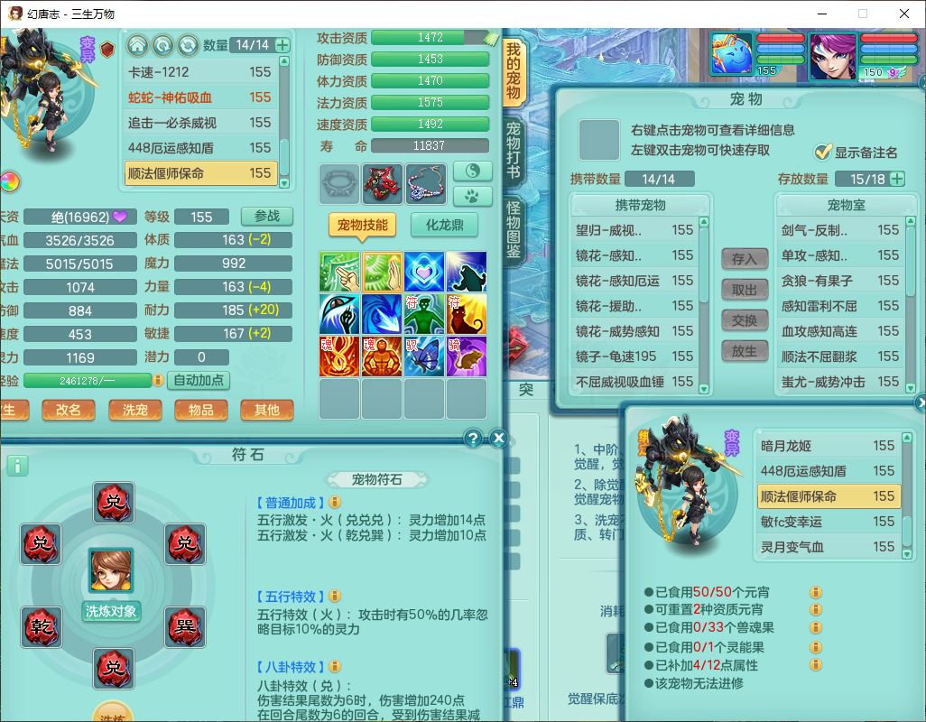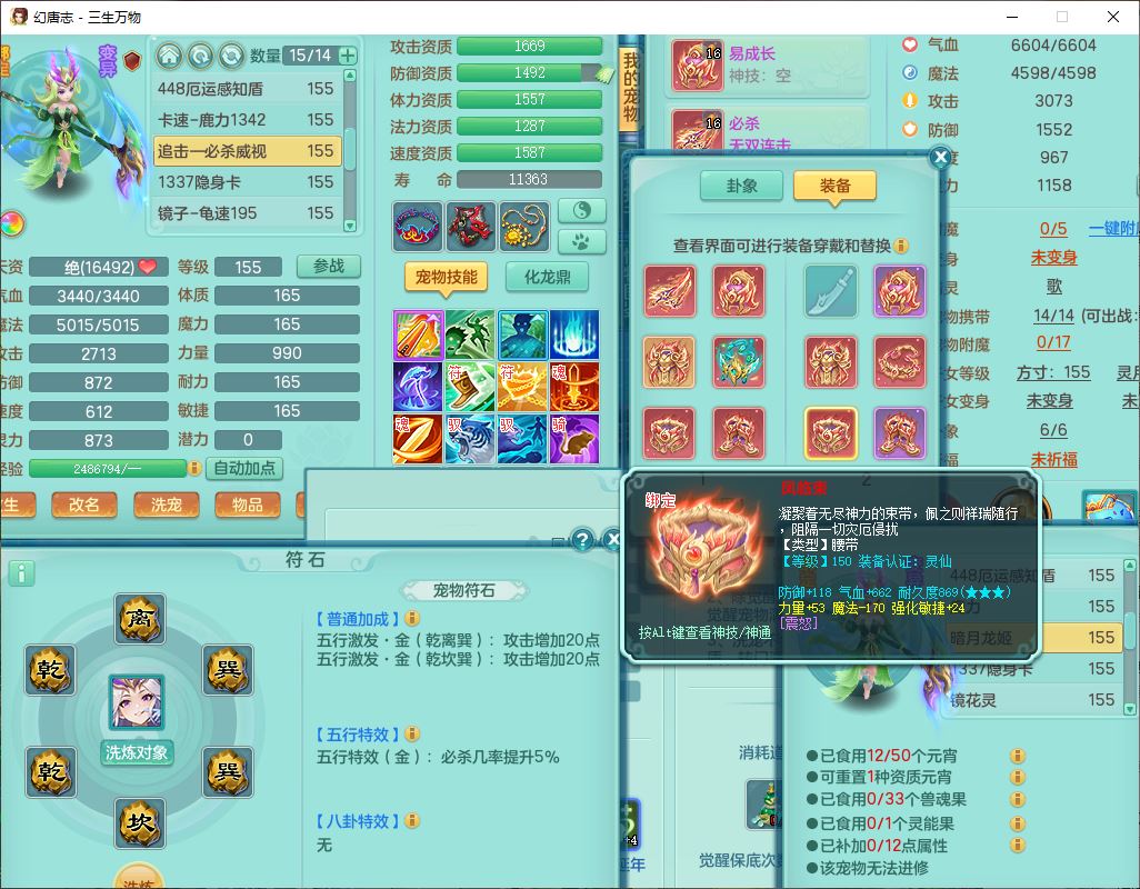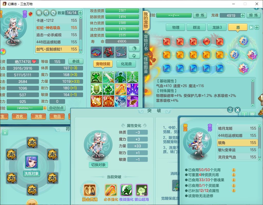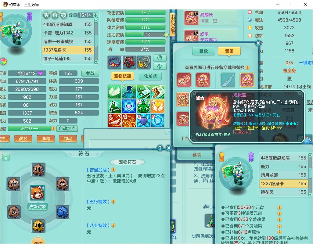 ss10148三生万物159男万兽【暴龙泰坦+马上发财+火焰之力+西瓜冰+潜龙号】精灵歌,1龙(换、无内)2神兽(1青蛇,1无内、带蛇影)1望归5镜花1龙姬,9觉醒3宠皮7六字4四字综合12只满果子,7红装备,必杀破血武器,崩山衣服,有法系装,五雷帽子,260Y项链,法缭鞋子,鼎5.5+70+280,冰晶庭院166房屋174,永久外观、精灵皮肤,103W神武币,1神兽内丹,4坐骑