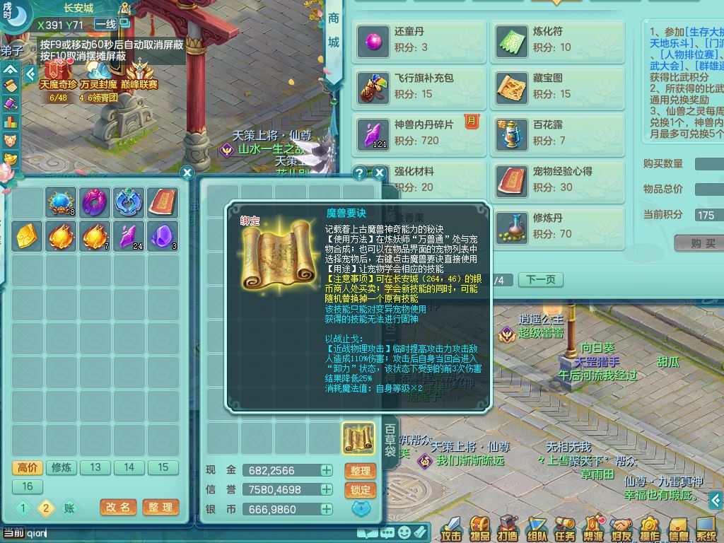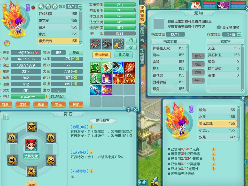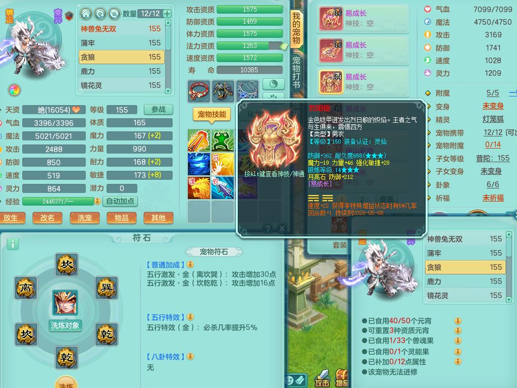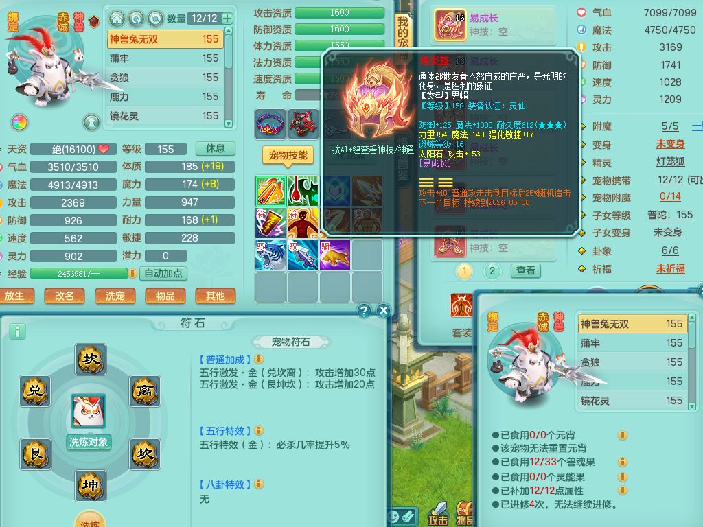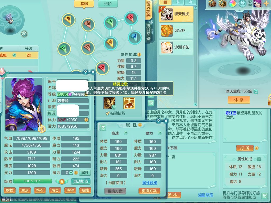 tx10157天下无双159男万兽精灵歌,1神兽(无内)特殊以战兽决,4个4字,全身单加,崩山腰带,其余全高属性单加Y,鼎4.5,永久头饰精灵皮肤,666W神武币,24内丹碎片,飞行双人坐骑