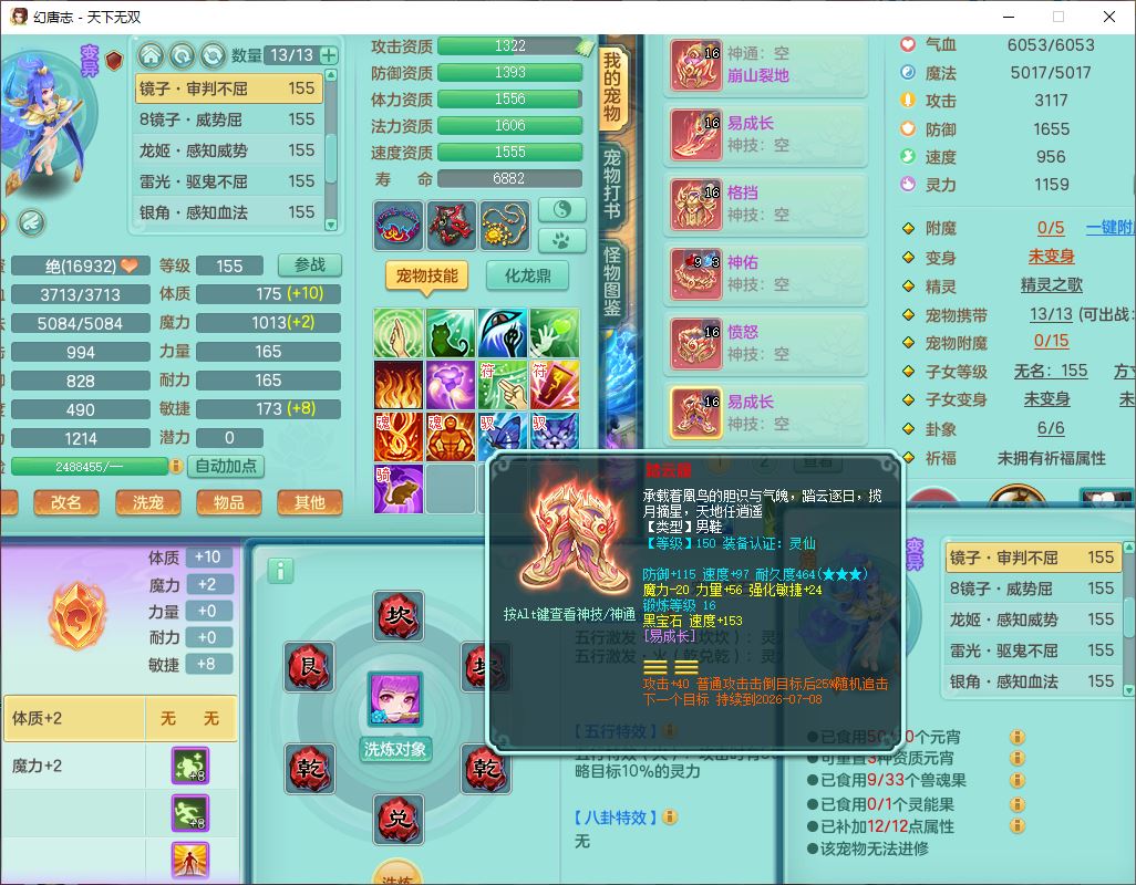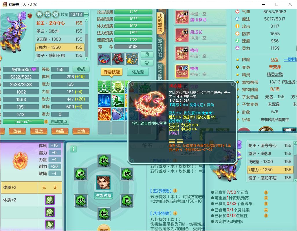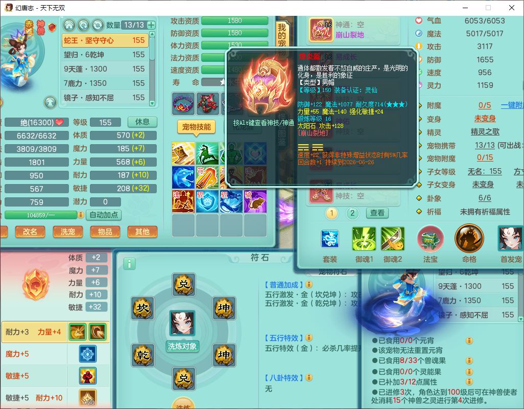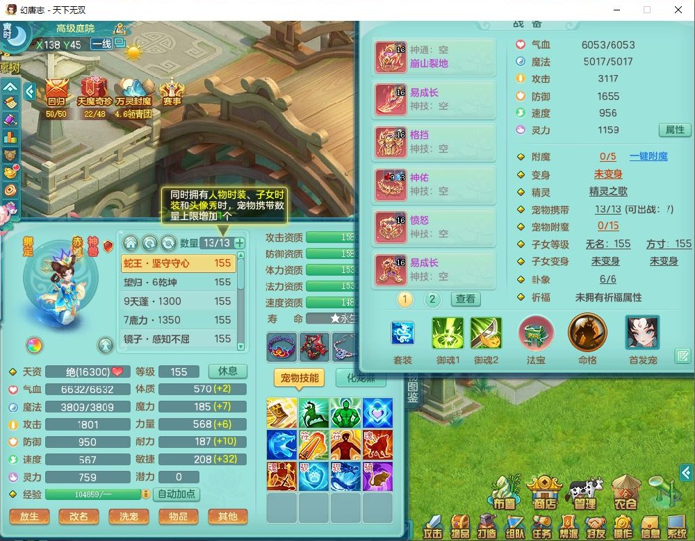 tx10199天下无双159男天宫精灵歌,4位靓号,1内丹青蛇1神兽(无内)1望归3镜花1龙姬1金炉1特殊(善恶),4觉醒1六字2五字7四字综合10只满果子,装备齐全,崩山帽子,930单加Y武器,格挡衣服,神佑项链,仓库法缭衣服,幸运慈航鞋子,鼎6.0+70+280,化龙鼎满足潜龙要求,56天月卡,31个仙兽灵,1双人飞行坐骑
