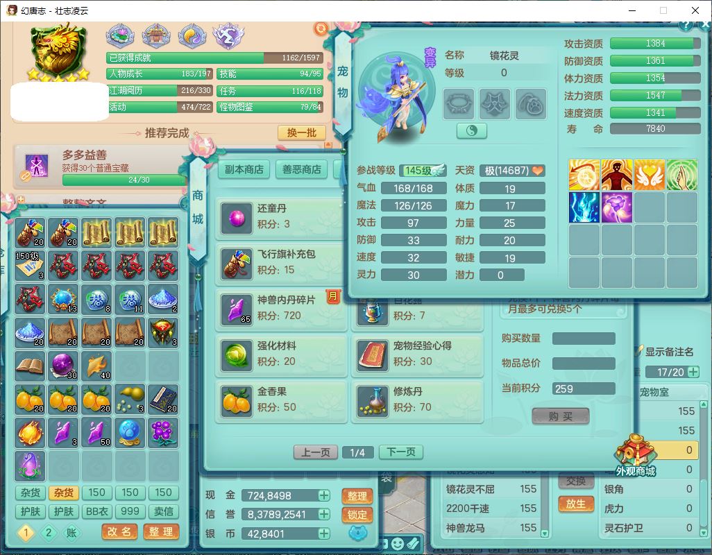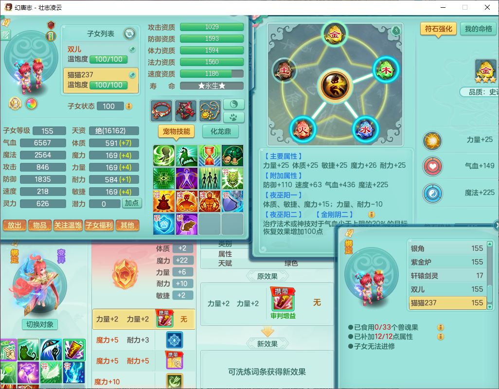 zz10206壮志凌云159女灵月精灵舞,1内1龙马(无内)3镜花1望归2特殊(怒破、虎虎)1龙姬,7觉醒1宠皮综合14只满果子,8红装备,回春武器,愤怒迟滞腰带,Y罗汉鞋子,鼎4.5,64天月卡,庭院170房屋172,永久外观、精灵皮肤,13个仙兽灵,53个内丹碎片,3坐骑(2双人飞行)