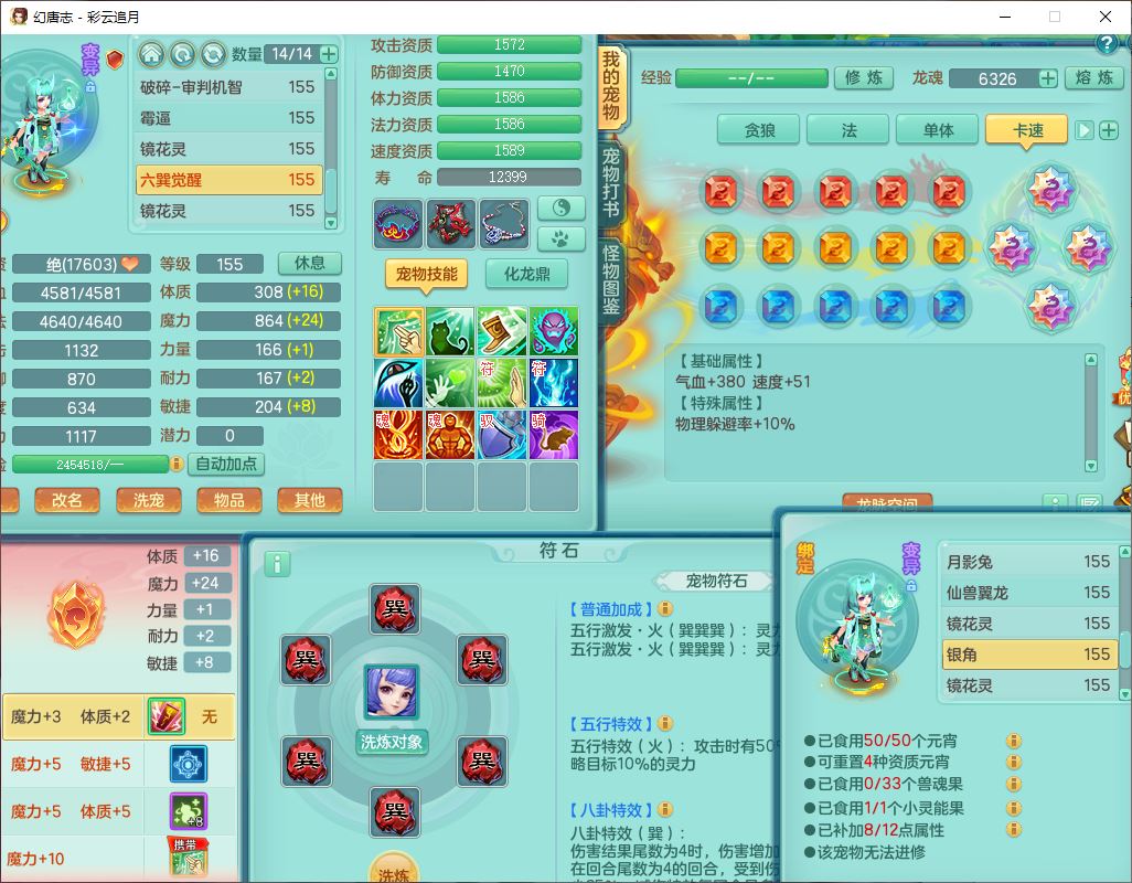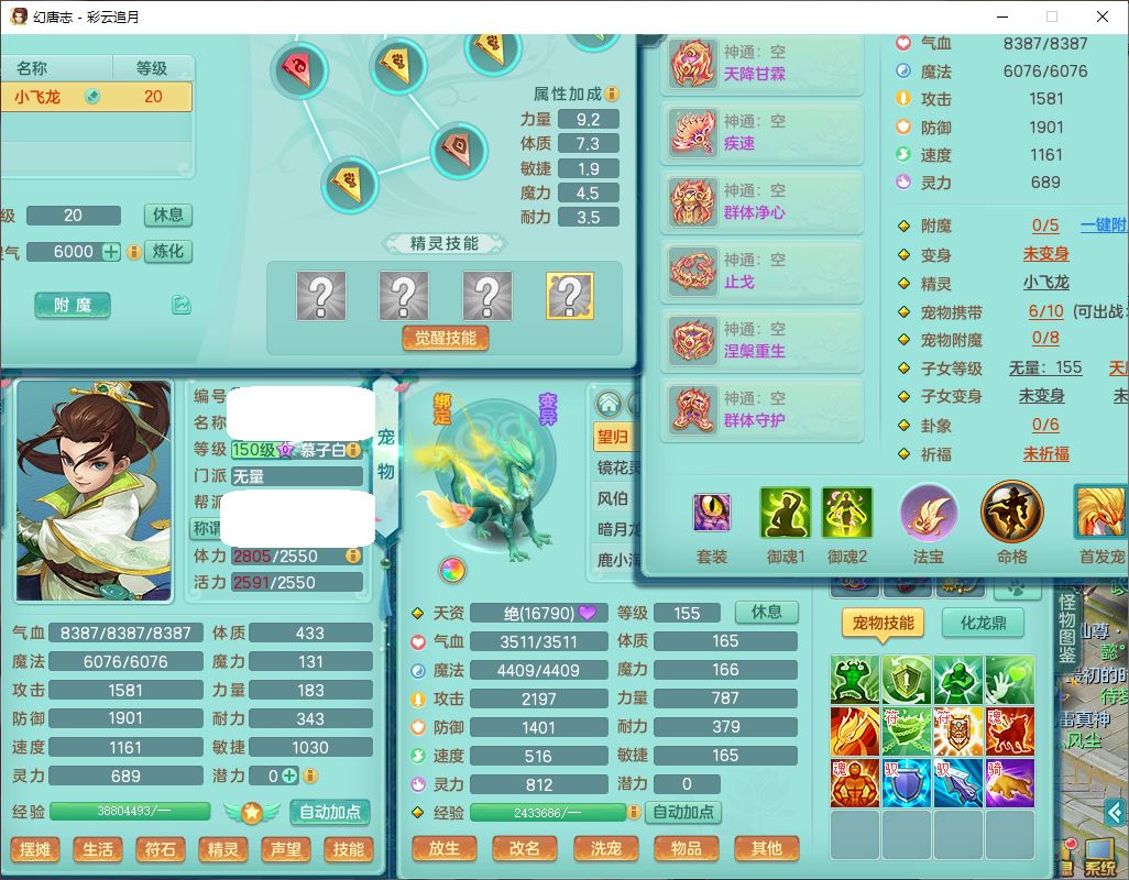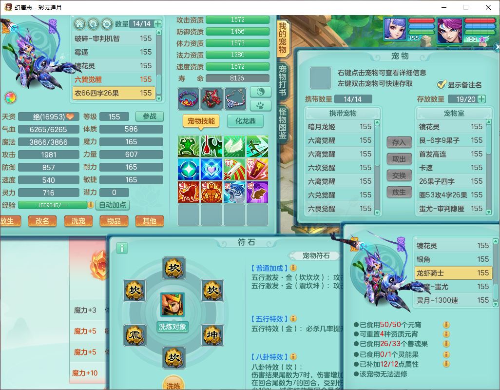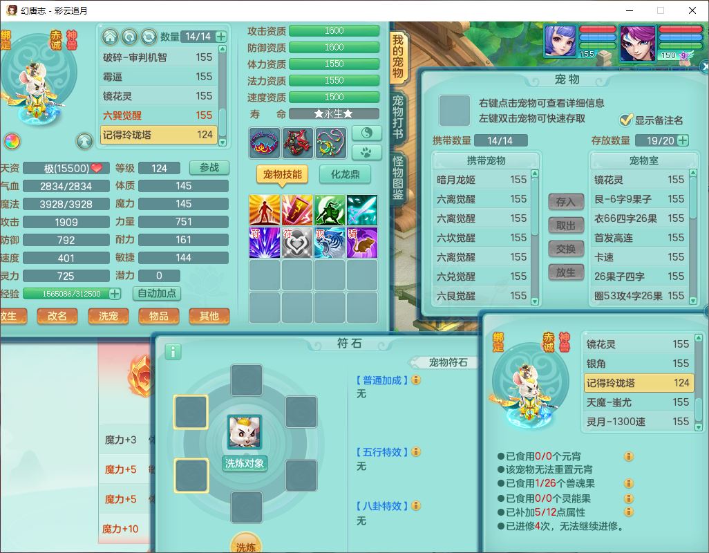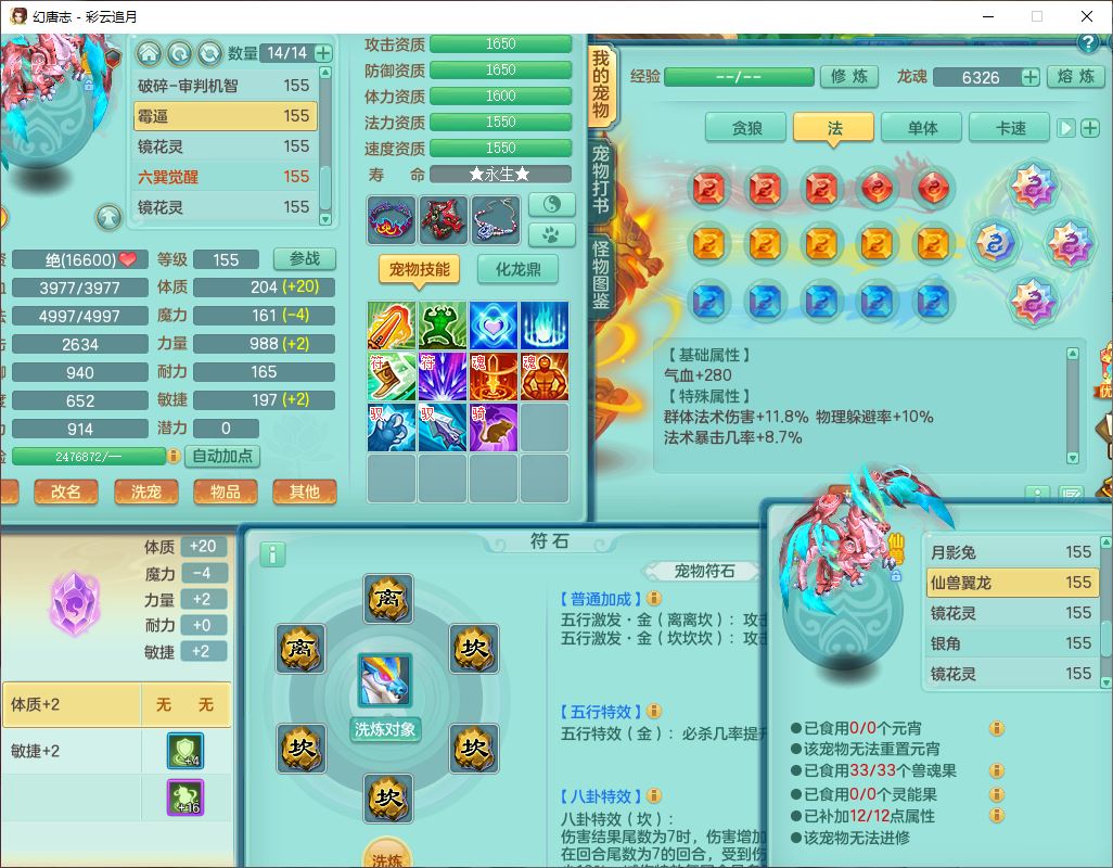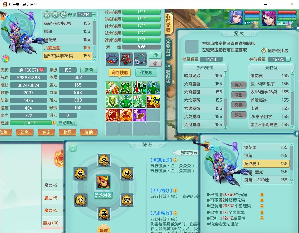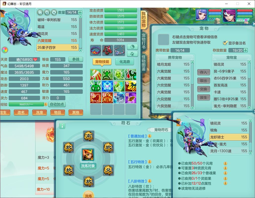 cy10238彩云追月159男万兽【潜龙号】精灵怒*2,1龙(无内)1内丹青蛇1龙姬1望归3镜花,8觉醒1宠皮7六字1五字9四字综合14只满果子,9红装备,932单加Y冥王武器,Y群体疾速腰带,法爆心神武器,鼎5.0+70+280,法爆8.7,2套符石,11个内丹碎片,1双人飞行坐骑;带159成品男五庄准精灵歌,1镜花1特殊(剑胆)8红装备,370多w神武币;带3个150奶粉