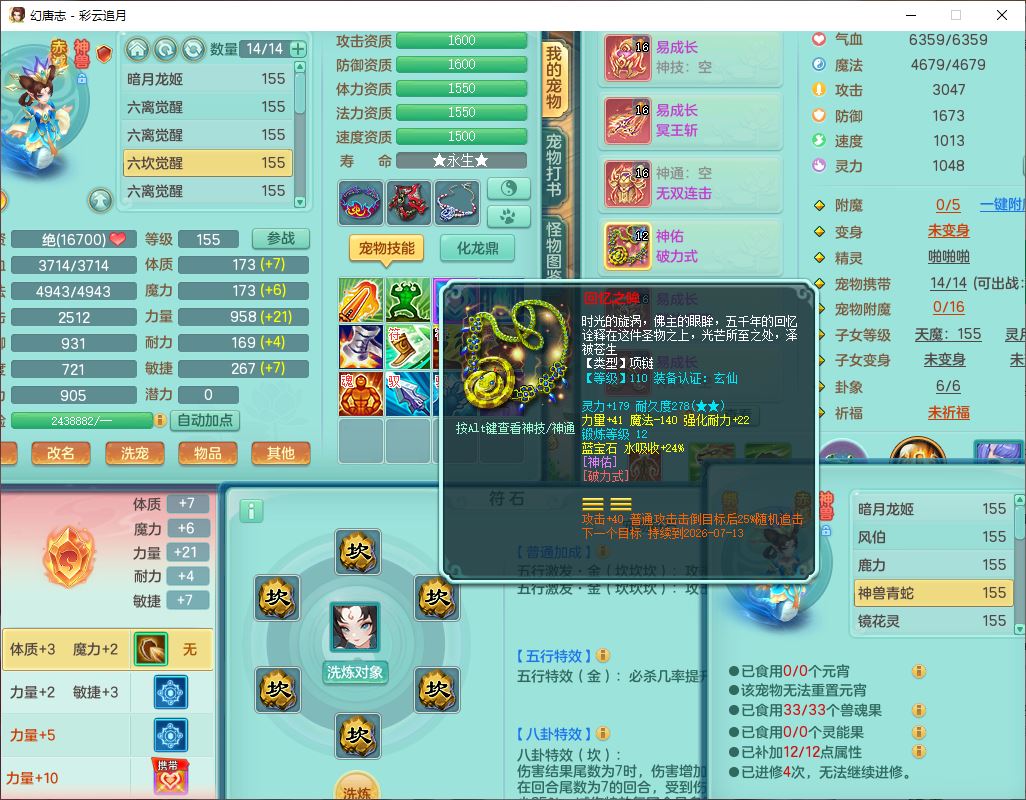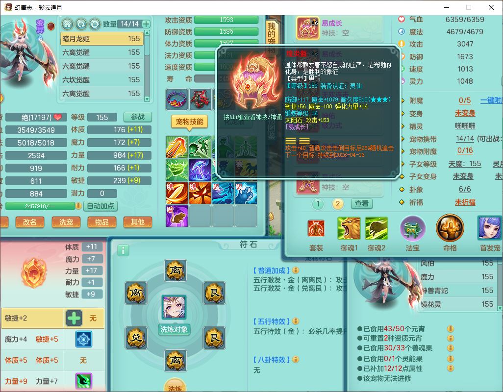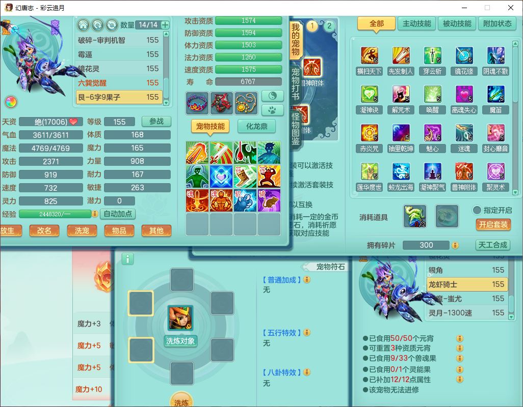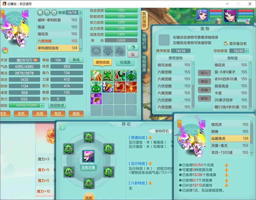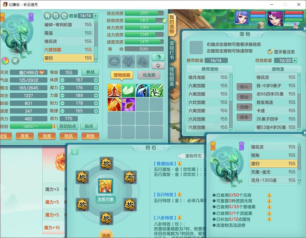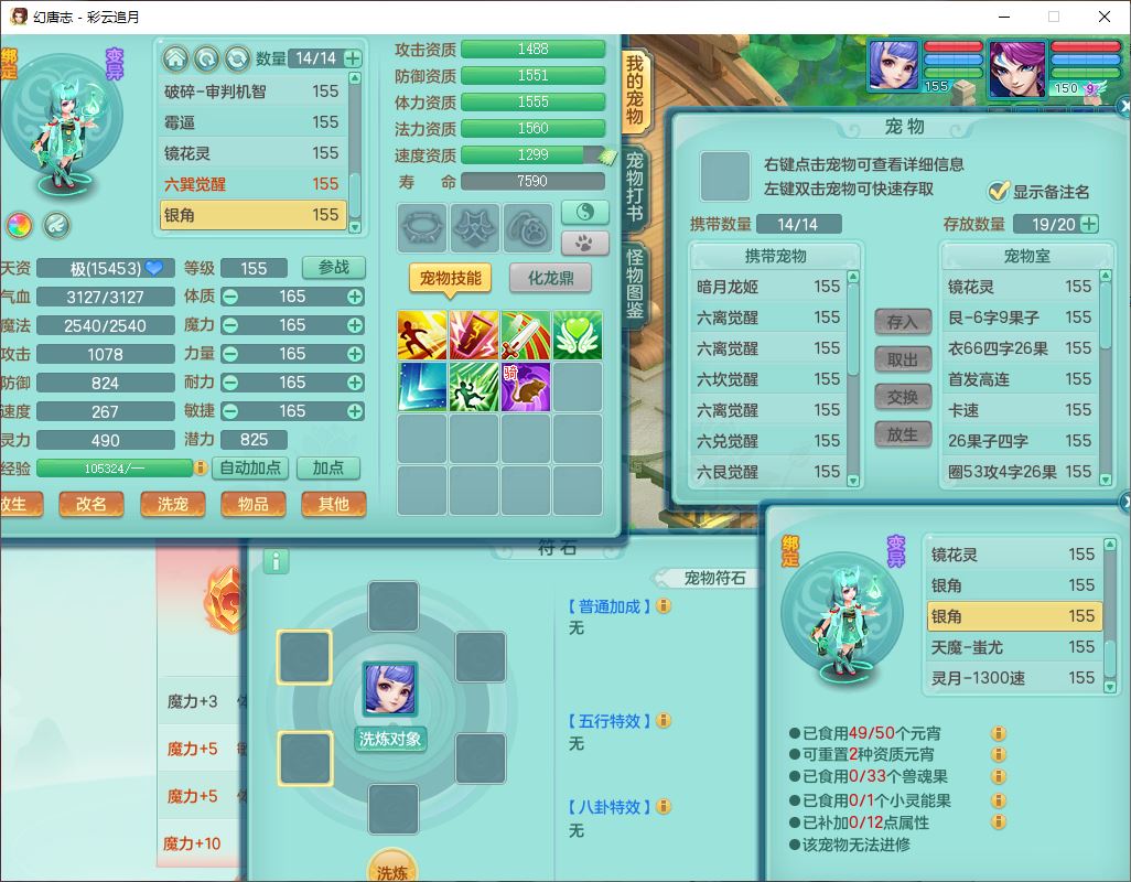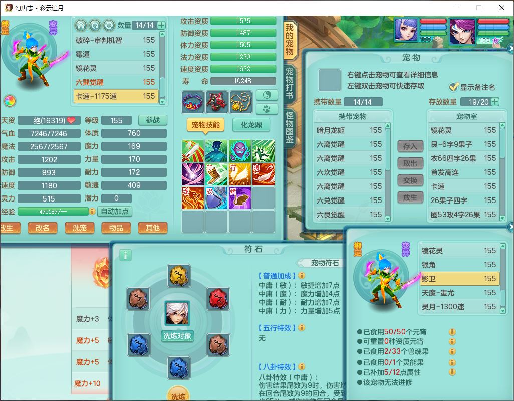 cy10238彩云追月159男万兽【潜龙号】精灵怒*2,1龙(无内)1内丹青蛇1龙姬1望归3镜花,8觉醒1宠皮7六字1五字9四字综合14只满果子,9红装备,932单加Y冥王武器,Y群体疾速腰带,法爆心神武器,鼎5.0+70+280,法爆8.7,2套符石,11个内丹碎片,1双人飞行坐骑;带159成品男五庄准精灵歌,1镜花1特殊(剑胆)8红装备,370多w神武币;带3个150奶粉