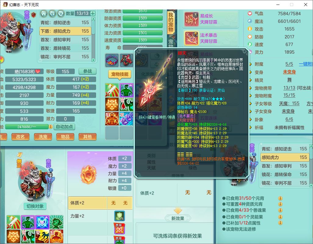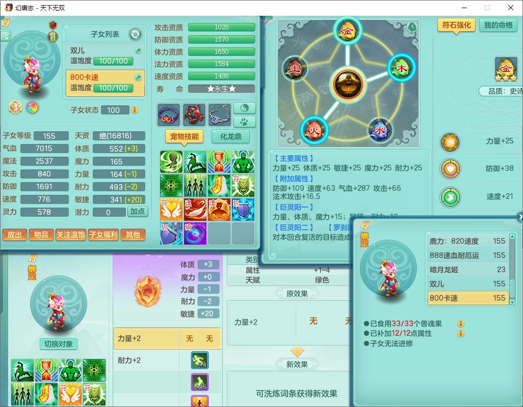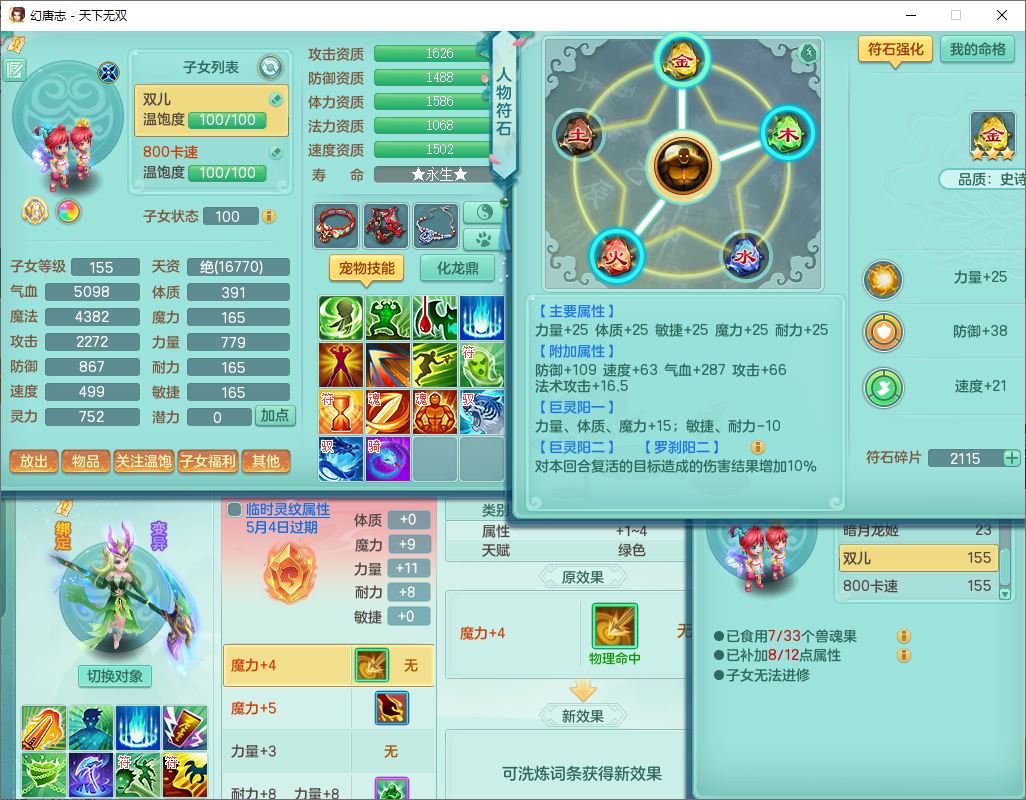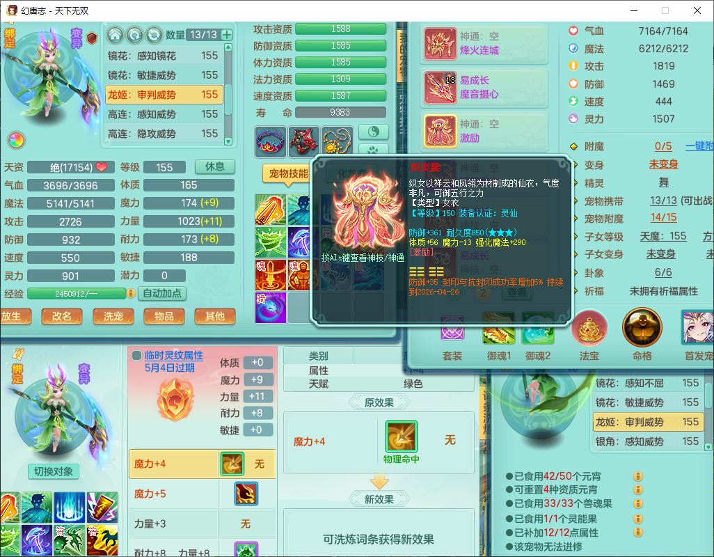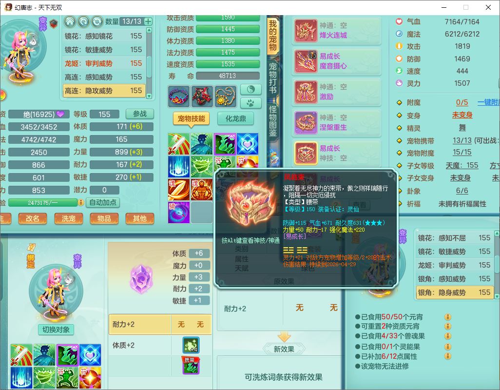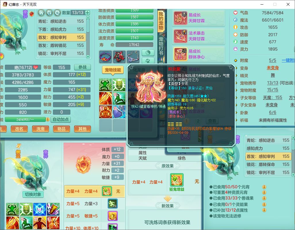 tx10264天下无双159女龙宫精灵舞,1内丹青蛇1望归6镜花1龙姬1金炉2特殊(墨守,烈焰兽决)1七技能风卷妖鬼,5觉醒4六字综合10只满果子,9红装备,Y四海帽子,法爆四海武器,Y晶清衣服,愤怒腰带,五雷鞋子,Y魔音武器,鼎4.5+70,142天月卡,永久外观、精灵皮肤,1双人坐骑