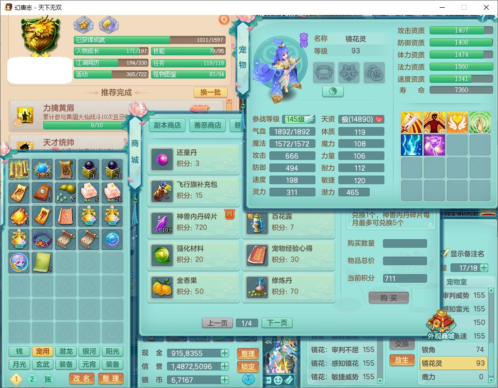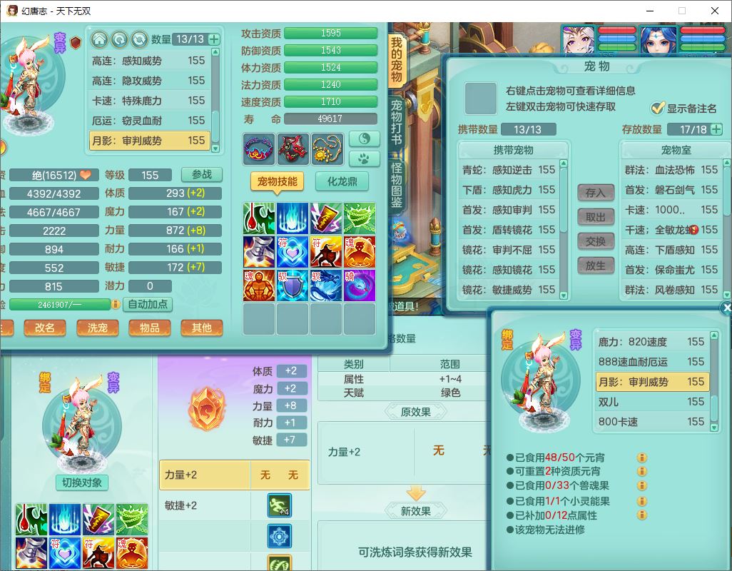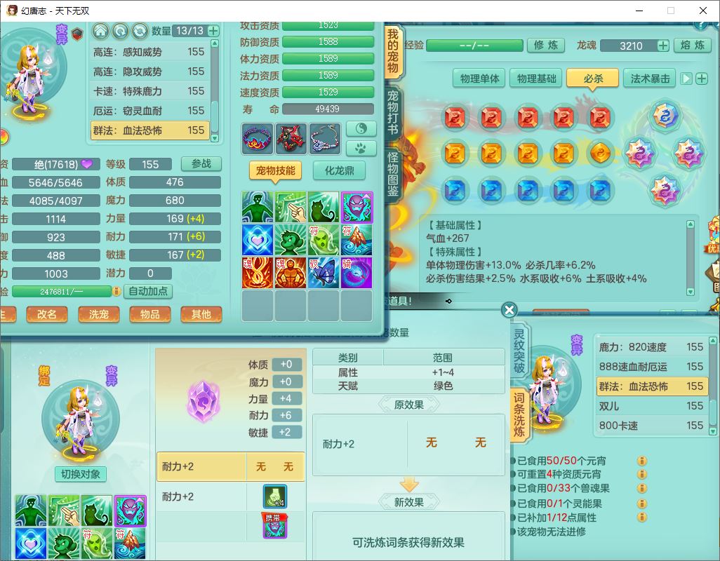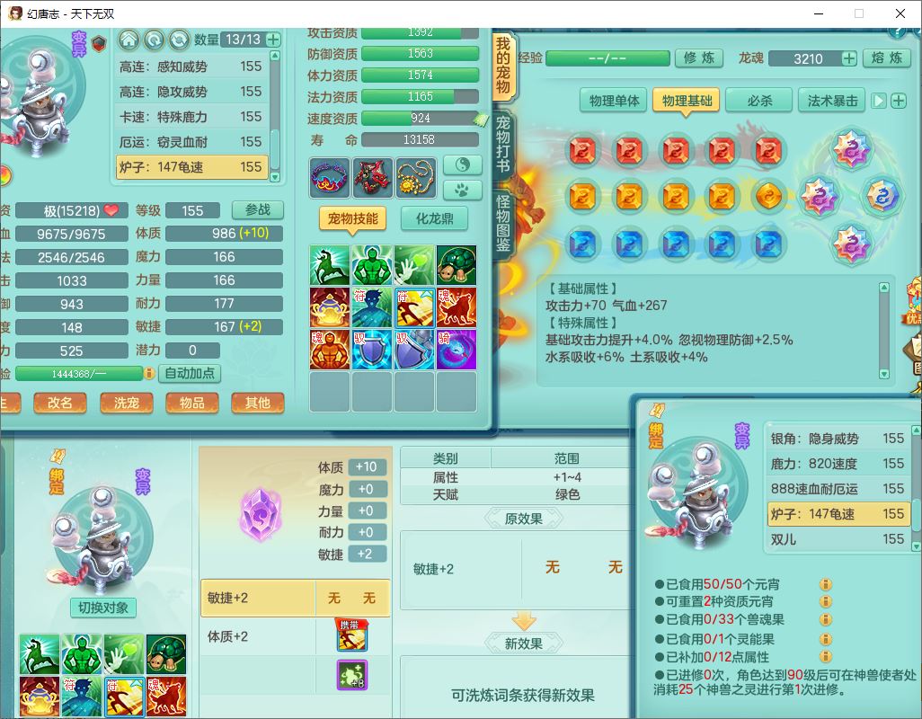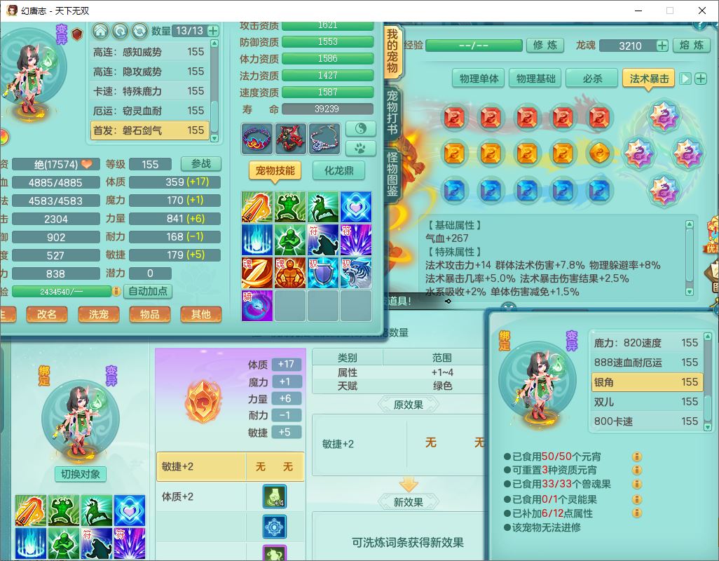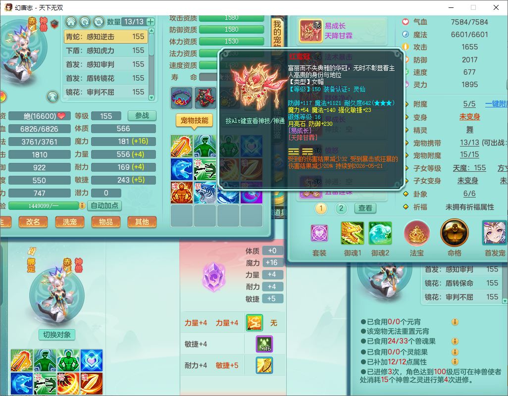 tx10264天下无双159女龙宫精灵舞,1内丹青蛇1望归6镜花1龙姬1金炉2特殊(墨守,烈焰兽决)1七技能风卷妖鬼,5觉醒4六字综合10只满果子,9红装备,Y四海帽子,法爆四海武器,Y晶清衣服,愤怒腰带,五雷鞋子,Y魔音武器,鼎4.5+70,142天月卡,永久外观、精灵皮肤,1双人坐骑