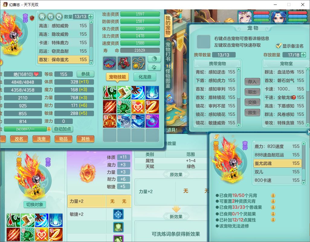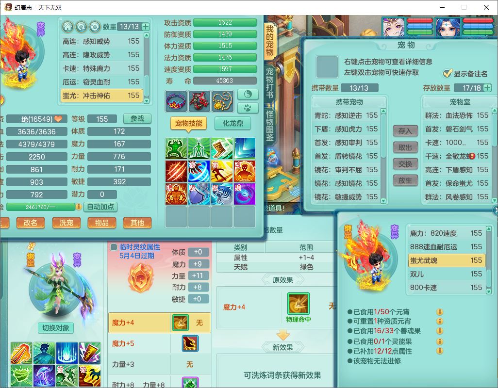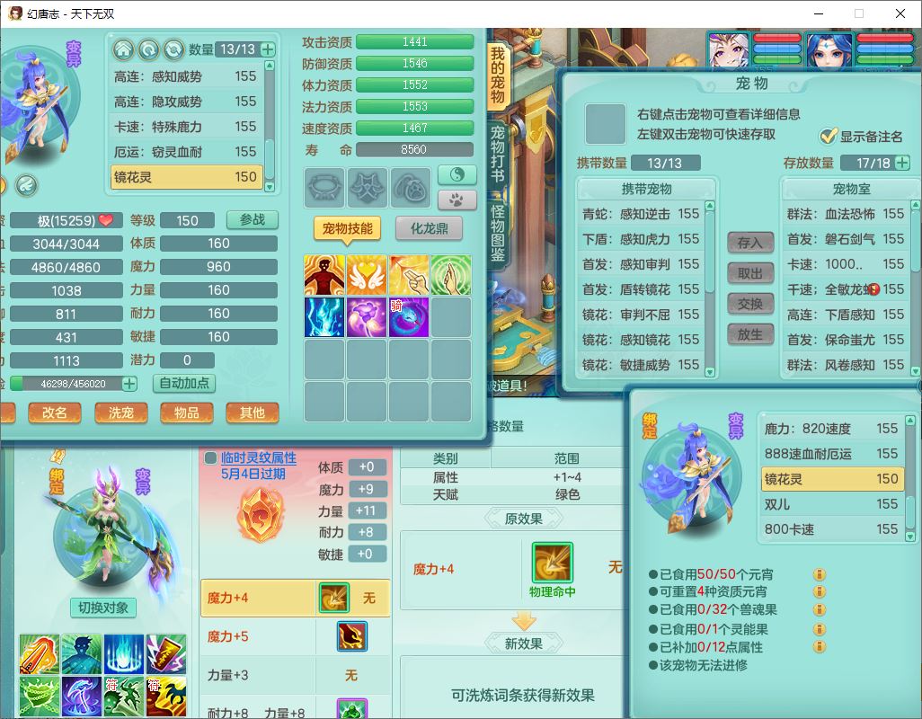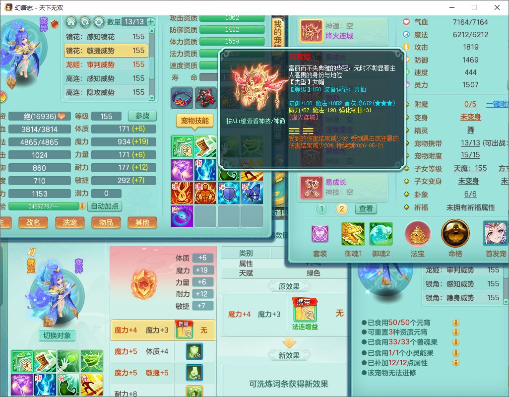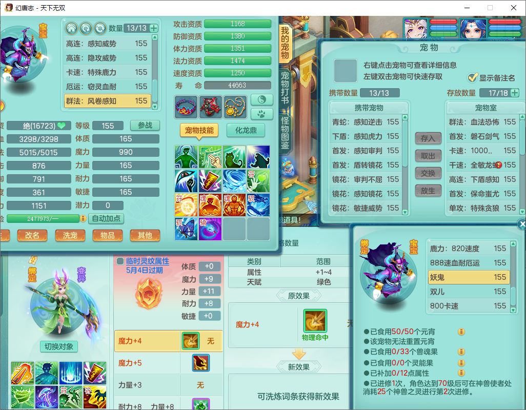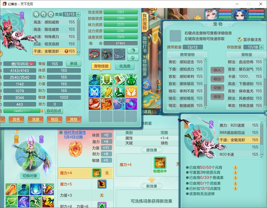 tx10264天下无双159女龙宫精灵舞,1内丹青蛇1望归6镜花1龙姬1金炉2特殊(墨守,烈焰兽决)1七技能风卷妖鬼,5觉醒4六字综合10只满果子,9红装备,Y四海帽子,法爆四海武器,Y晶清衣服,愤怒腰带,五雷鞋子,Y魔音武器,鼎4.5+70,142天月卡,永久外观、精灵皮肤,1双人坐骑