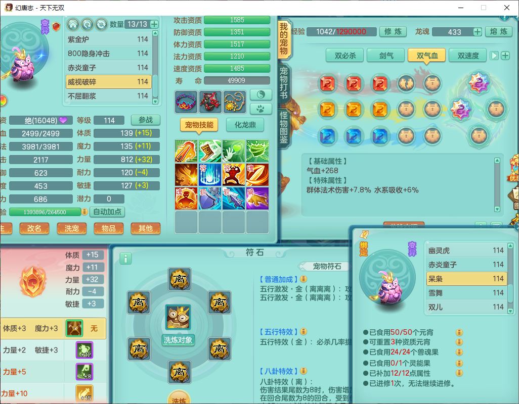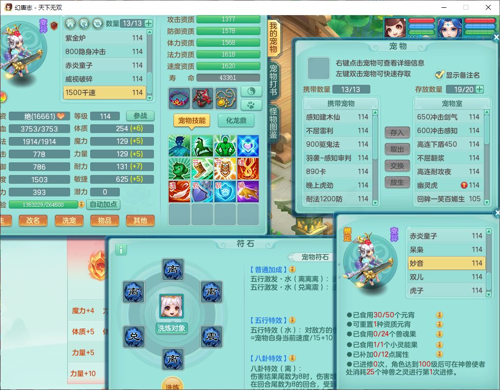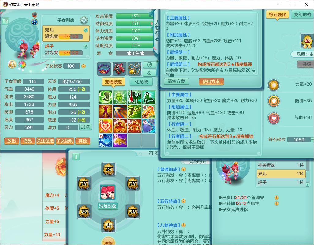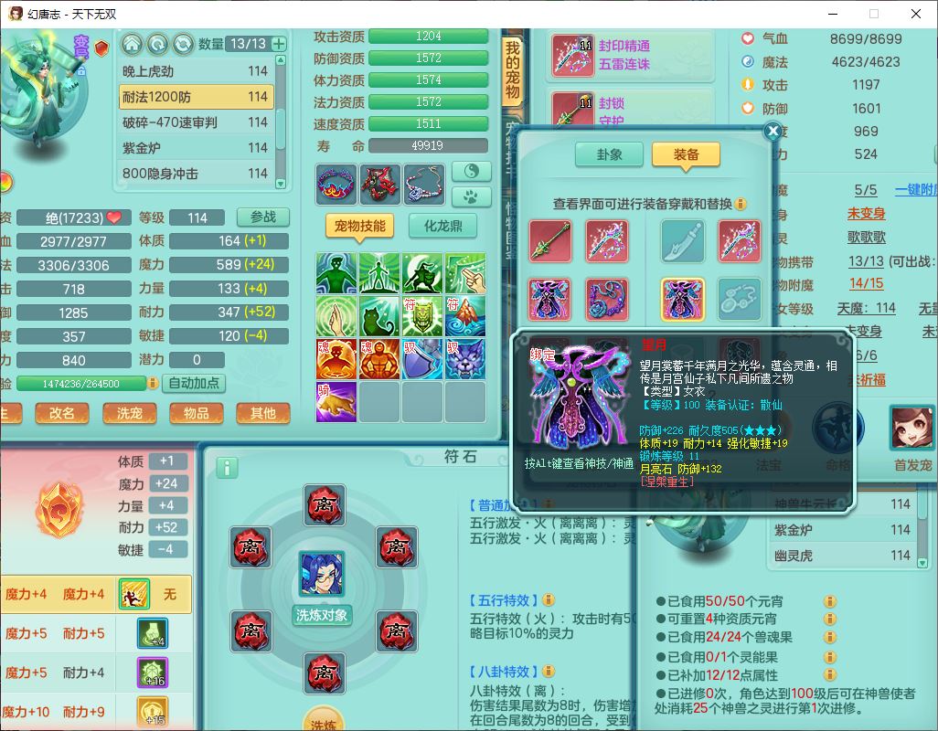 tx10307天下无双109女五庄【潜龙号】精灵舞,1内(破境)1青蛇(无内)1建木2羽袭1金炉1童子,11觉醒12六字2五字6四字16只满果子,11红星辰之拥装备,封印精通五雷帽子,封锁守护武器,神佑笑里项链,愤怒四海腰带,迅捷玉清鞋子,鼎2.5+42+168,2套符石,庭院169房屋158,21个仙兽灵,41个内丹碎片,20个神兽内丹,2坐骑