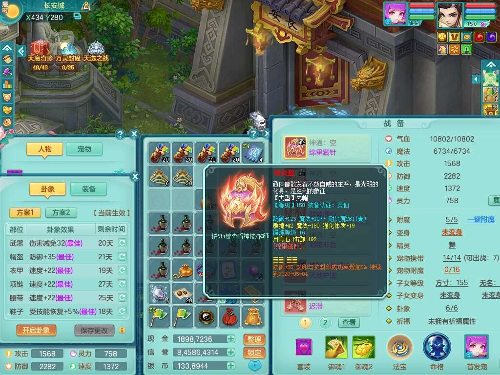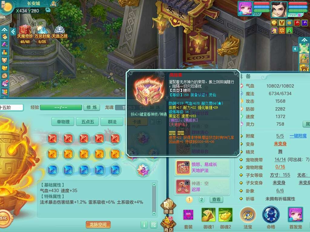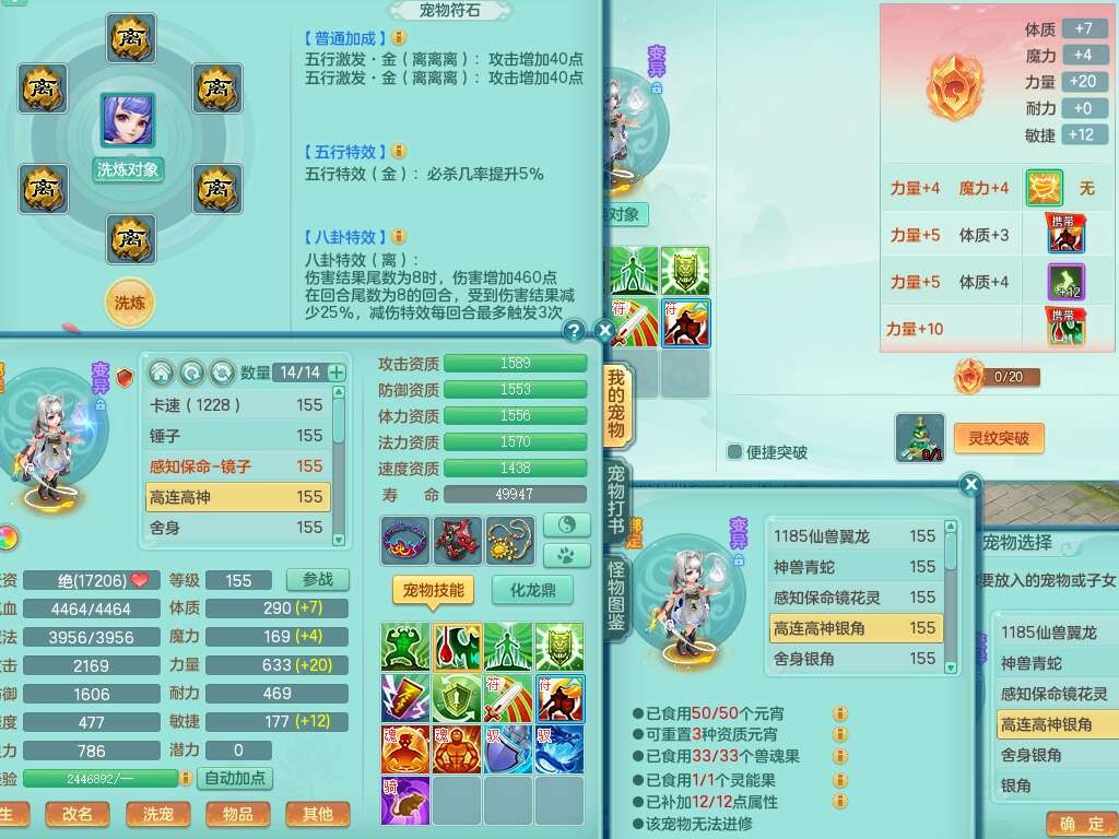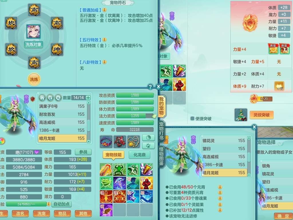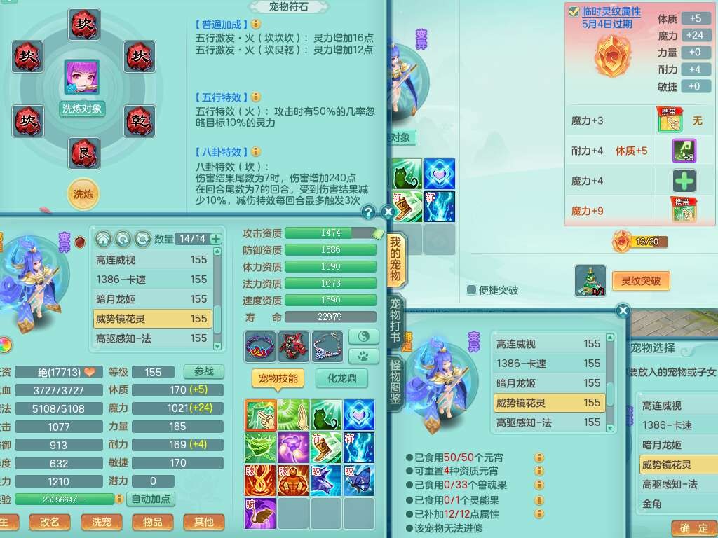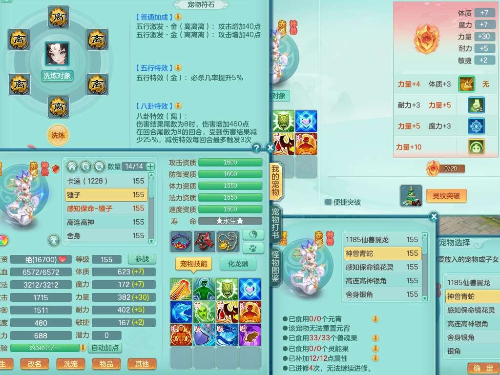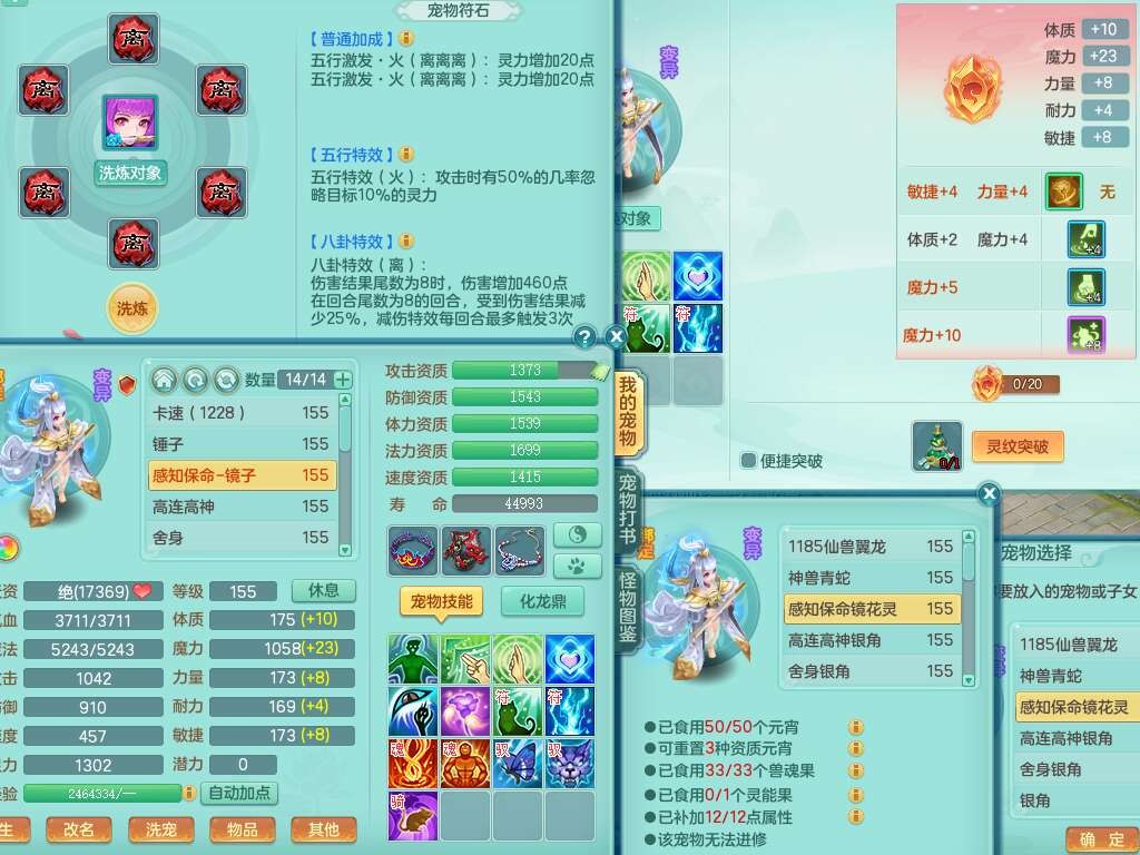 J22163扬名立万159男方寸,精灵舞,1龙没内,1内胆神,【8只觉醒,已潜龙】,3特殊(舍身,守护,烈焰),4只6技能镜花灵,1只6技能龙姬,2只九技能炼妖,三红愤怒易罗汉腰带,6特,5.5基础鼎+70攻,280血,物理躲避10%,7个纯六字,3个5字,20只满果子,宠排在榜,修炼在榜,火焰之力,带5964金币,百万银币,月卡还有21天。