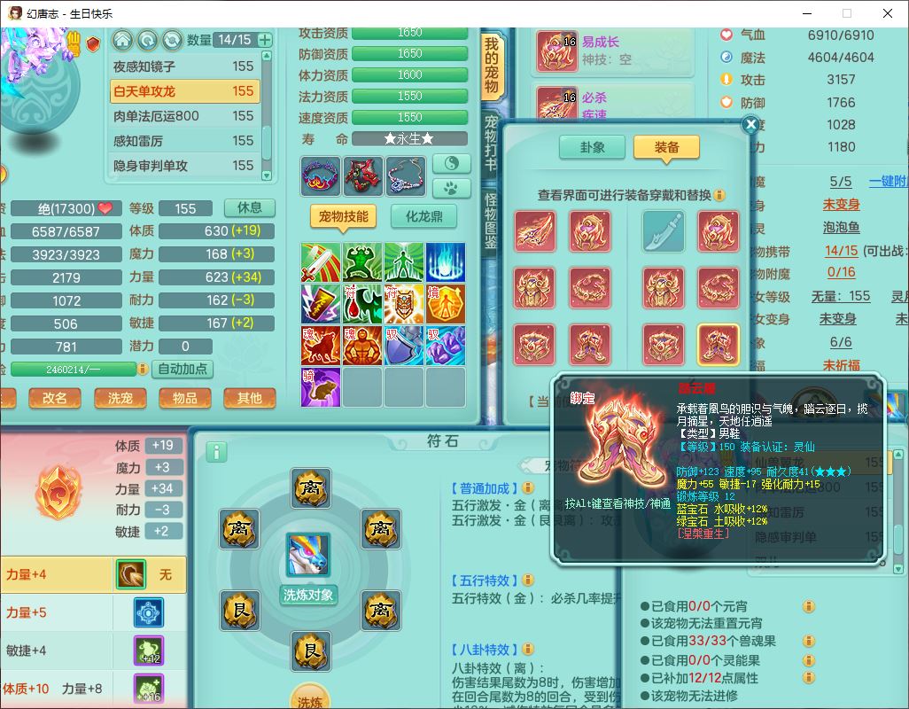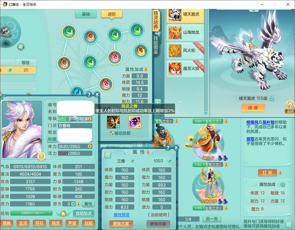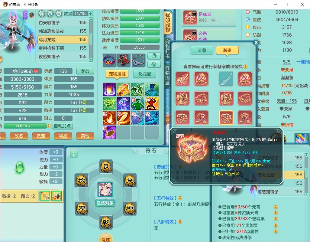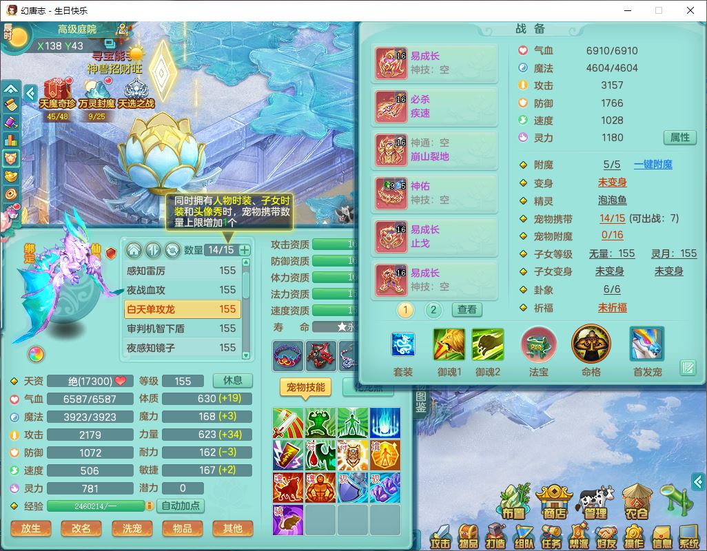 4364生日快乐159男万兽【西瓜冰】精灵舞,2龙(1换,1破境)1内1龙姬3镜花6特殊(羽袭、雷利,兽决焚心、战争、破碎、剑胆),14觉醒1宠皮1六字1五字11四字18只满果子,8红装备,923必杀疾速武器,崩山衣服,神佑项链,Y止戈腰带,有法系装,Y唤魂衣服,264单加Y项链,鼎5.5+70,2套符石,冰晶庭院173房屋154,永久外观、精灵皮肤,9个内丹碎片,1双人飞行坐骑