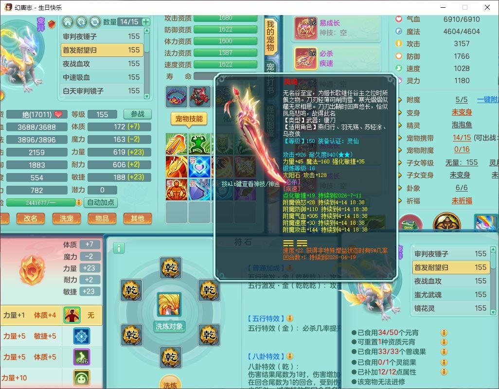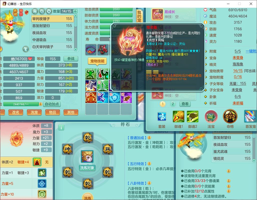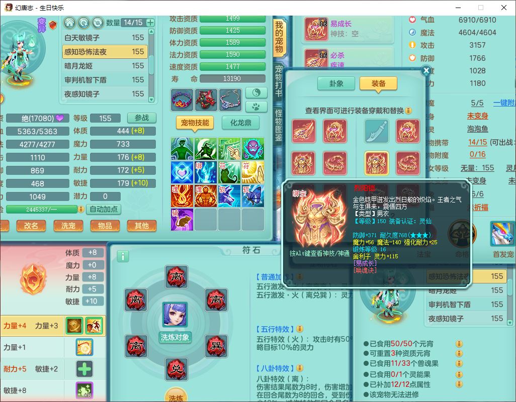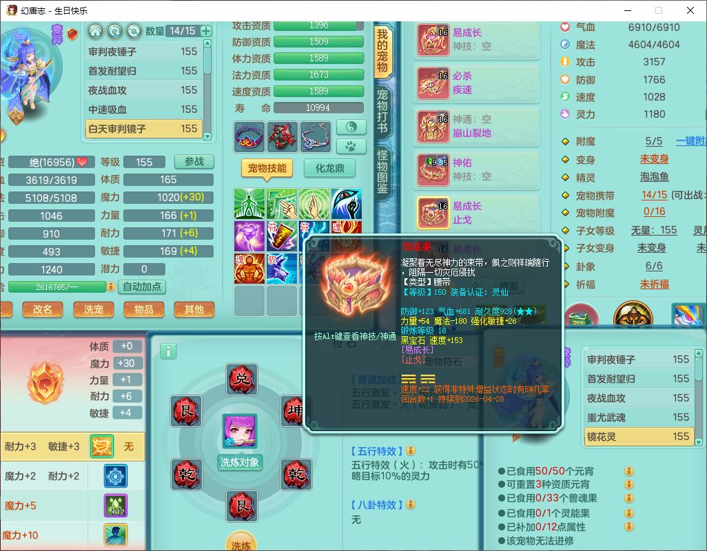 4364生日快乐159男万兽【西瓜冰】精灵舞,2龙(1换,1破境)1内1龙姬3镜花6特殊(羽袭、雷利,兽决焚心、战争、破碎、剑胆),14觉醒1宠皮1六字1五字11四字18只满果子,8红装备,923必杀疾速武器,崩山衣服,神佑项链,Y止戈腰带,有法系装,Y唤魂衣服,264单加Y项链,鼎5.5+70,2套符石,冰晶庭院173房屋154,永久外观、精灵皮肤,9个内丹碎片,1双人飞行坐骑