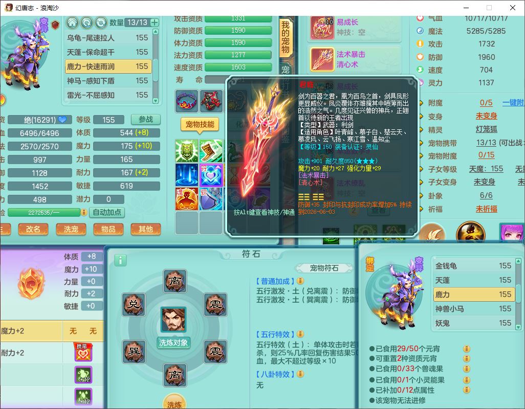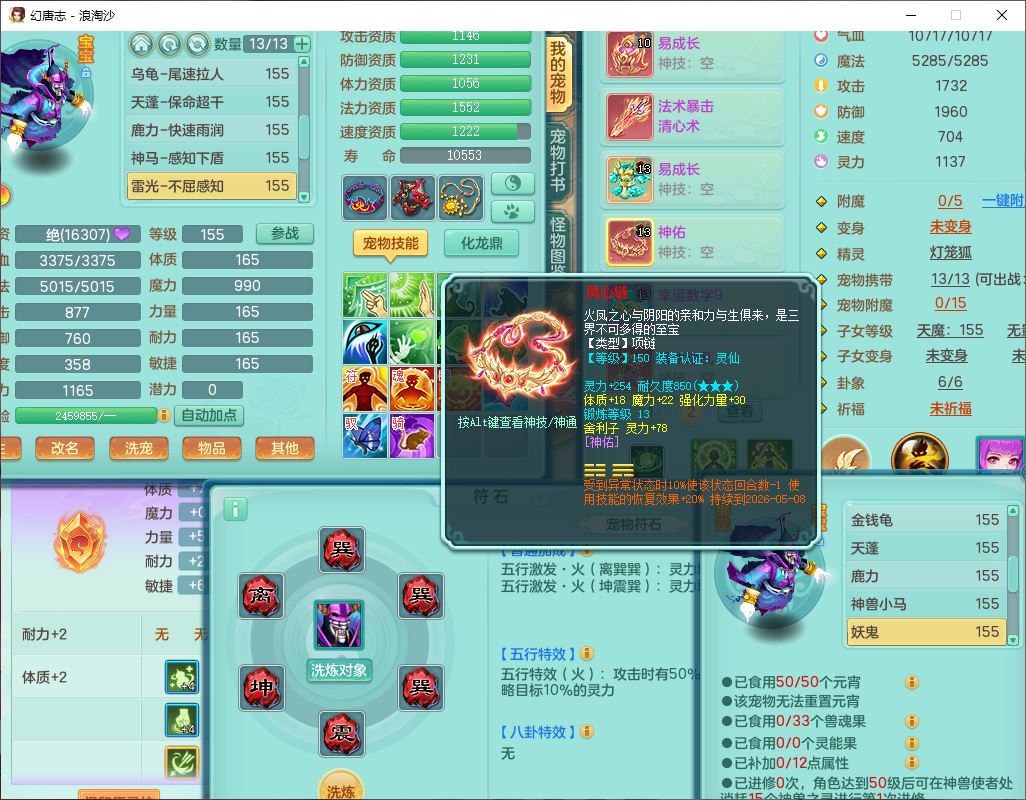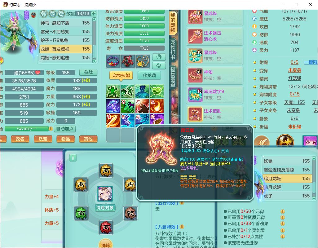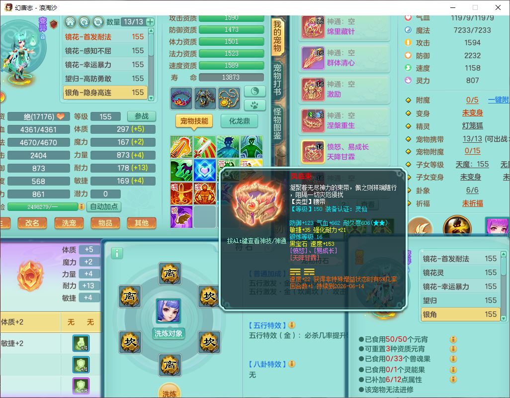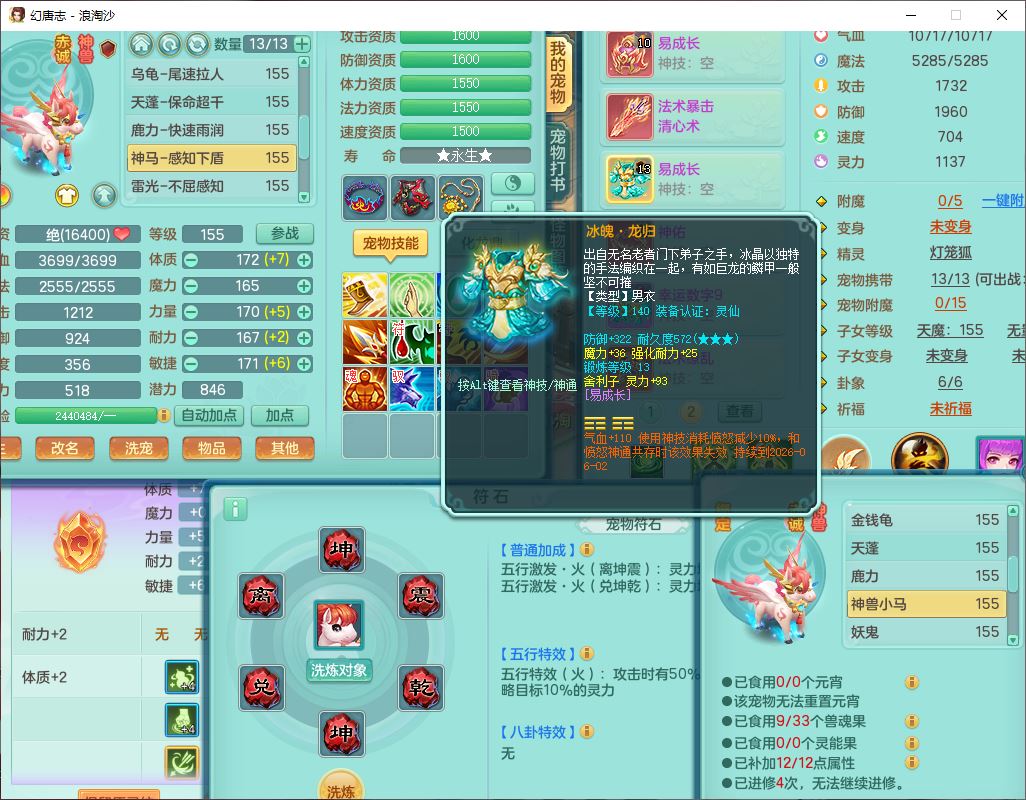 80746浪淘沙159男无量精灵舞,1内丹小马1望归3镜花灵1八技能金钱龟1七技能雷光妖鬼1金炉2龙姬,2觉醒2六字1五字4四字综合6只满果子,8红装备,单加笑里帽子,玉清武器,单加激励衣服, 单加慈航项链,愤怒Y四海腰带,单加止戈鞋子,一套7红装备,法爆水清武器,神佑项链,单加幸运腰带,单加法术缭乱鞋子,鼎4.0,永久头饰、背饰、精灵皮肤,50个仙兽灵,1双人坐骑,带152女万兽