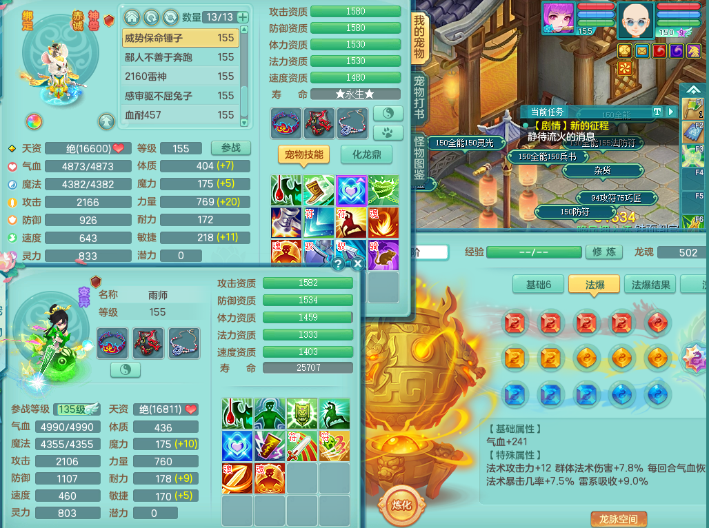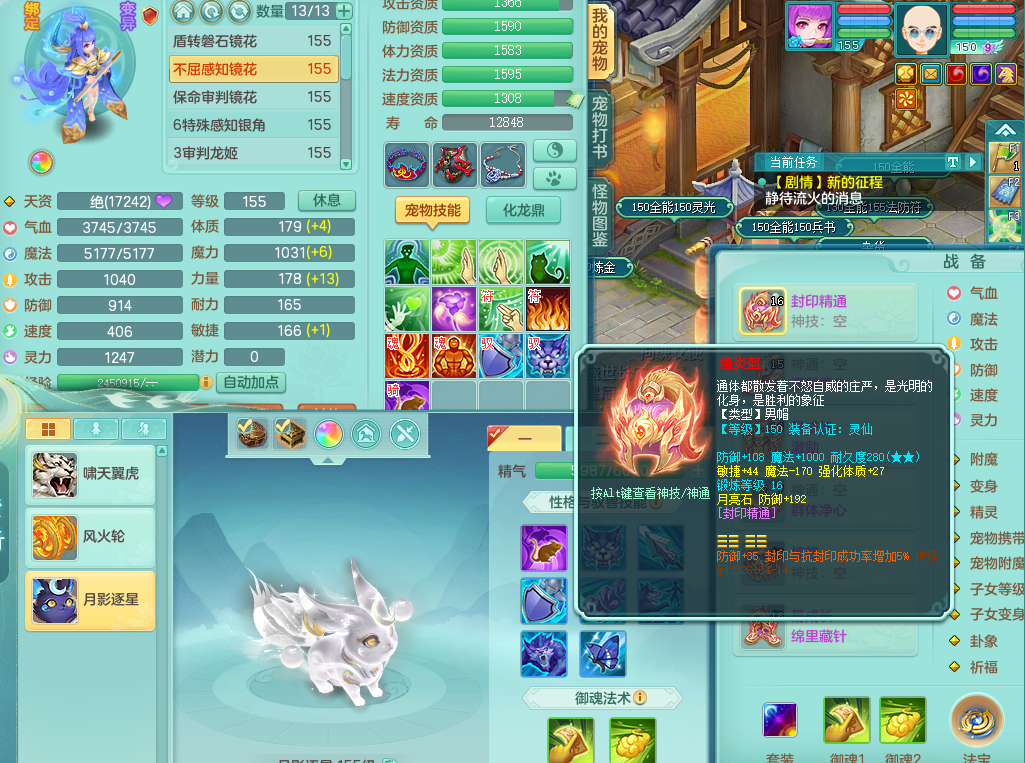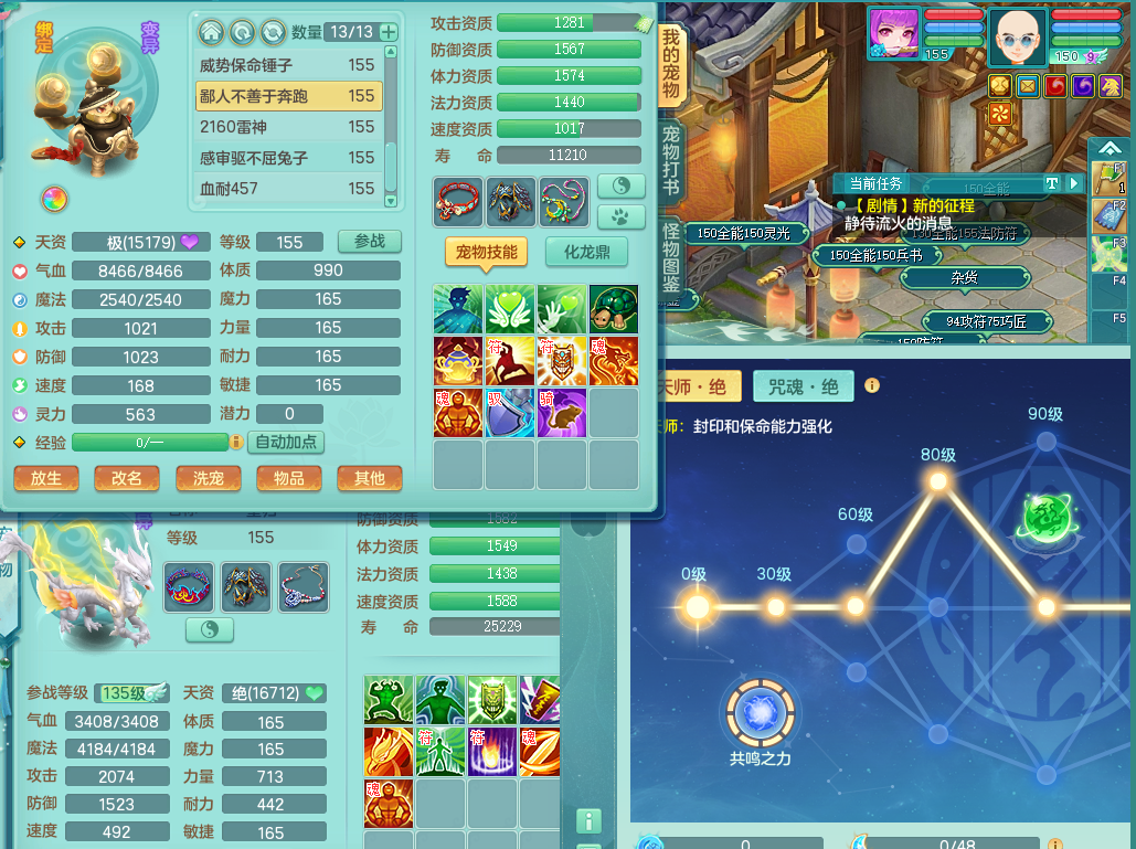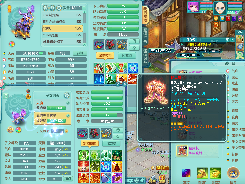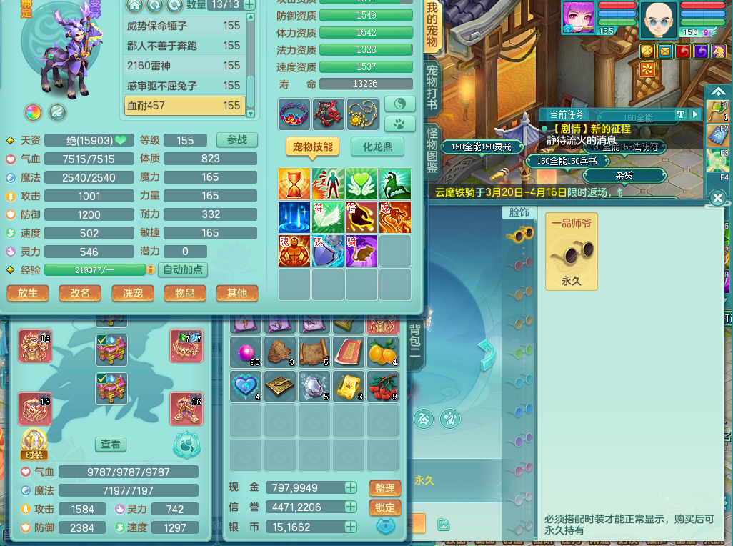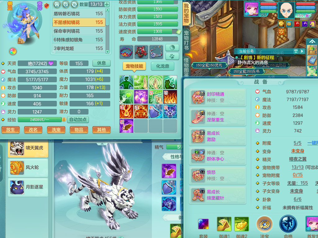 95014,三生万物159方寸,4觉醒,3六字,3镜子1红心龙姬,1内丹神(存)1特殊逆龙击,基础5.0,精灵舞,2只坐骑有双人飞行老虎,单加44封印头,易激励衣服,易笑里鞋子,仓库33个内丹神碎片,冰晶庭院,永久头饰背饰脸饰