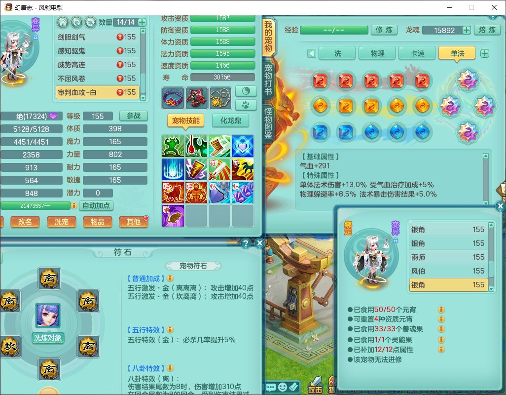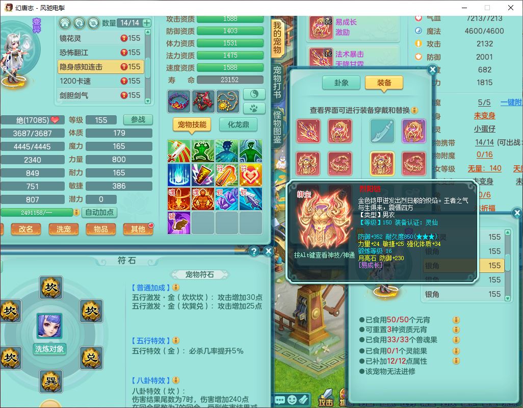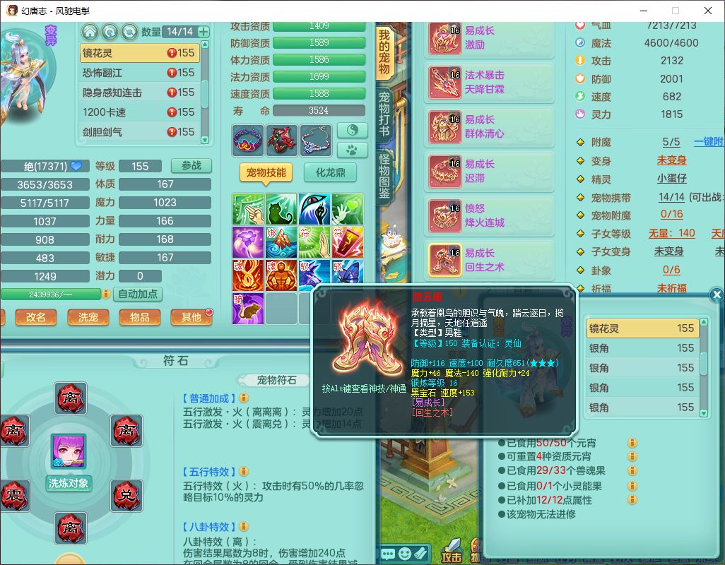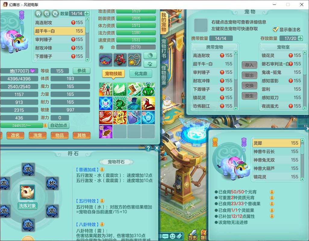 23469风驰电掣159男天宫精灵怒,1龙3内2镜花特殊(翻江、剑胆、以战)3宠皮,2觉醒9五字12四字综合18只满果子,12红装备,Y激励帽子,法爆四海武器,Y玉清衣服,Y迟滞项链,愤怒烽火腰带,Y回生鞋子,鼎4.5+70,庭院167,永久外观饰物、精灵皮肤,403W神武币,65个仙兽灵,3双人坐骑(2飞行)
