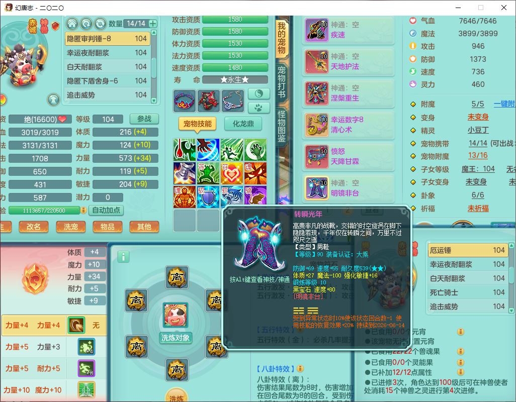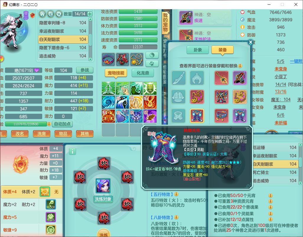 4357,2020区99男普陀【潜龙号】体敏耐、全魔双系精灵,2龙(1换、无内)3内(1龙马1青蛇)3翻江2舍身1金炉,8觉醒1宠皮7六字3四字15只满果子,全单加8红装备,幸运水清项链,愤怒四海腰带,崩山鞋子,有法系装备,法缭魔音鞋子,Y法缭鞋子,鼎2.5+42+168,3套符石,97天月卡,永久外观、精灵皮肤,33个内丹碎片,1双人飞行坐骑