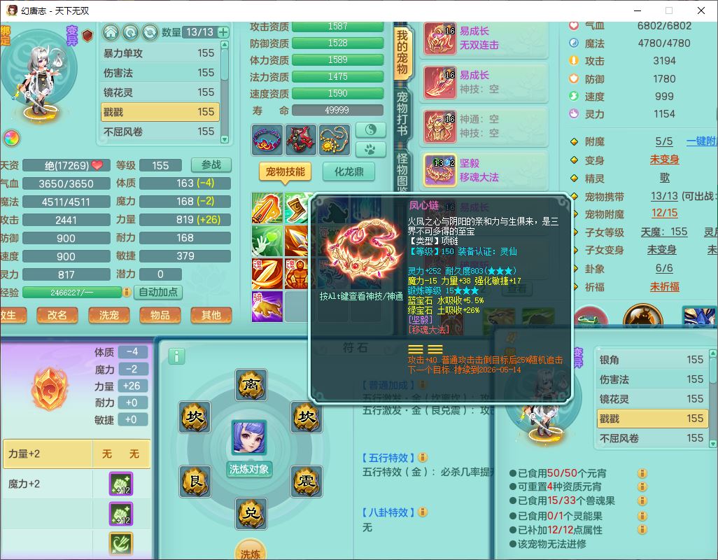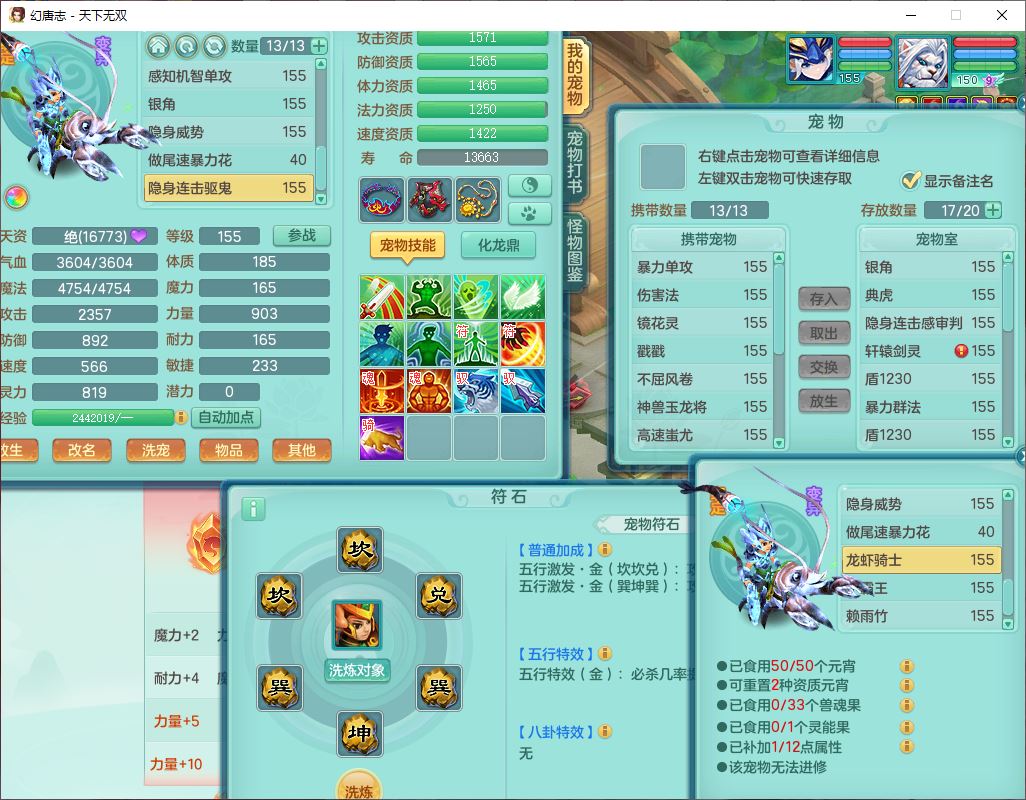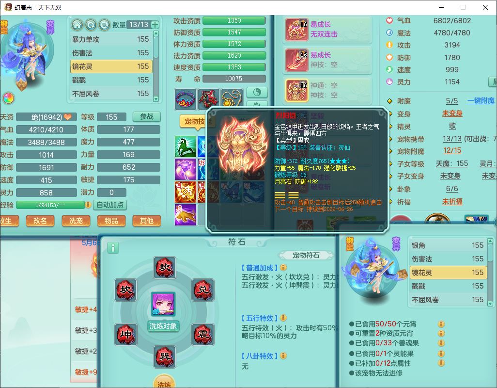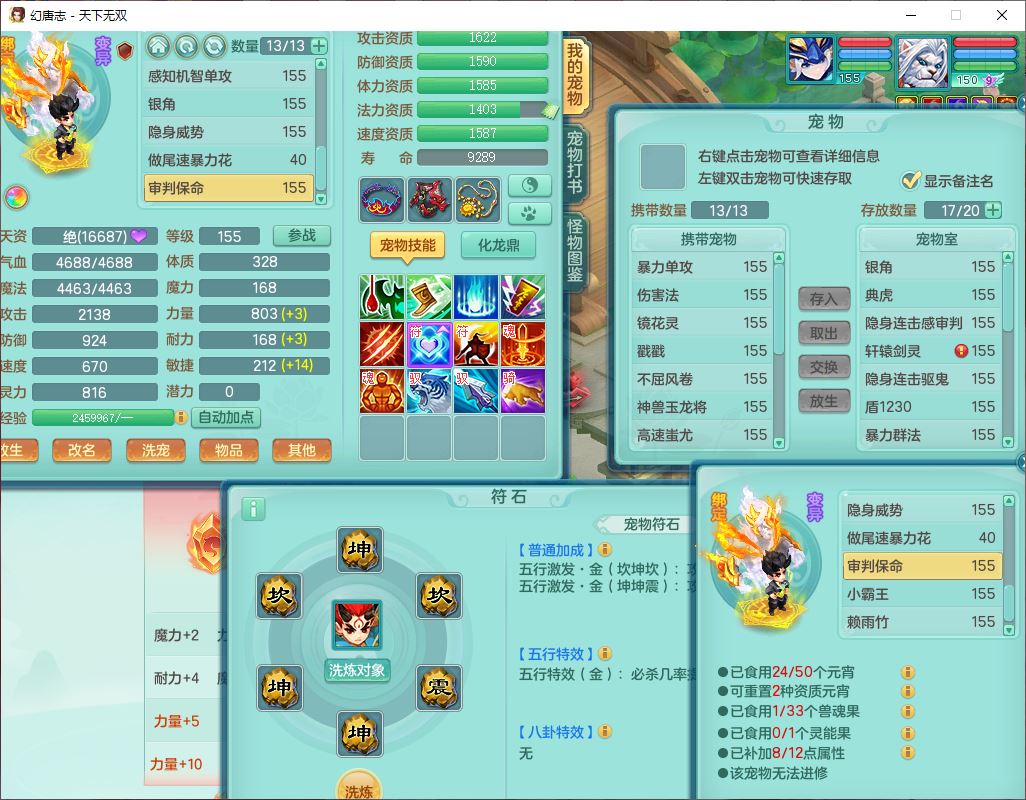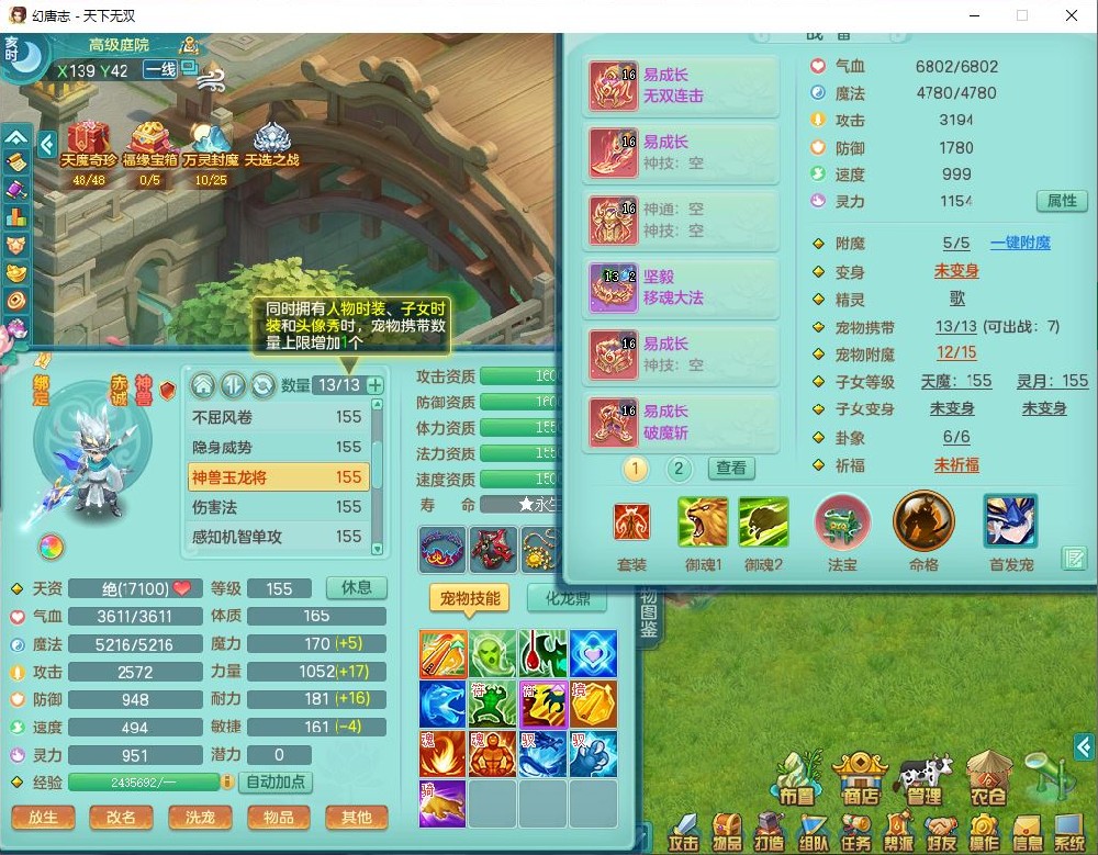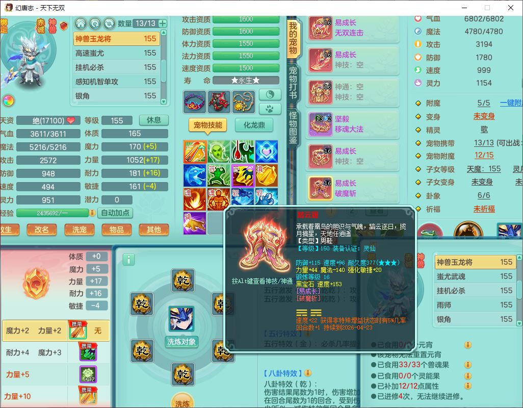 tx10323天下无双159男万兽【马上发财+火焰之力】精灵歌,1内(带蛇影,破境)3镜花(1胚子)4特殊(勇猛、风卷、影袭,兽决破碎)1龙姬,3觉醒1六字12四字,8红装备,Y破血帽子,单加Y武器,坚毅移魂项链,Y破魔鞋子,可搭一套8红法系装,五雷武器,法爆武器,躲避Y衣服,愤怒腰带,法缭鞋子,鼎4.5+70,84天月卡,24个内丹碎片,仓库多护符存货,1双人飞行坐骑,带154奶粉魔王,带双重可换绑