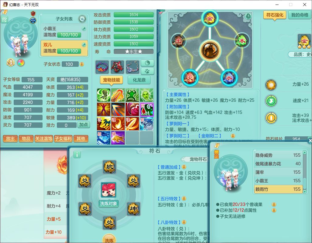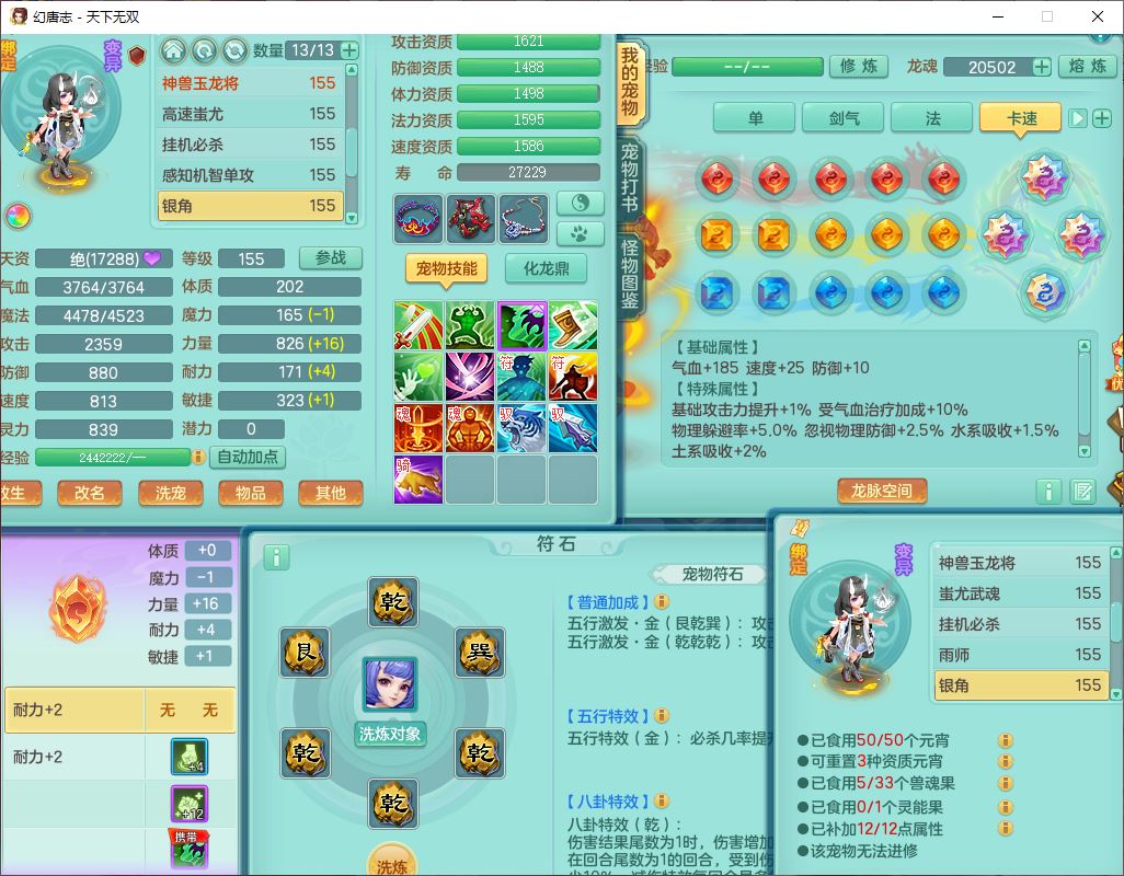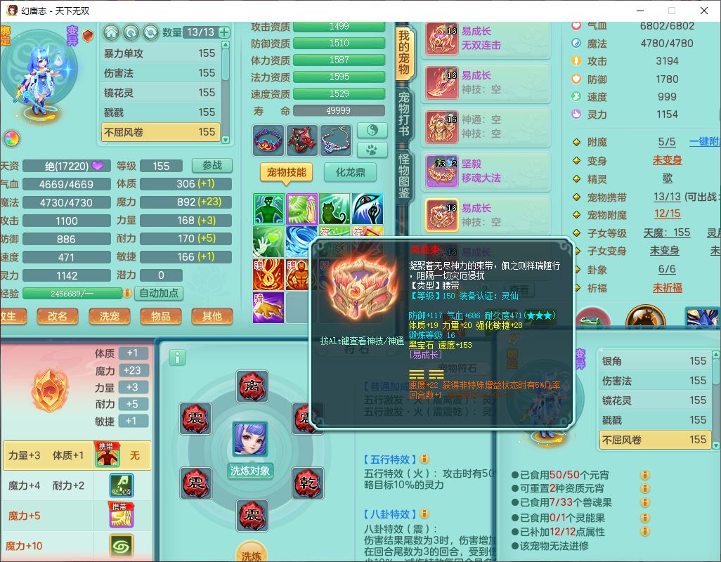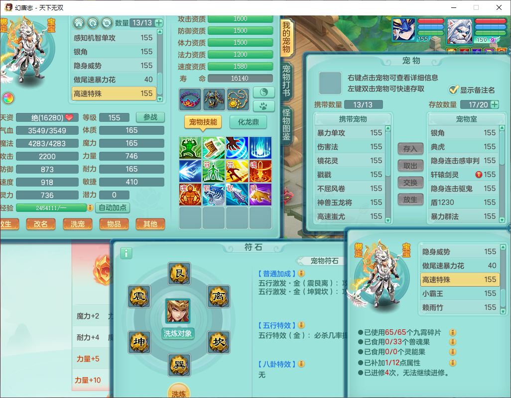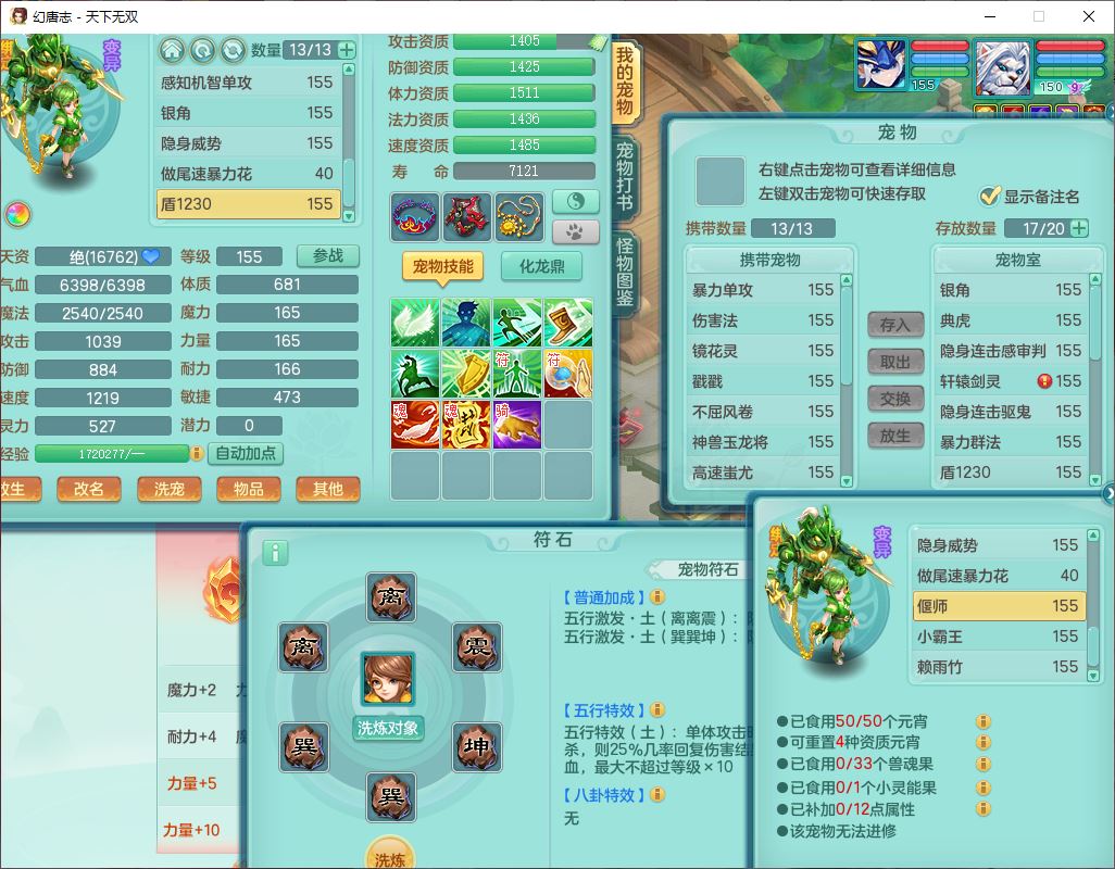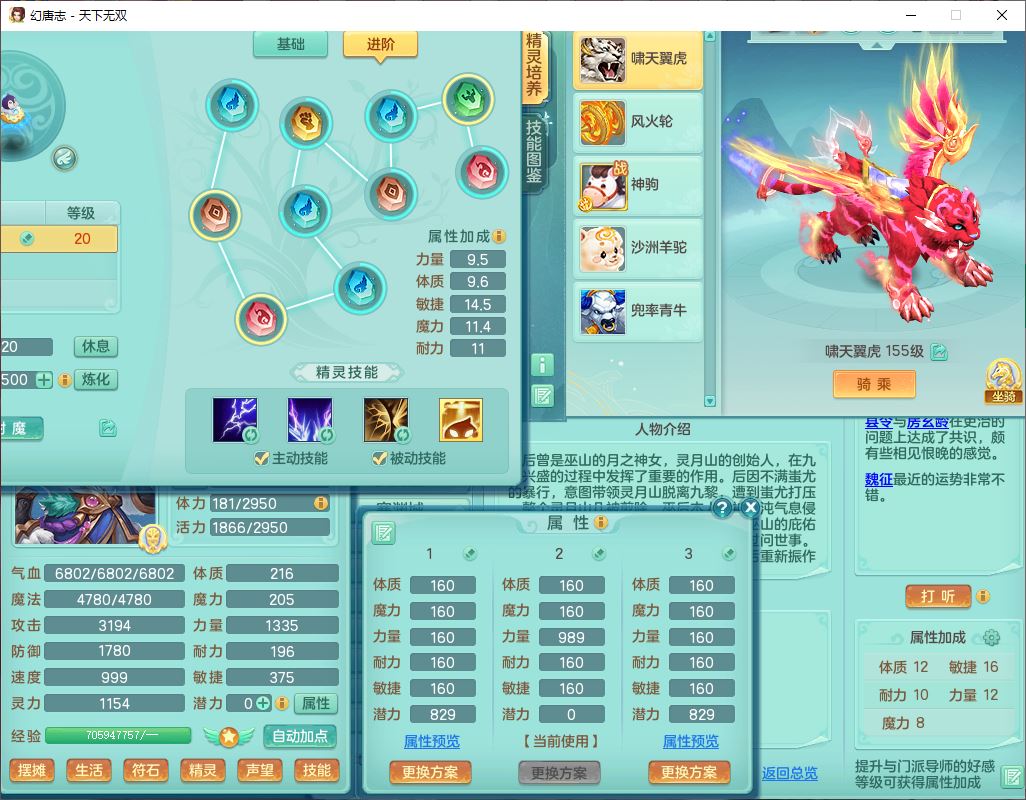 tx10323天下无双159男万兽【马上发财+火焰之力】精灵歌,1内(带蛇影,破境)3镜花(1胚子)4特殊(勇猛、风卷、影袭,兽决破碎)1龙姬,3觉醒1六字12四字,8红装备,Y破血帽子,单加Y武器,坚毅移魂项链,Y破魔鞋子,可搭一套8红法系装,五雷武器,法爆武器,躲避Y衣服,愤怒腰带,法缭鞋子,鼎4.5+70,84天月卡,24个内丹碎片,仓库多护符存货,1双人飞行坐骑,带154奶粉魔王,带双重可换绑