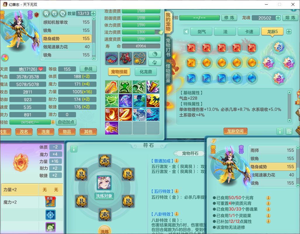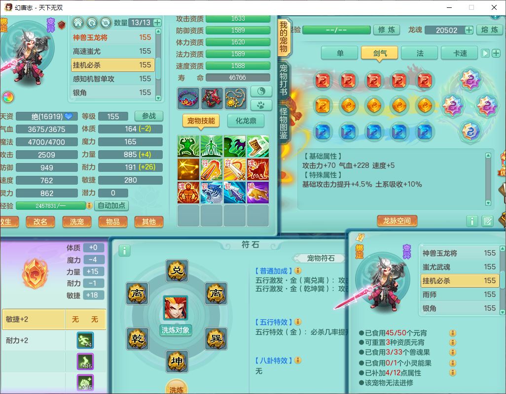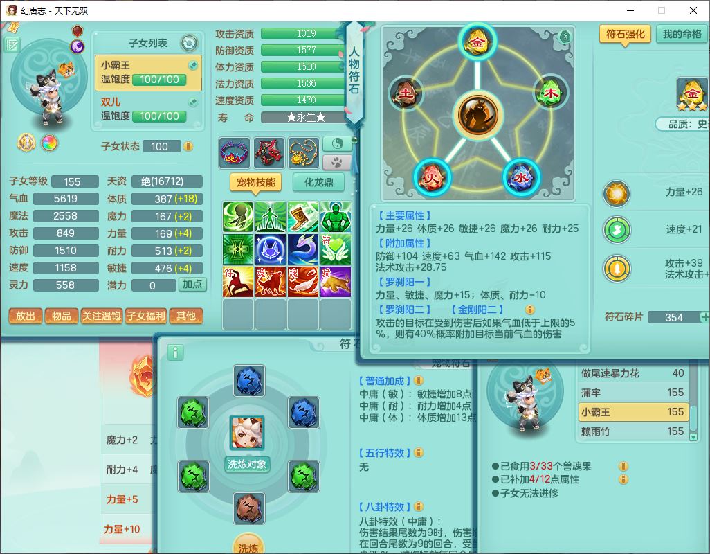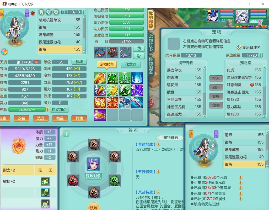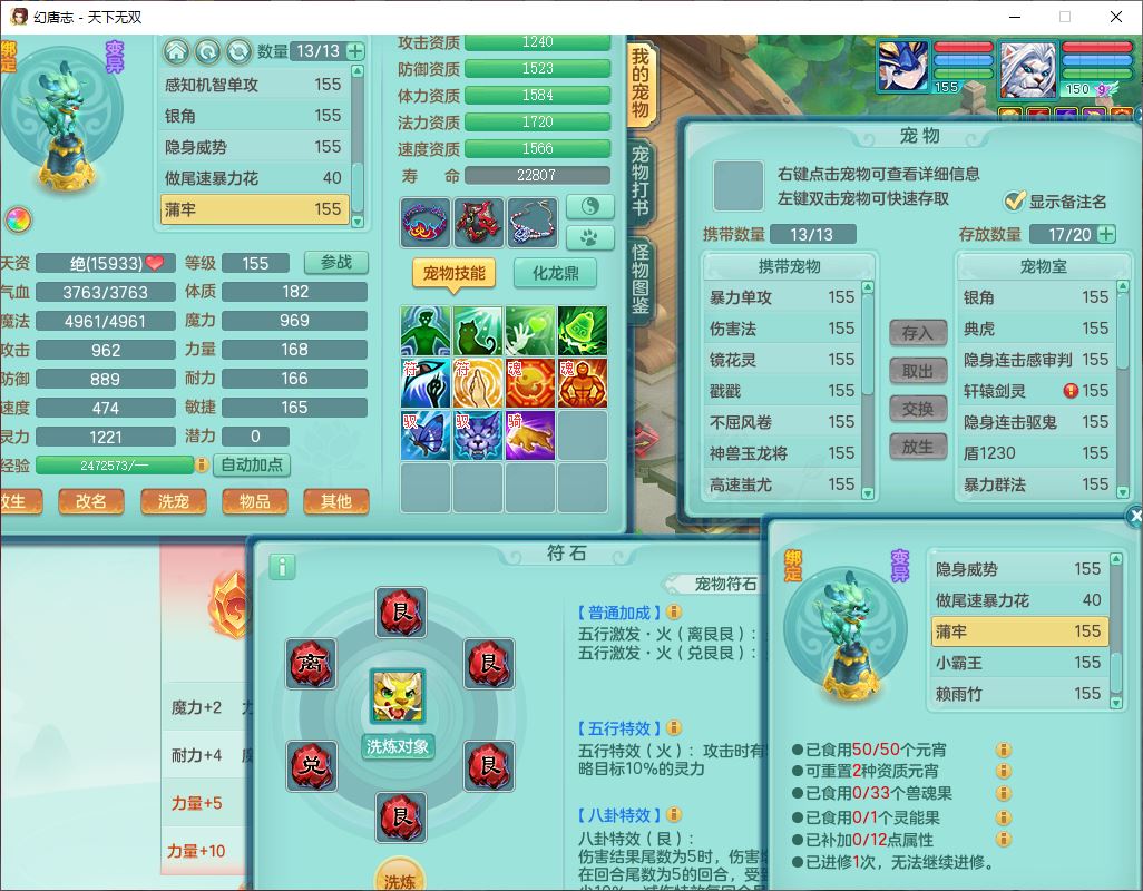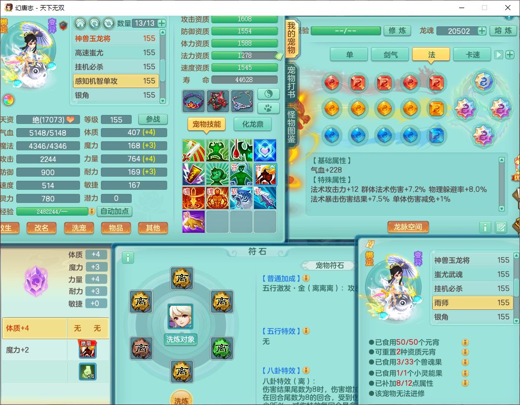 tx10323天下无双159男万兽【马上发财+火焰之力】精灵歌,1内(带蛇影,破境)3镜花(1胚子)4特殊(勇猛、风卷、影袭,兽决破碎)1龙姬,3觉醒1六字12四字,8红装备,Y破血帽子,单加Y武器,坚毅移魂项链,Y破魔鞋子,可搭一套8红法系装,五雷武器,法爆武器,躲避Y衣服,愤怒腰带,法缭鞋子,鼎4.5+70,84天月卡,24个内丹碎片,仓库多护符存货,1双人飞行坐骑,带154奶粉魔王,带双重可换绑
