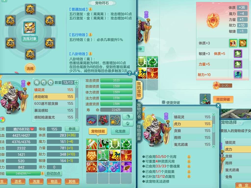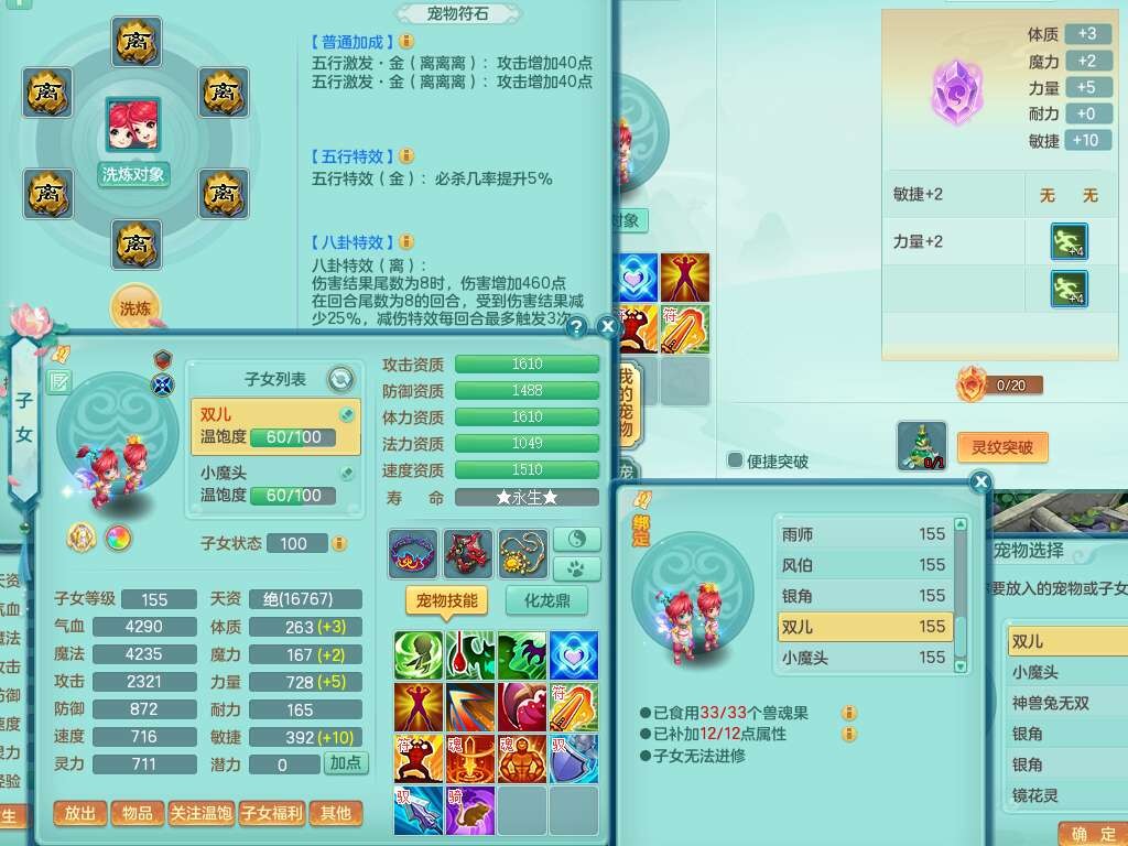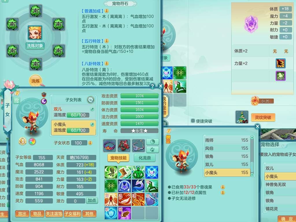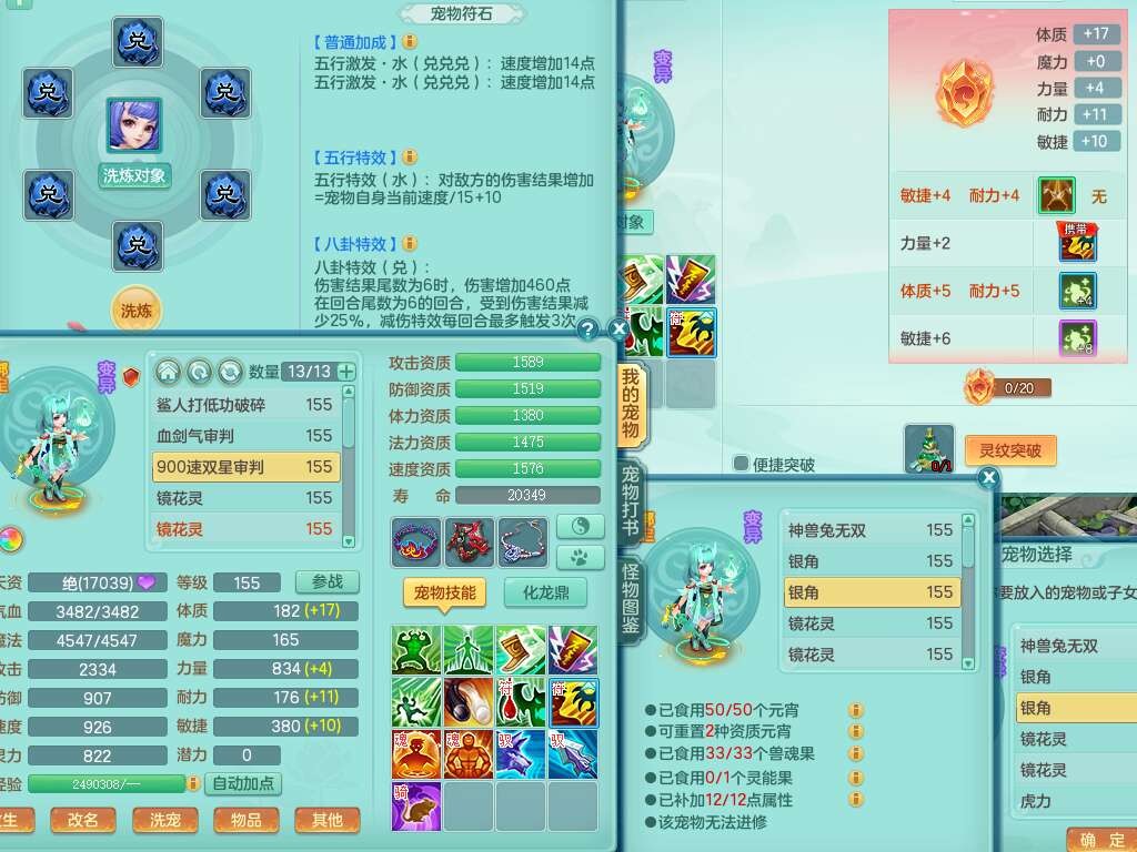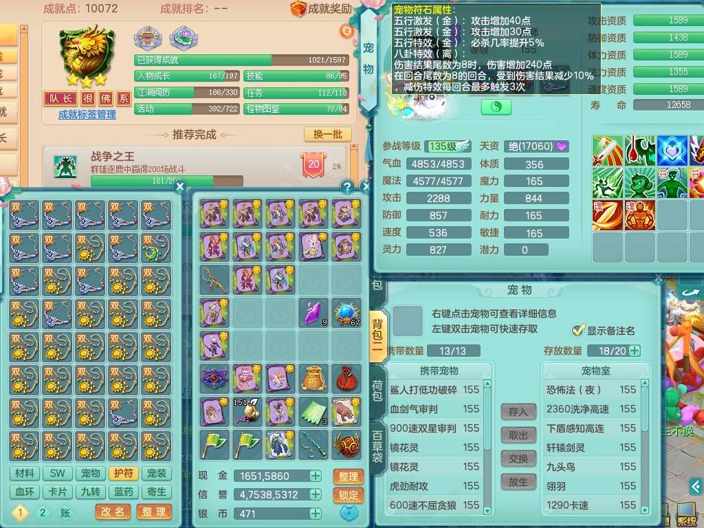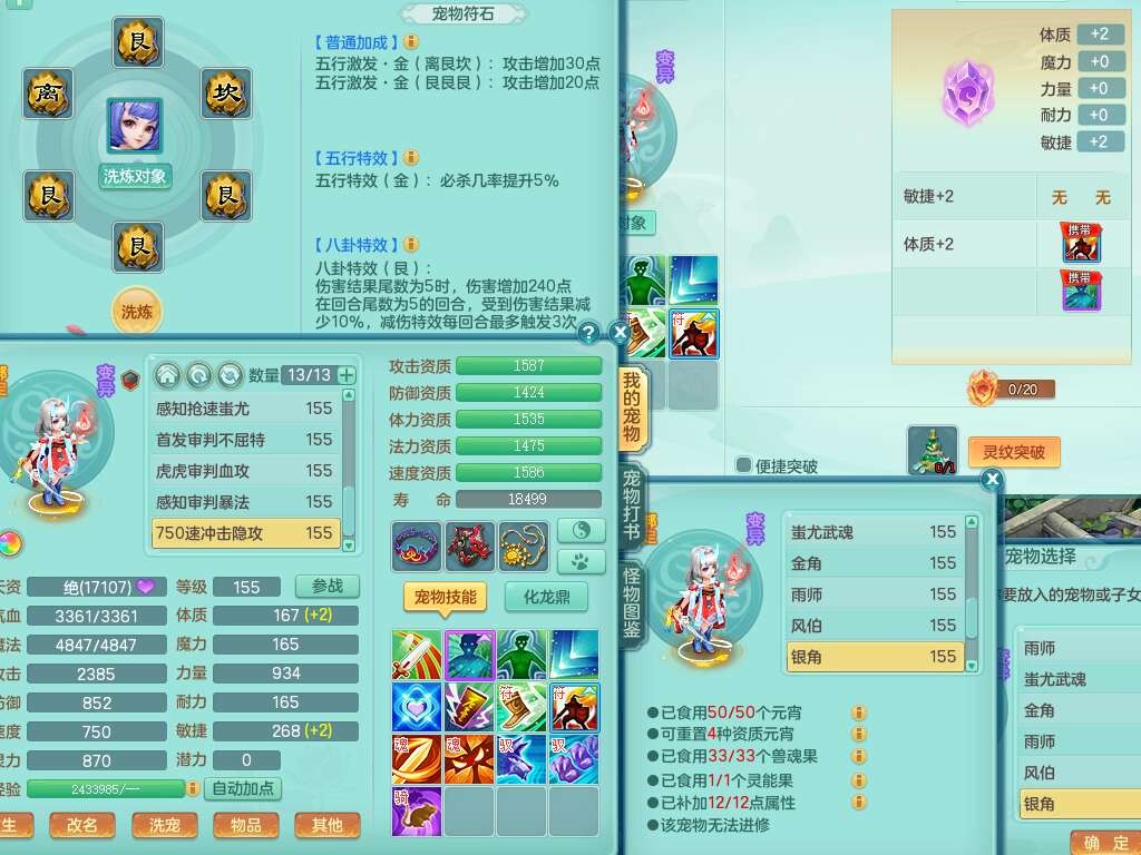 a22237风驰电掣159男万兽,精灵舞,1内胆神,背包67仙兽蛋,6只觉醒(5只潜龙BB),5特殊(号角,夺命,虎虎×2,双星),2只六技能镜花灵,易成长群体疾速单加51头,坚毅单加链子,易成长单加53腰带,易成长单加56鞋子,5.0基础鼎+70攻,11个纯六字(1坎,2乾,7离),1个五字,19只满果子。带2个150+奶粉。