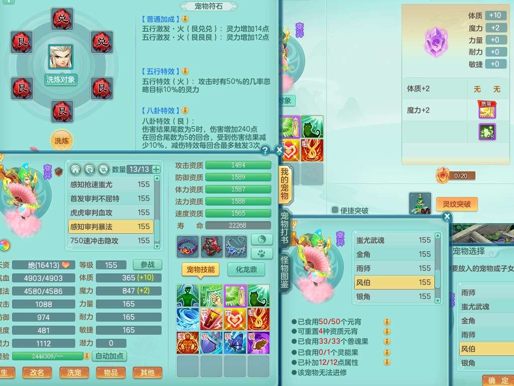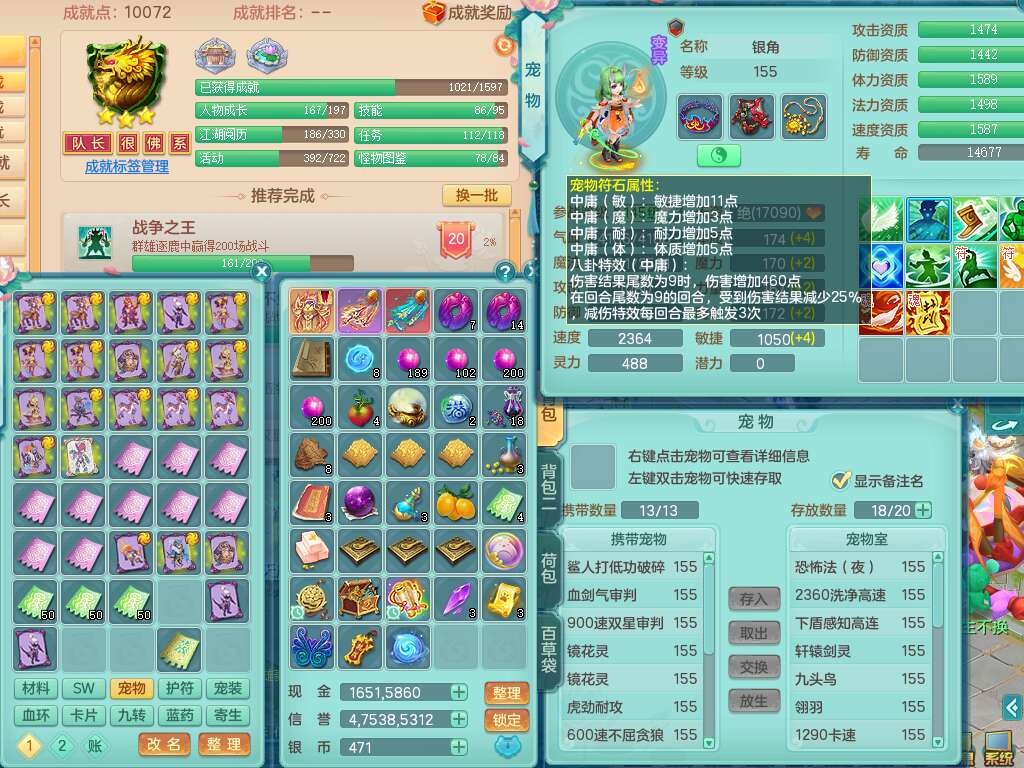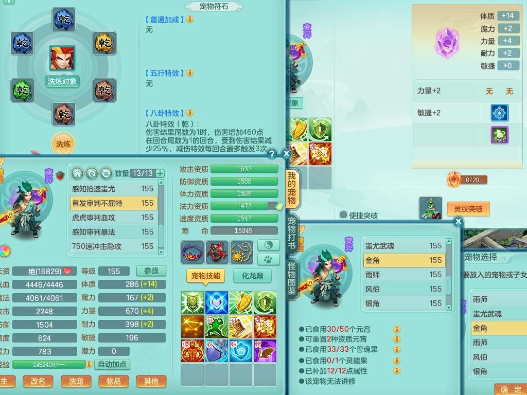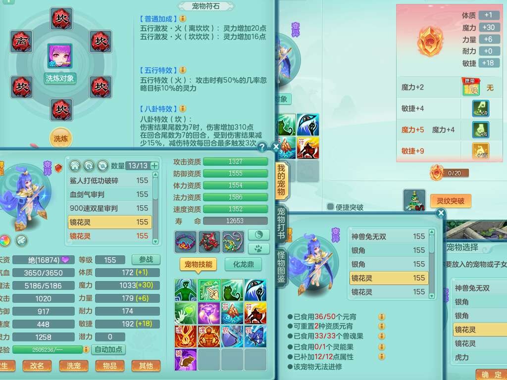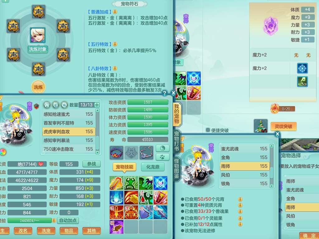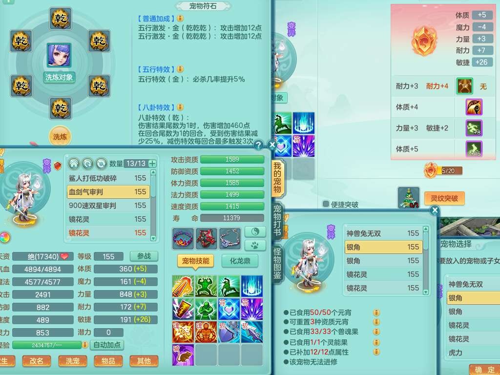 a22237风驰电掣159男万兽,精灵舞,1内胆神,背包67仙兽蛋,6只觉醒(5只潜龙BB),5特殊(号角,夺命,虎虎×2,双星),2只六技能镜花灵,易成长群体疾速单加51头,坚毅单加链子,易成长单加53腰带,易成长单加56鞋子,5.0基础鼎+70攻,11个纯六字(1坎,2乾,7离),1个五字,19只满果子。带2个150+奶粉。
