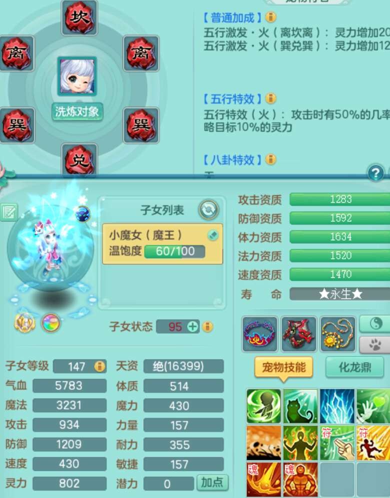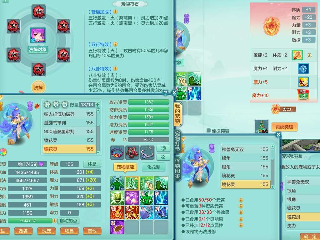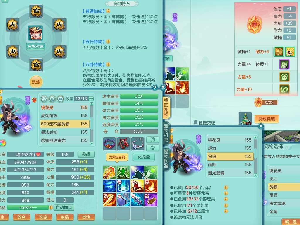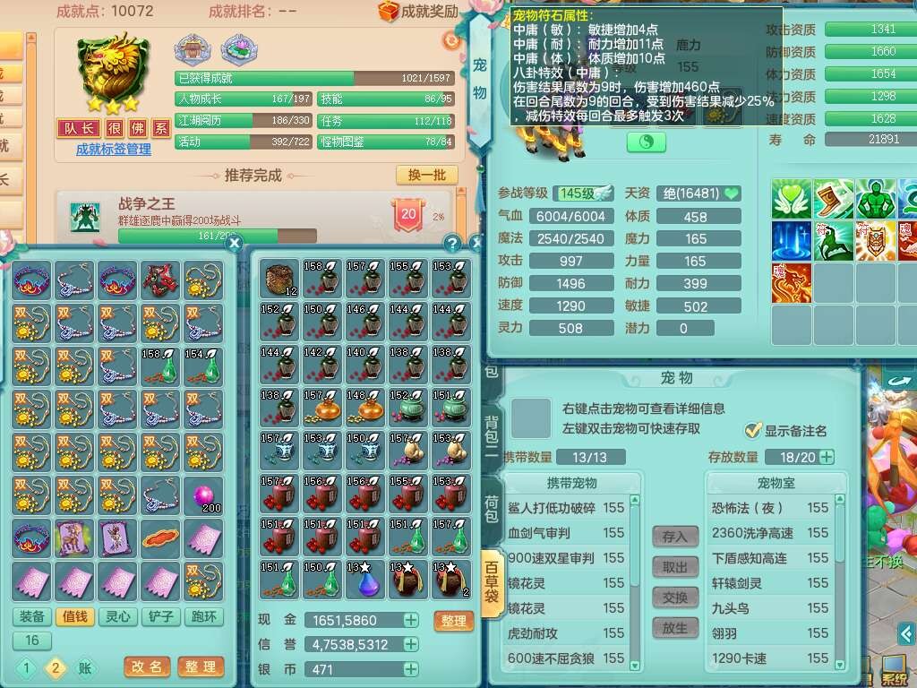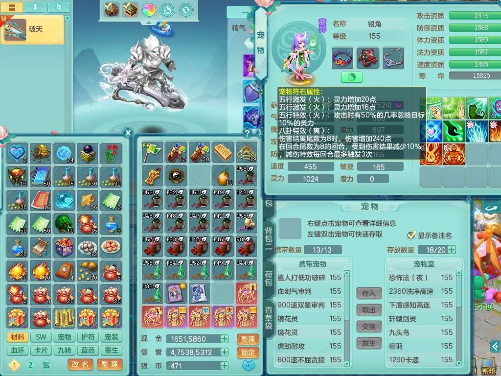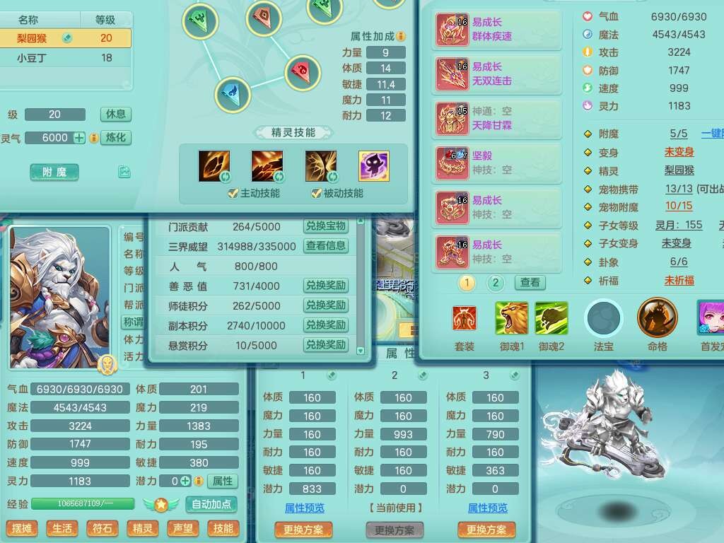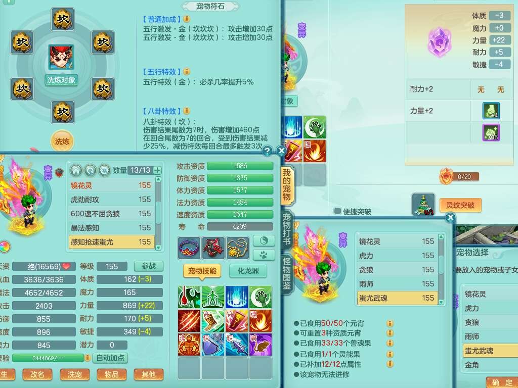 a22237风驰电掣159男万兽,精灵舞,1内胆神,背包67仙兽蛋,6只觉醒(5只潜龙BB),5特殊(号角,夺命,虎虎×2,双星),2只六技能镜花灵,易成长群体疾速单加51头,坚毅单加链子,易成长单加53腰带,易成长单加56鞋子,5.0基础鼎+70攻,11个纯六字(1坎,2乾,7离),1个五字,19只满果子。带2个150+奶粉。