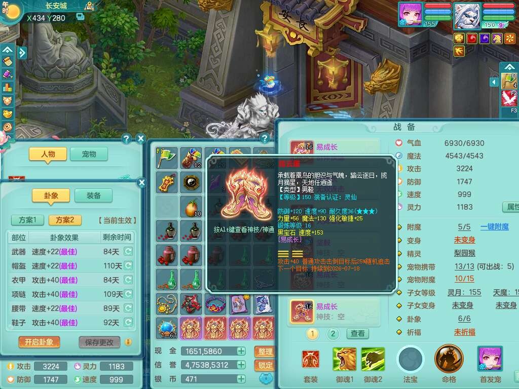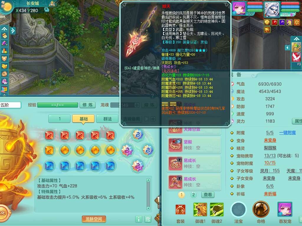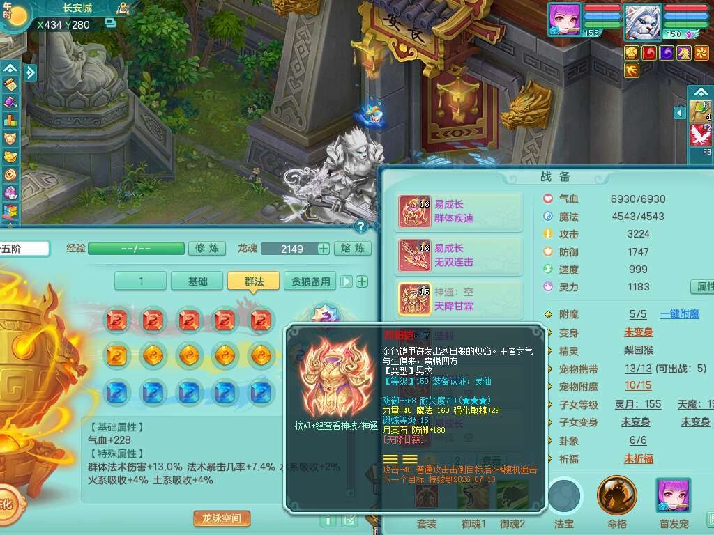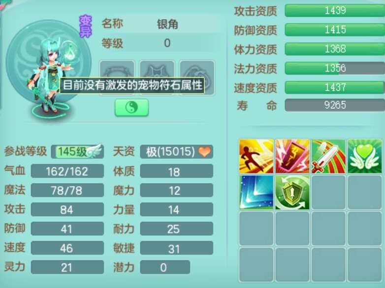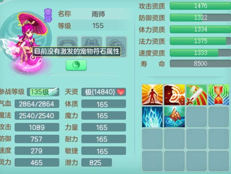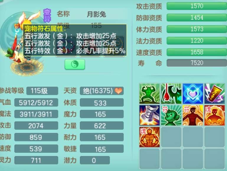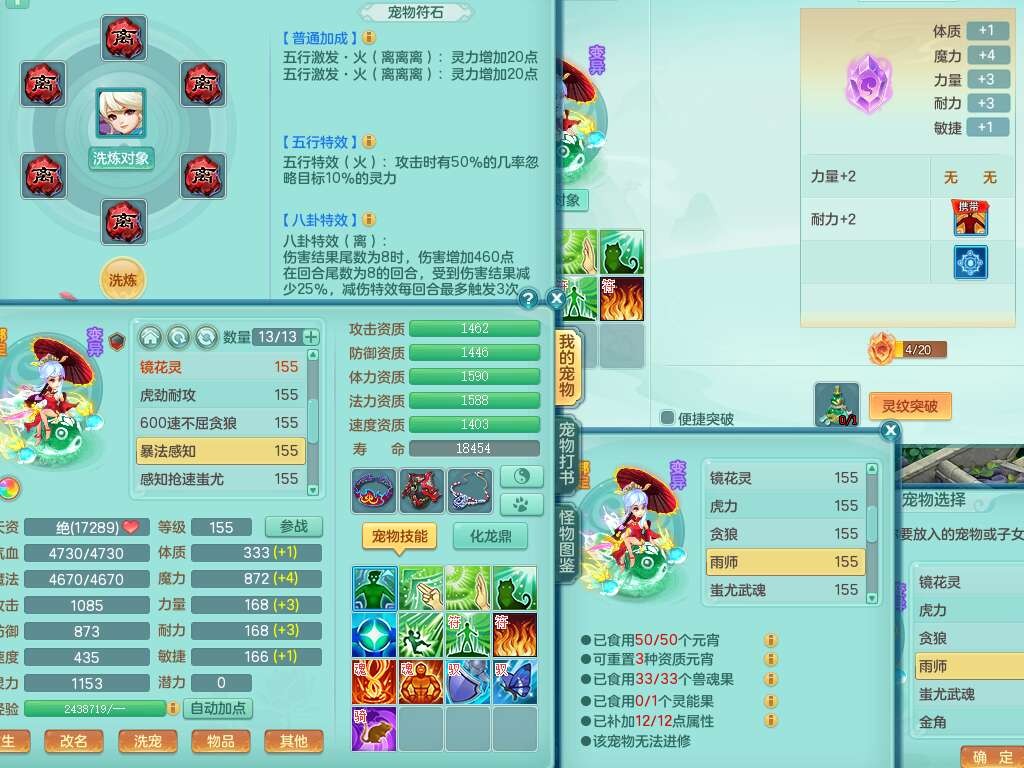 a22237风驰电掣159男万兽,精灵舞,1内胆神,背包67仙兽蛋,6只觉醒(5只潜龙BB),5特殊(号角,夺命,虎虎×2,双星),2只六技能镜花灵,易成长群体疾速单加51头,坚毅单加链子,易成长单加53腰带,易成长单加56鞋子,5.0基础鼎+70攻,11个纯六字(1坎,2乾,7离),1个五字,19只满果子。带2个150+奶粉。