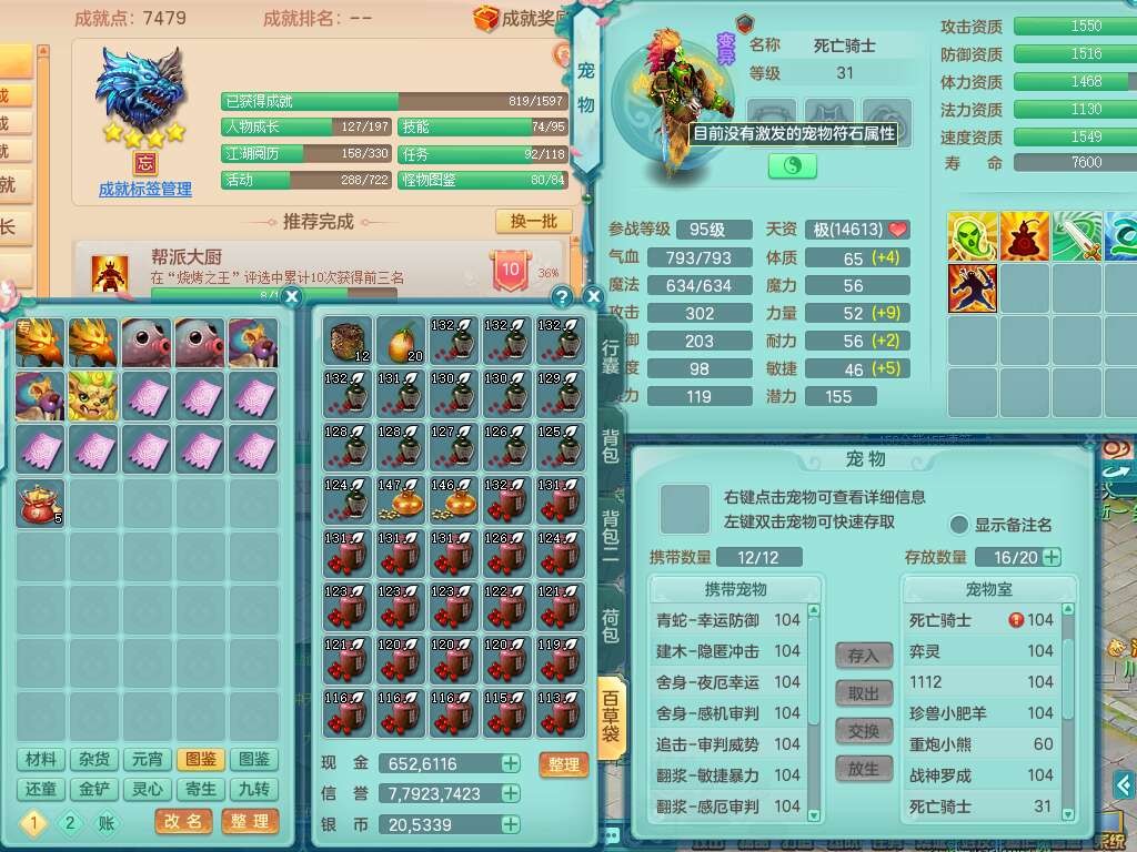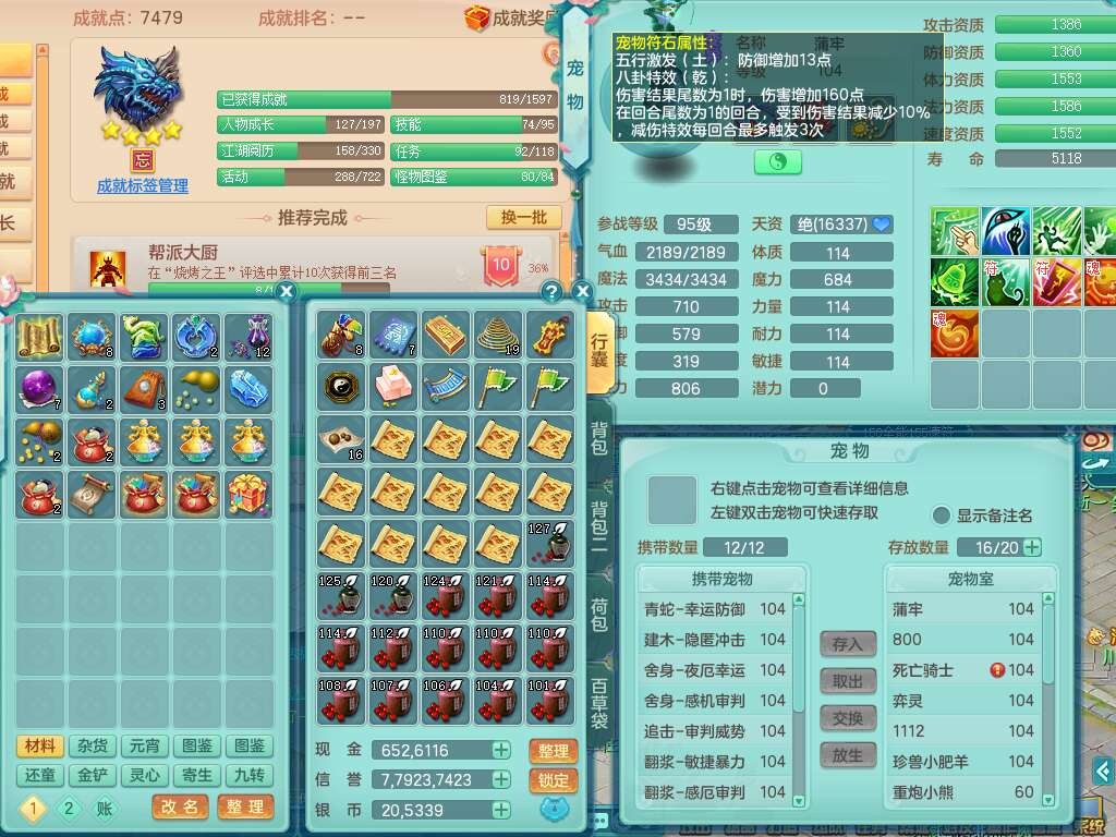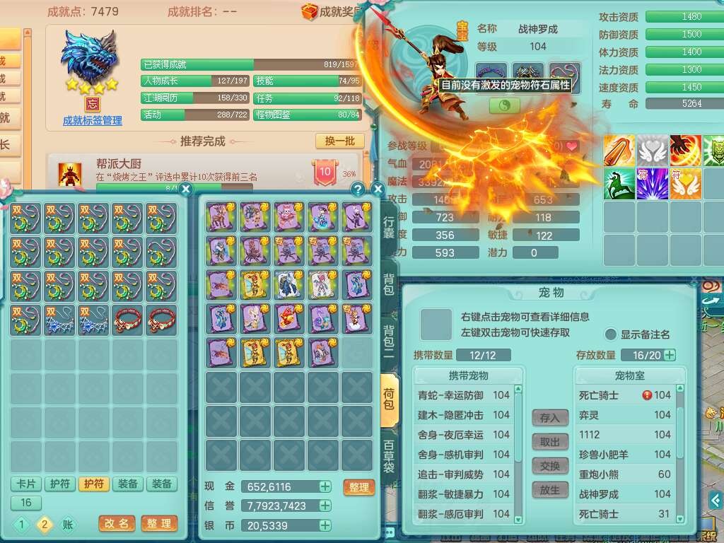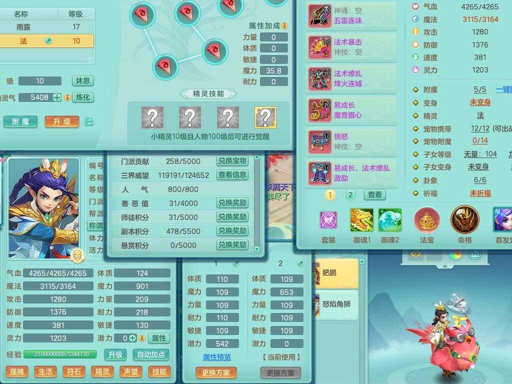 p22229笑傲江湖99男龙宫,1神兽青蛇(背包48神兽内丹碎片),2只觉醒,星辰之拥,五雷单加33头,556法爆武器,法缭烽火衣服,160易成长魔音单加30链子,愤怒单加33腰带,三红易成长法缭激励鞋子,第2套有物理装备,537易成长破血单加35武器,崩山单加34衣服,神佑链子,迅捷单加32鞋子,9只满果子,月卡还有109天。➕99男普陀,1神兽青蛇,愤怒六特,带1196金币,月卡还有19天。➕99女魔王,1神兽,崩山单加34头,易成长烽火单加31腰带,带1302金币,月卡还有19天。