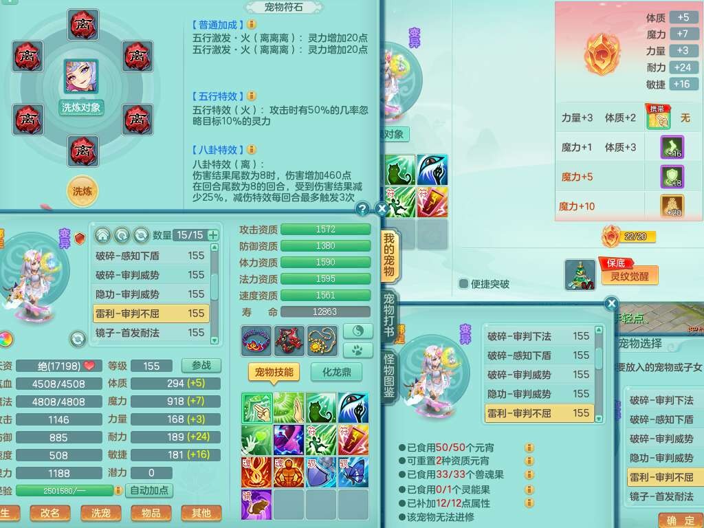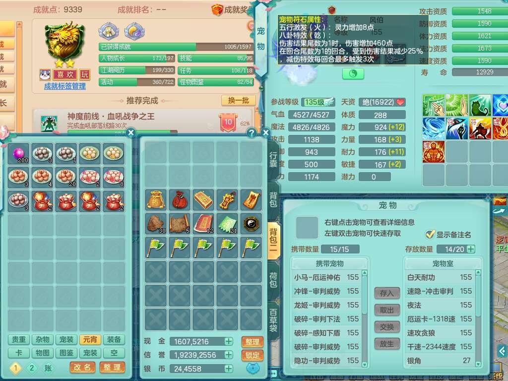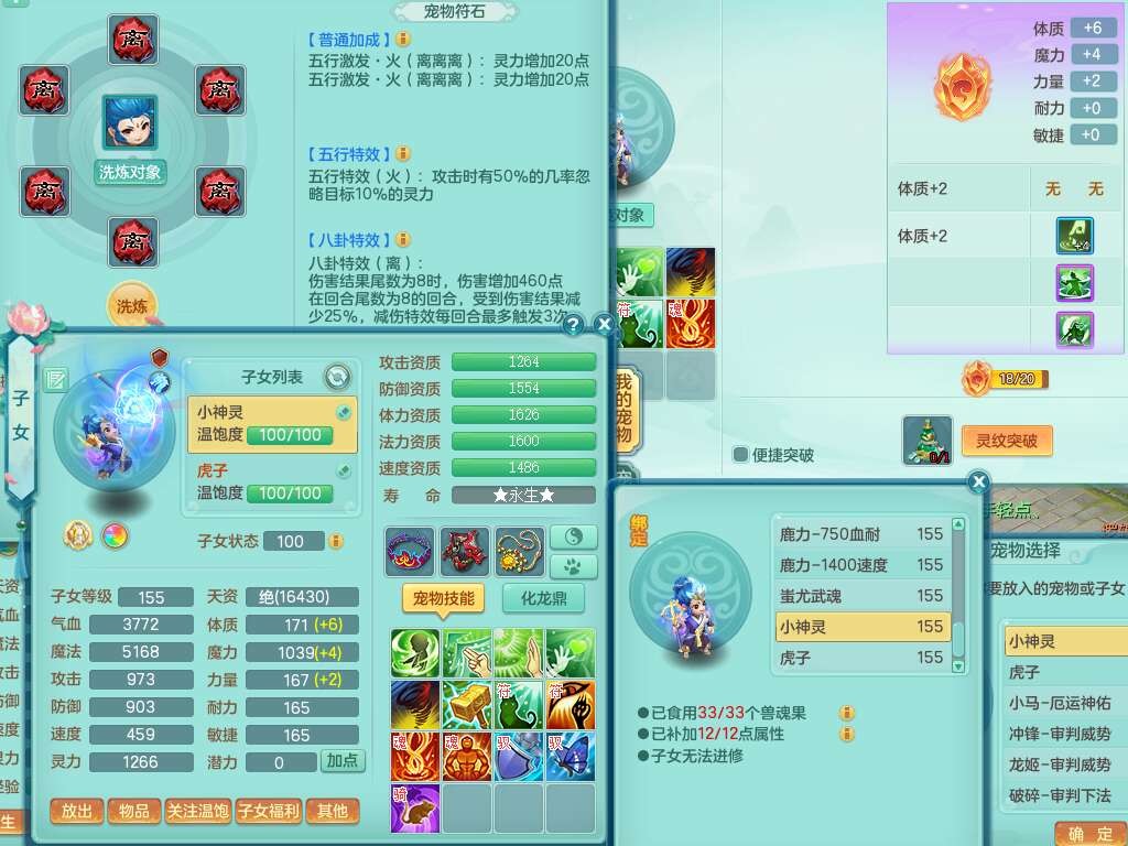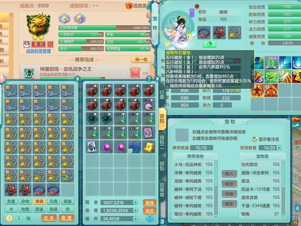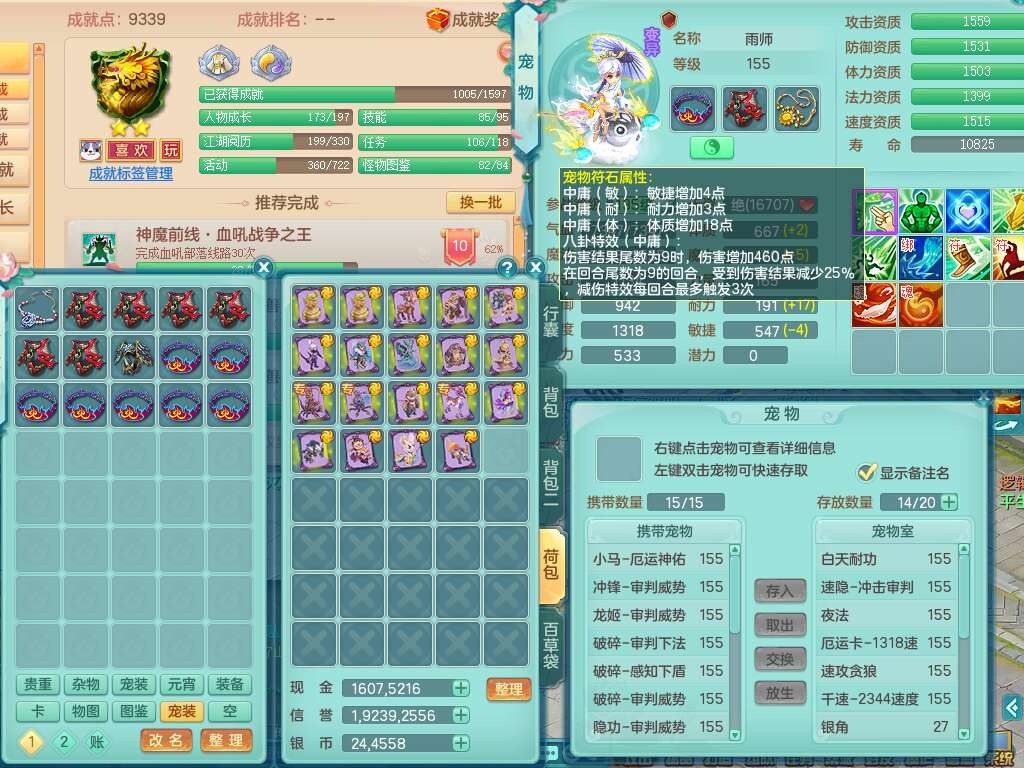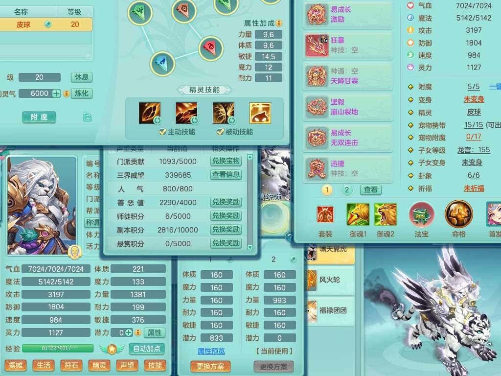 a22231任剑逍遥159男万兽,精灵歌,1内胆神,8只觉醒(潜龙条件宠物满足,符石差2个主要属性,化龙鼎差2个厚土龙纹和5.5鼎),6宠皮,4特殊(勇猛,锤子2,雷厉),1只6技能龙姬,3只6技能镜花灵,易成长激励单加56头,906狂暴单加武器,坚毅崩山链子,易成长破血单加55腰带,迅捷单加鞋子,5.0基础鼎+70攻,12个纯六字,19只满果子,宠排在榜,双人老虎,福禄团团坐骑,月卡还有42天。