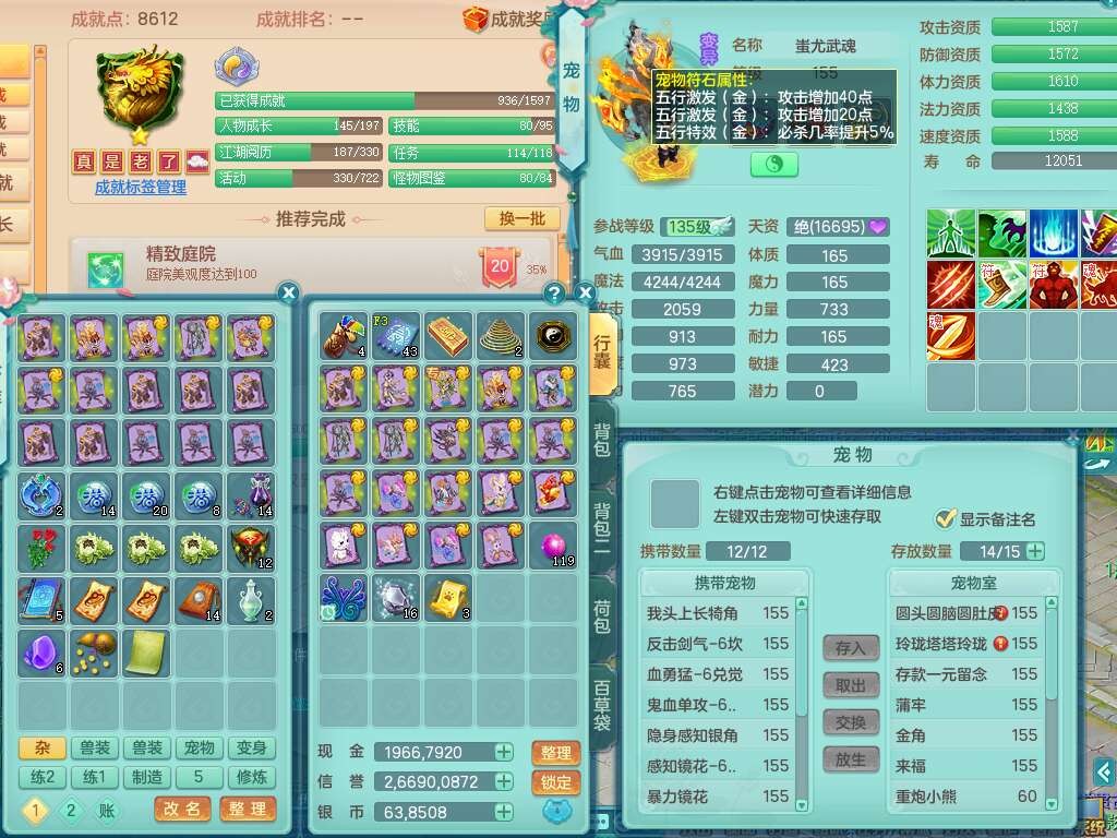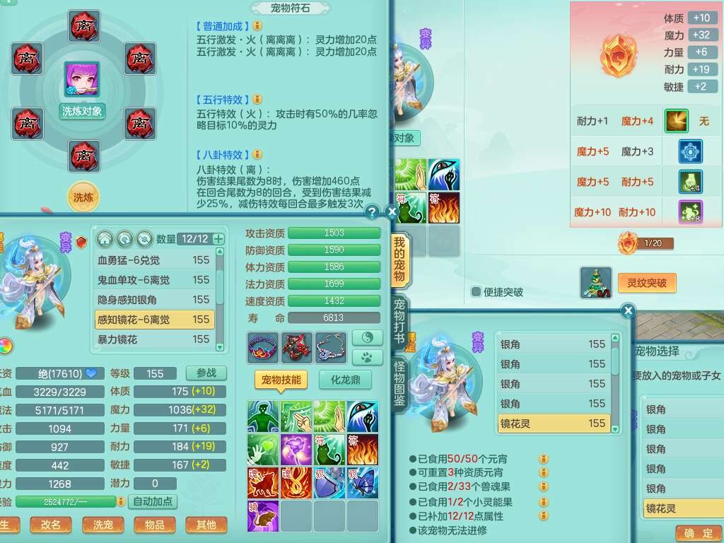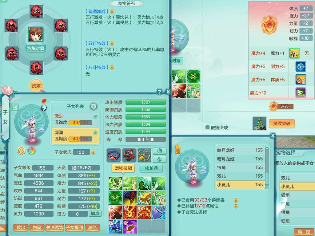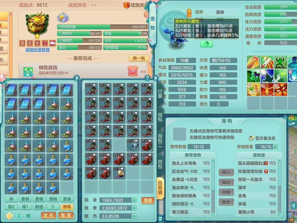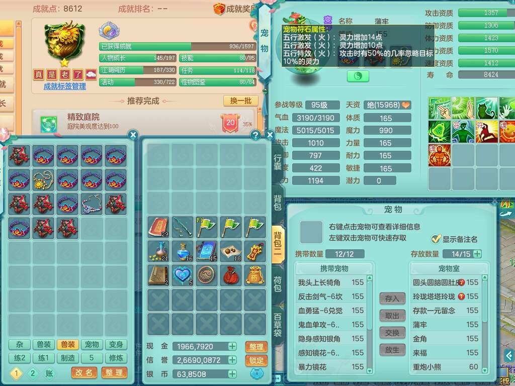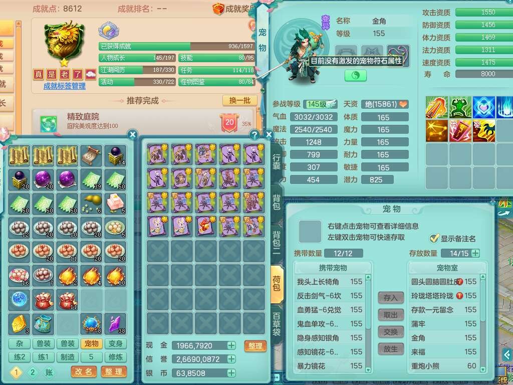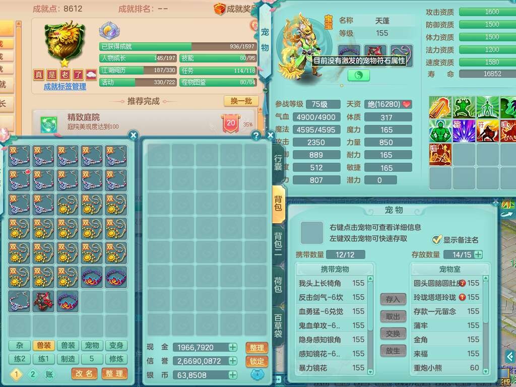 a22227风驰电掣159男万兽,精灵歌,6只觉醒,1特殊(勇猛),2只6技能镜花灵,3只6技能龙姬,易成长单加52头,狂暴单加52武器,三红易成长强壮归神诀单加衣服,神佑单加链子,崩山单加56腰带,有913易成长单加50武器,7个纯六字,综合8只满果子,背包38神兽内丹碎片,双人坐骑。➕159女盘丝,精灵舞,1神兽小马(仓库47神兽内丹碎片),1只觉醒,1只6技能镜花灵,1只6技能龙姬,愤怒单加56腰带。➕154女无量,1神兽小马(仓库22神兽内丹碎片),4.5基础鼎。