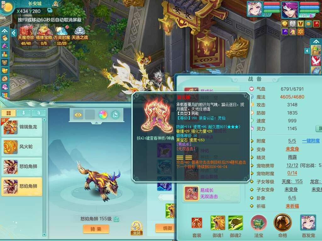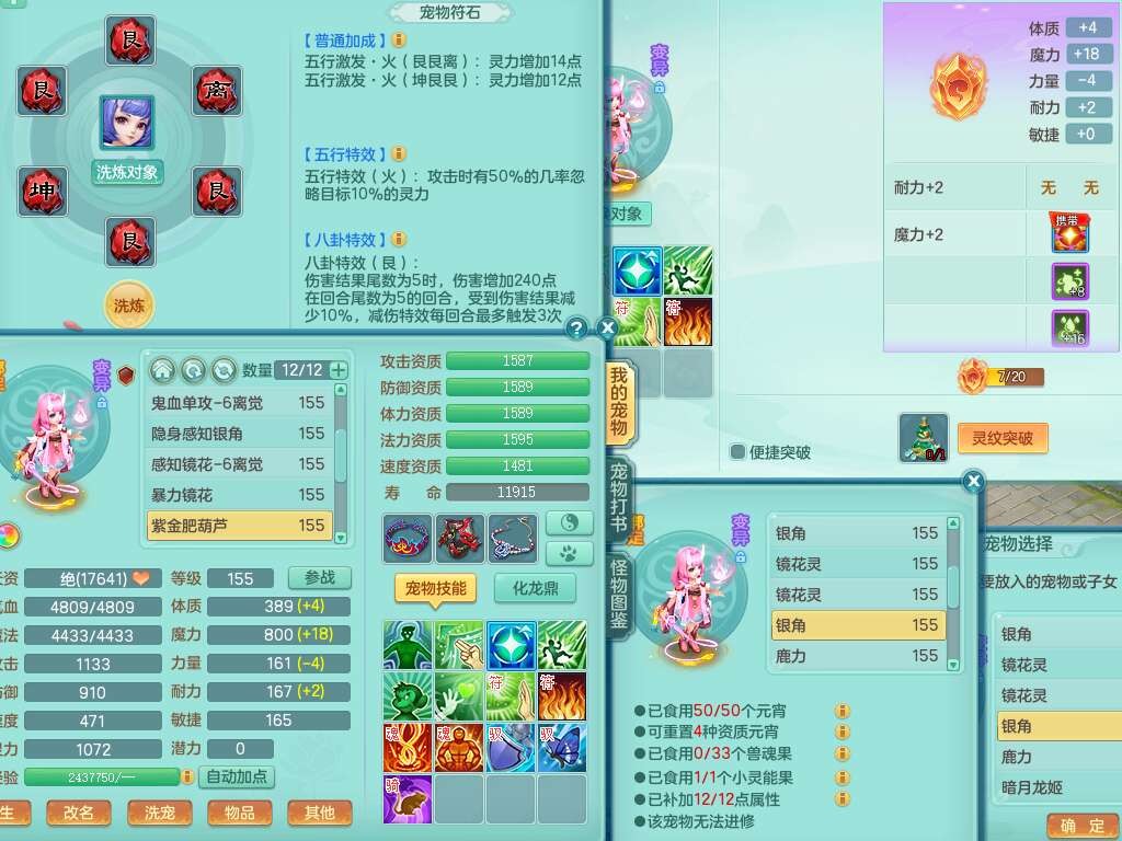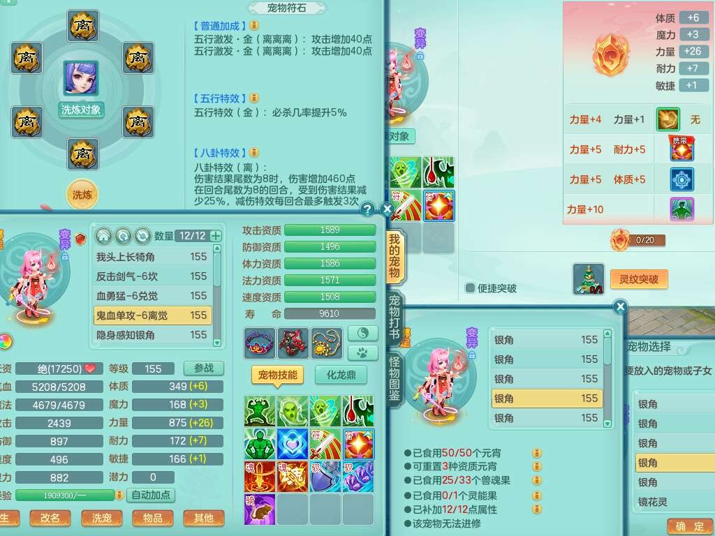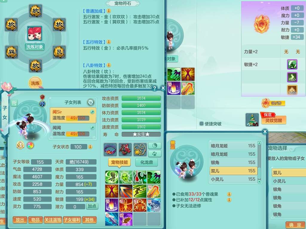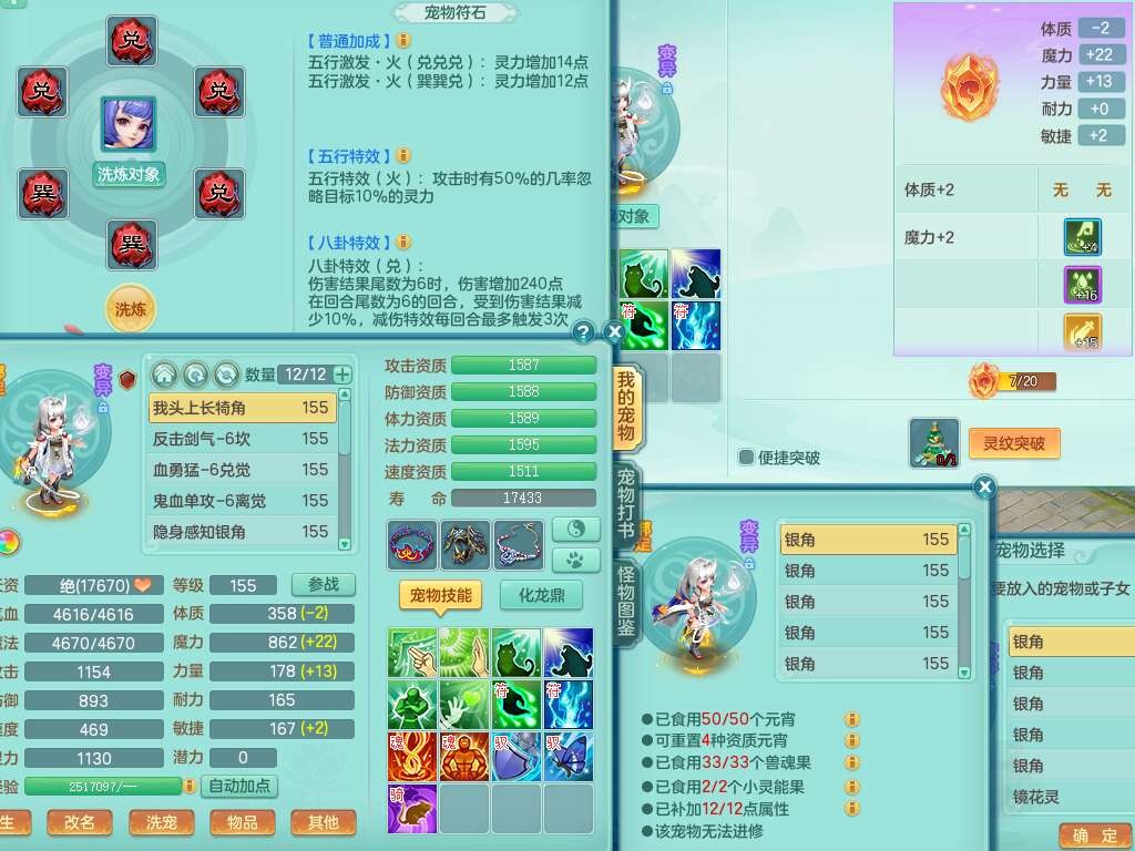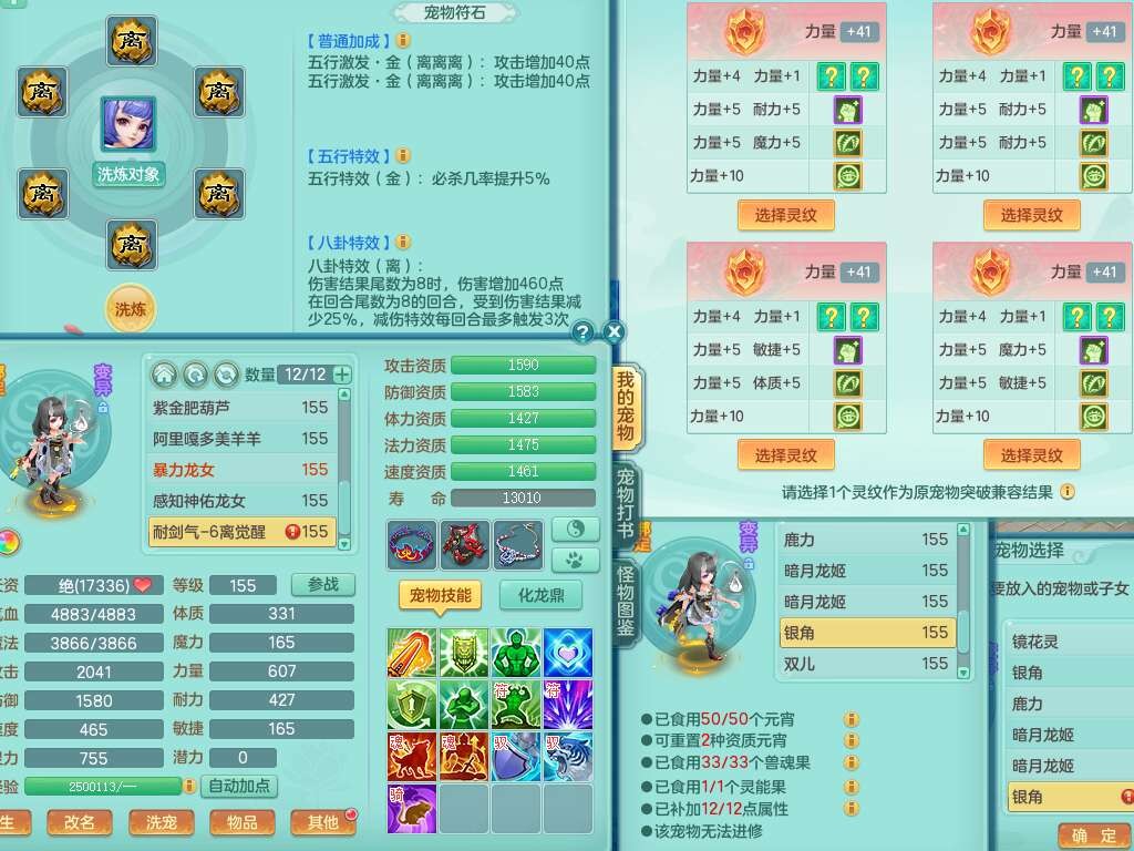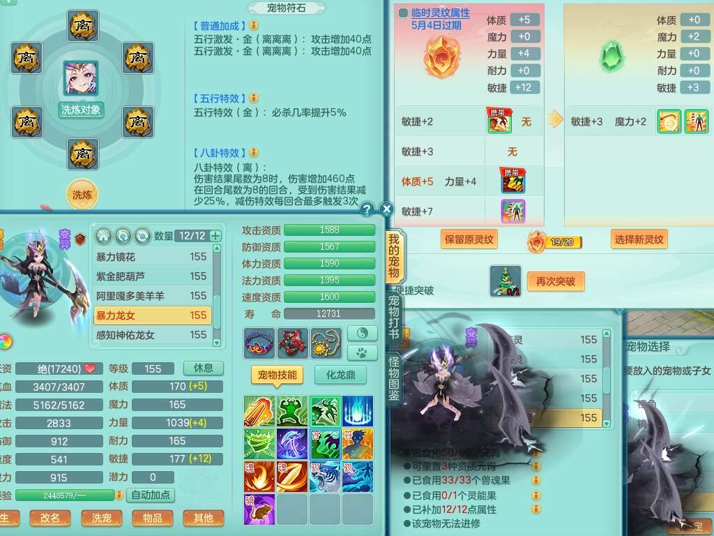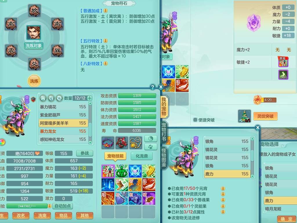 a22227风驰电掣159男万兽,精灵歌,6只觉醒,1特殊(勇猛),2只6技能镜花灵,3只6技能龙姬,易成长单加52头,狂暴单加52武器,三红易成长强壮归神诀单加衣服,神佑单加链子,崩山单加56腰带,有913易成长单加50武器,7个纯六字,综合8只满果子,背包38神兽内丹碎片,双人坐骑。➕159女盘丝,精灵舞,1神兽小马(仓库47神兽内丹碎片),1只觉醒,1只6技能镜花灵,1只6技能龙姬,愤怒单加56腰带。➕154女无量,1神兽小马(仓库22神兽内丹碎片),4.5基础鼎。