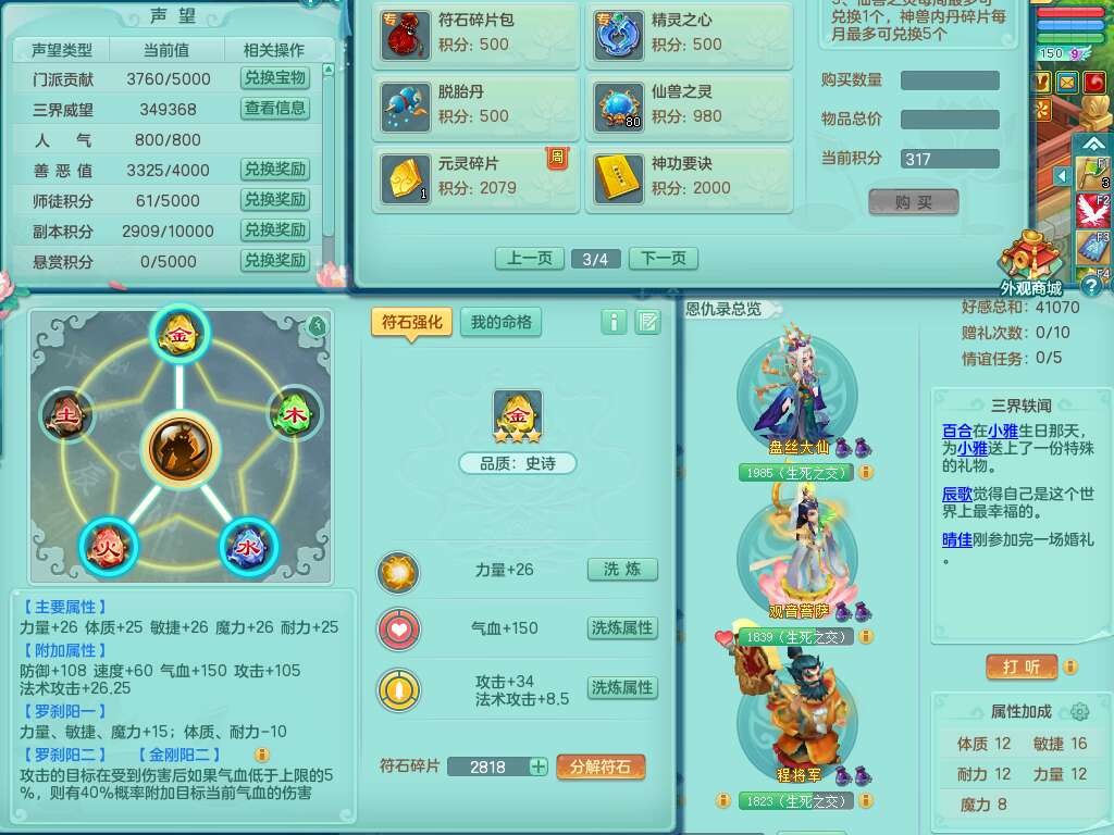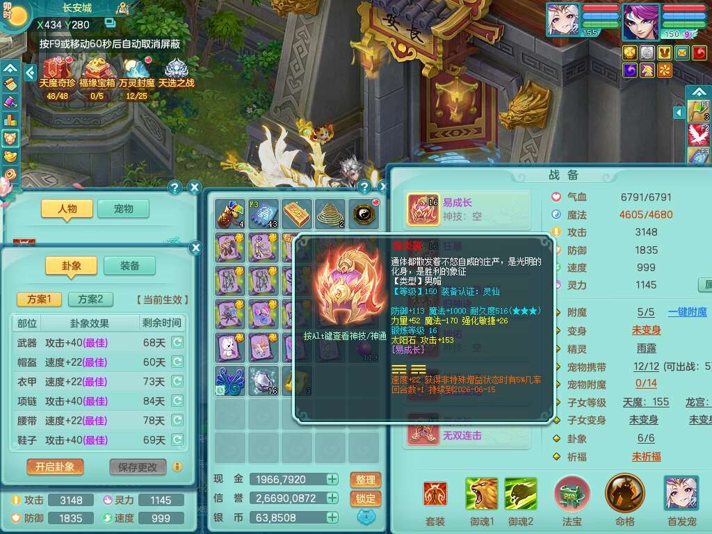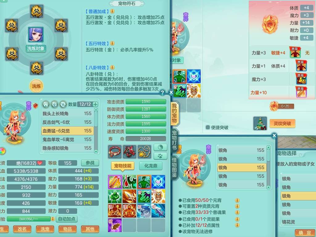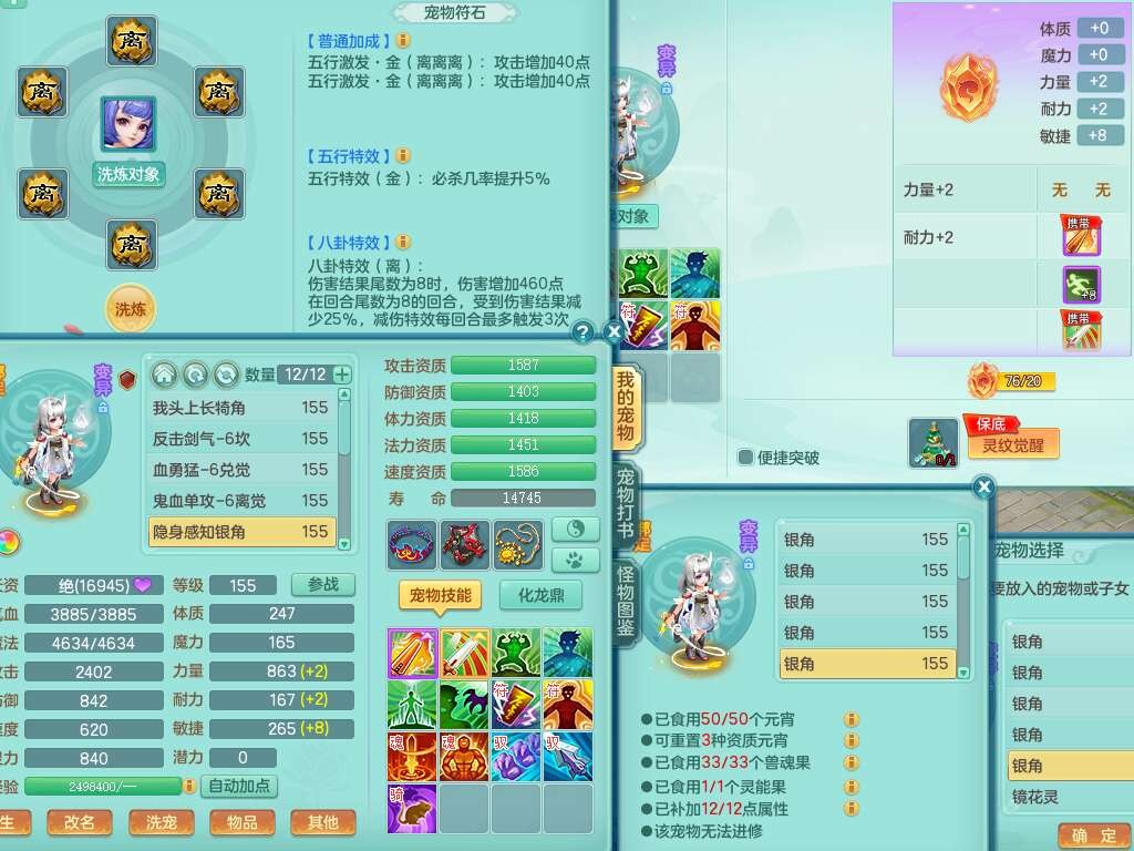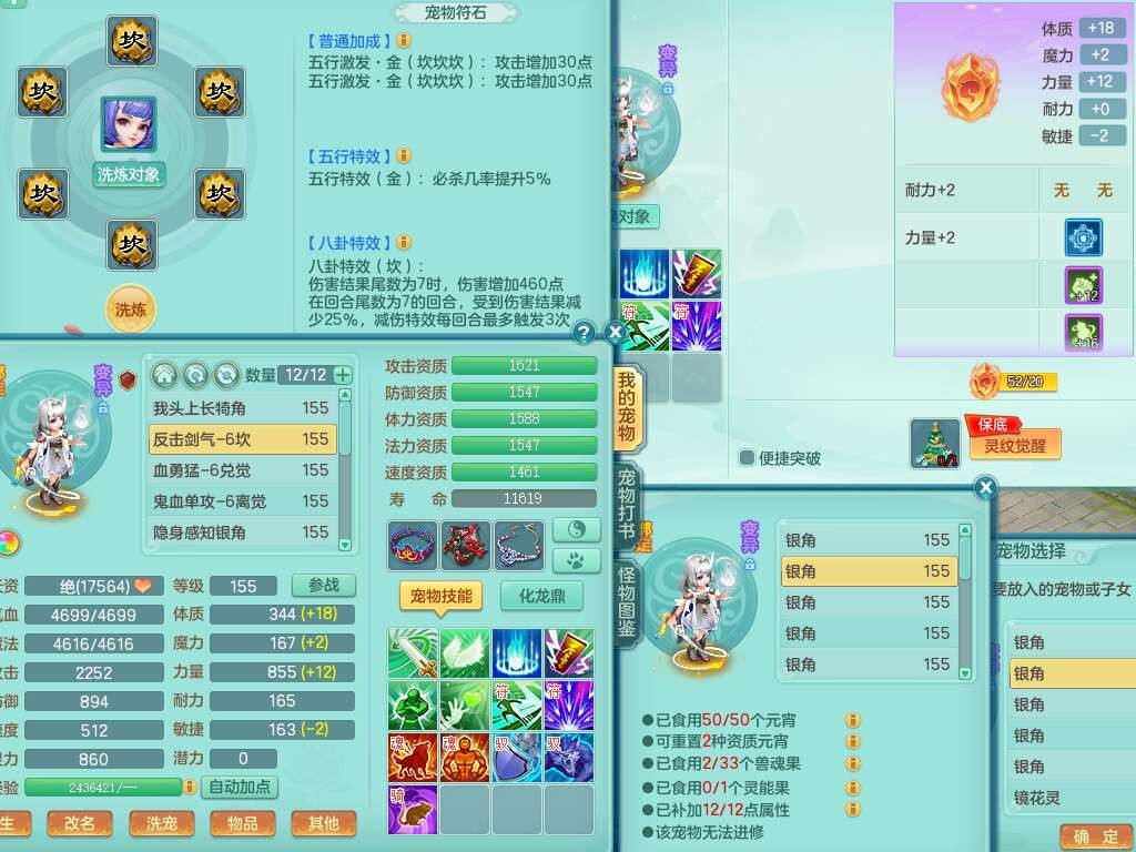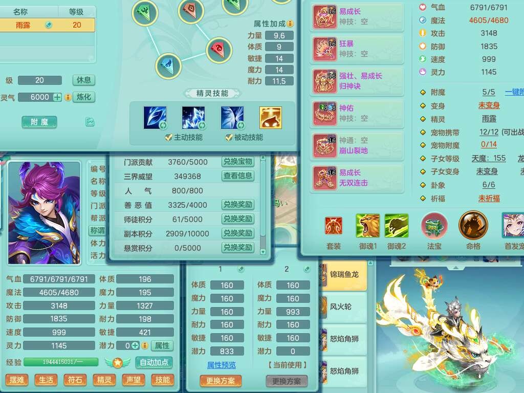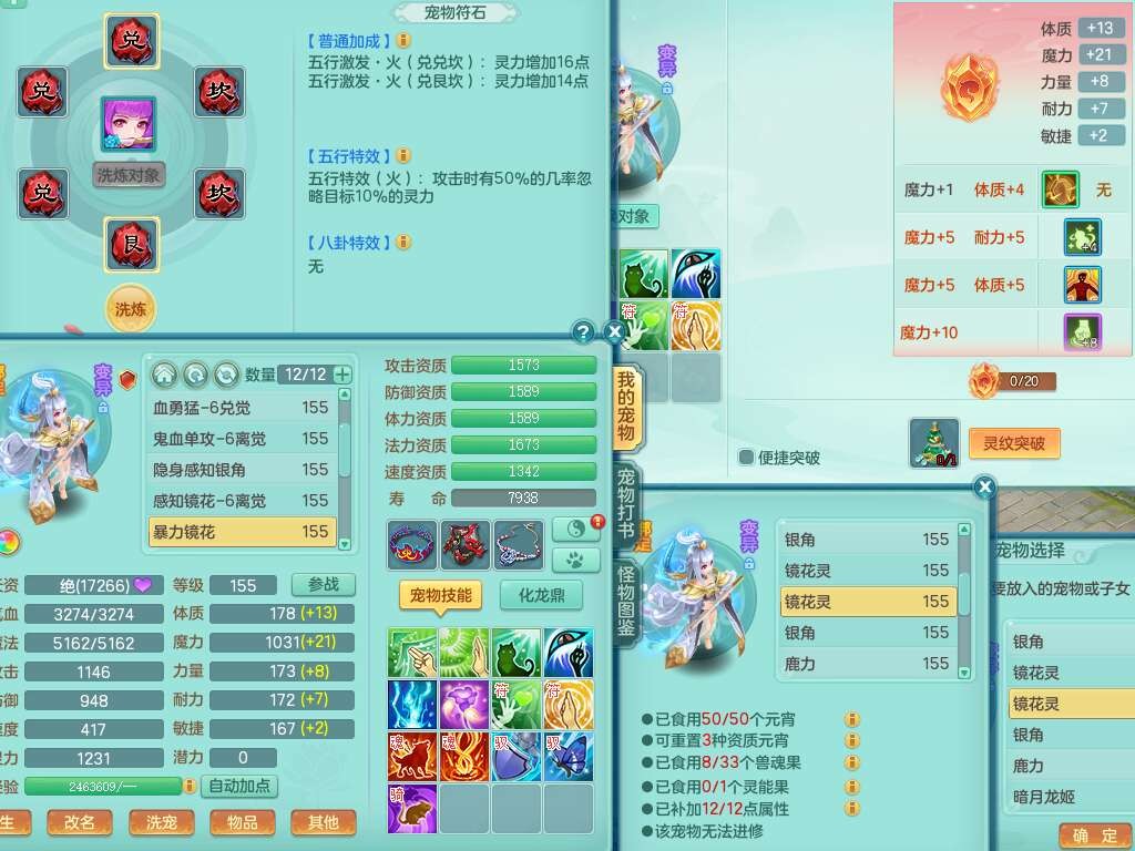 a22227风驰电掣159男万兽,精灵歌,6只觉醒,1特殊(勇猛),2只6技能镜花灵,3只6技能龙姬,易成长单加52头,狂暴单加52武器,三红易成长强壮归神诀单加衣服,神佑单加链子,崩山单加56腰带,有913易成长单加50武器,7个纯六字,综合8只满果子,背包38神兽内丹碎片,双人坐骑。➕159女盘丝,精灵舞,1神兽小马(仓库47神兽内丹碎片),1只觉醒,1只6技能镜花灵,1只6技能龙姬,愤怒单加56腰带。➕154女无量,1神兽小马(仓库22神兽内丹碎片),4.5基础鼎。