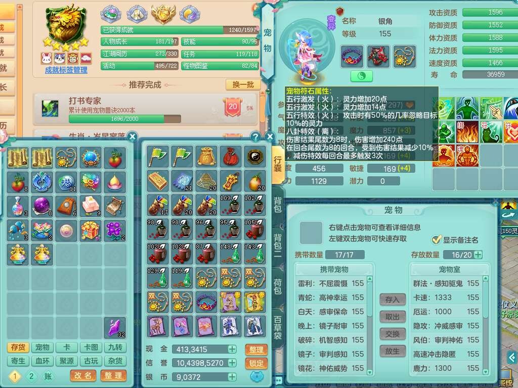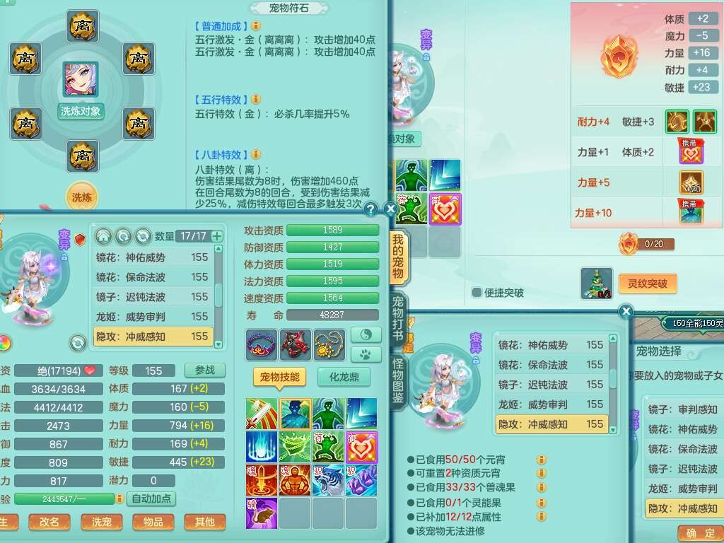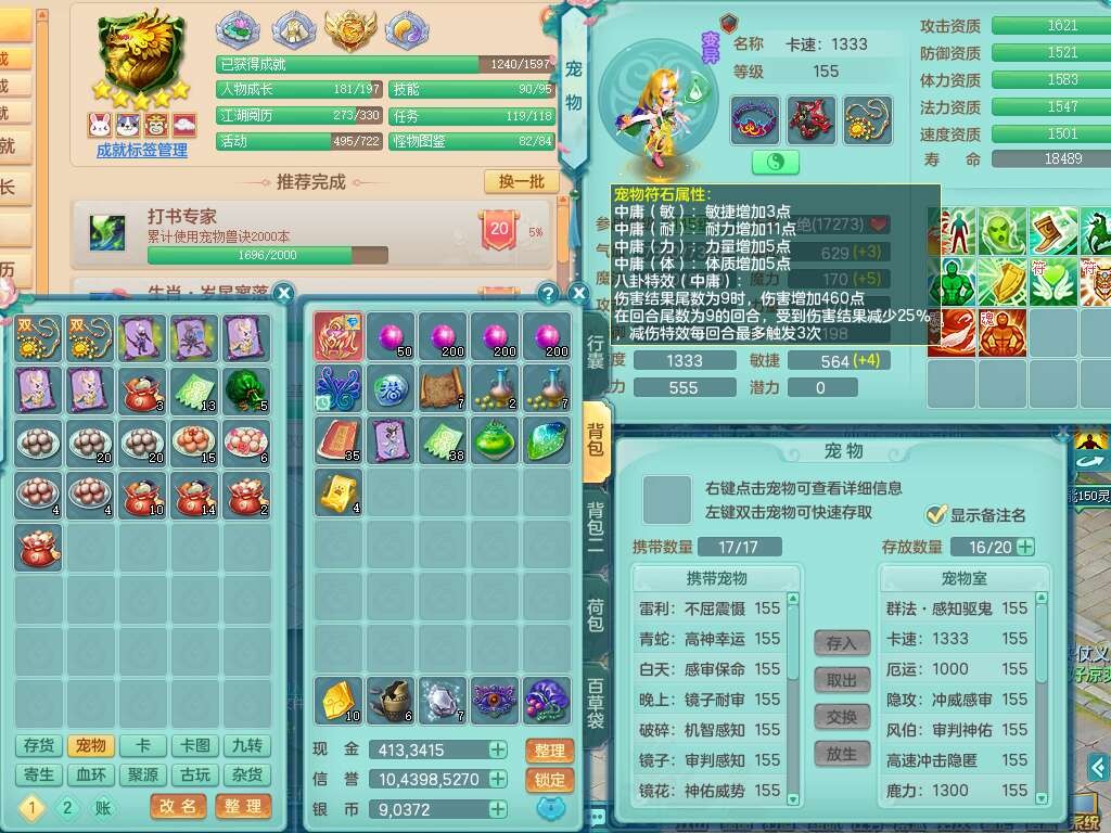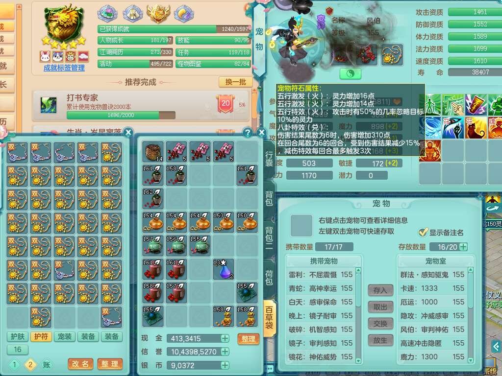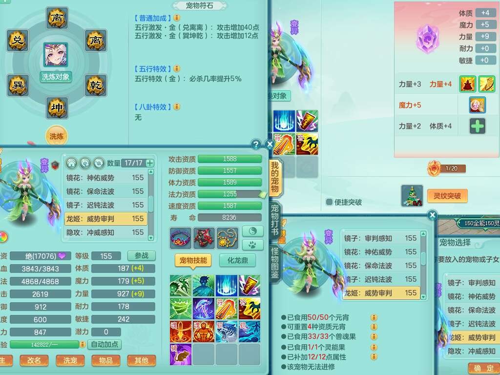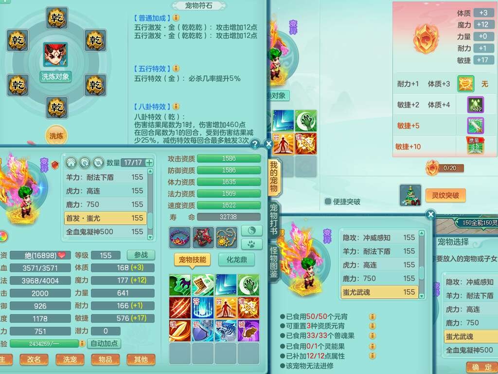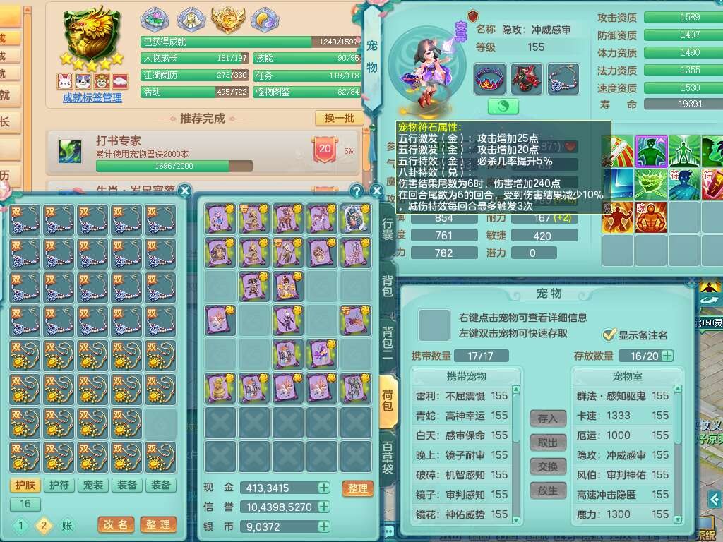 K22220战无不胜159男普陀,精灵舞,1龙1内胆神,【9只觉醒,已潜龙】,1宠皮,5只六技能镜花灵,1只六技能龙姬,2特殊(影袭,虎虎),愤怒六特,有物理装备,913狂暴卸甲单加武器,神佑单加项链,崩山衣服,5.5基础鼎+70攻+280血,差759积分换永久15格子,7个纯六字,22只满果子,背包32神兽内丹碎片,宠排在榜,成就在榜,暴龙泰坦+西瓜冰武器皮肤,带68天月卡。