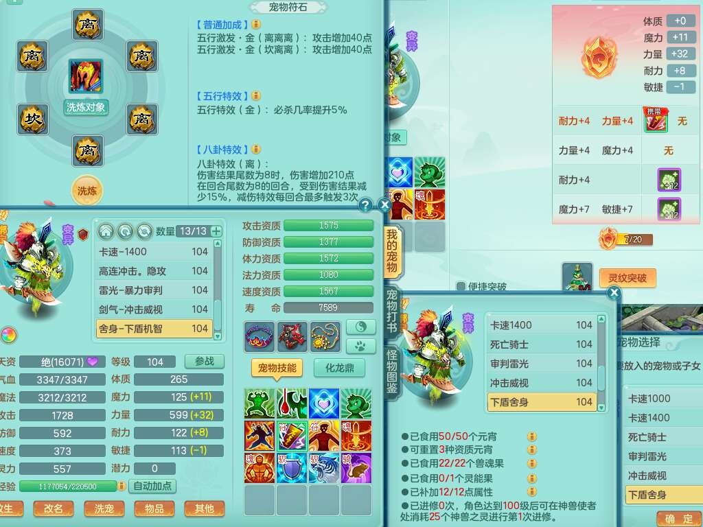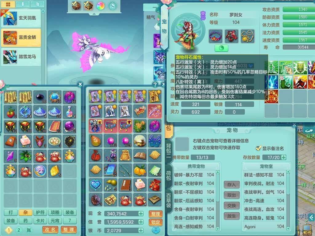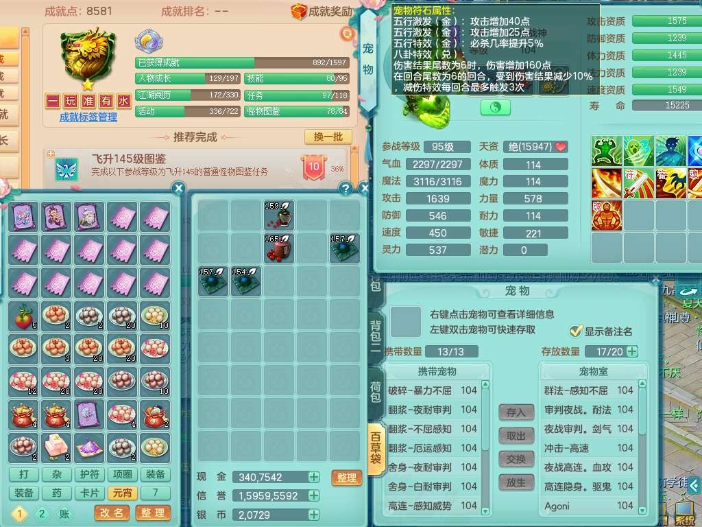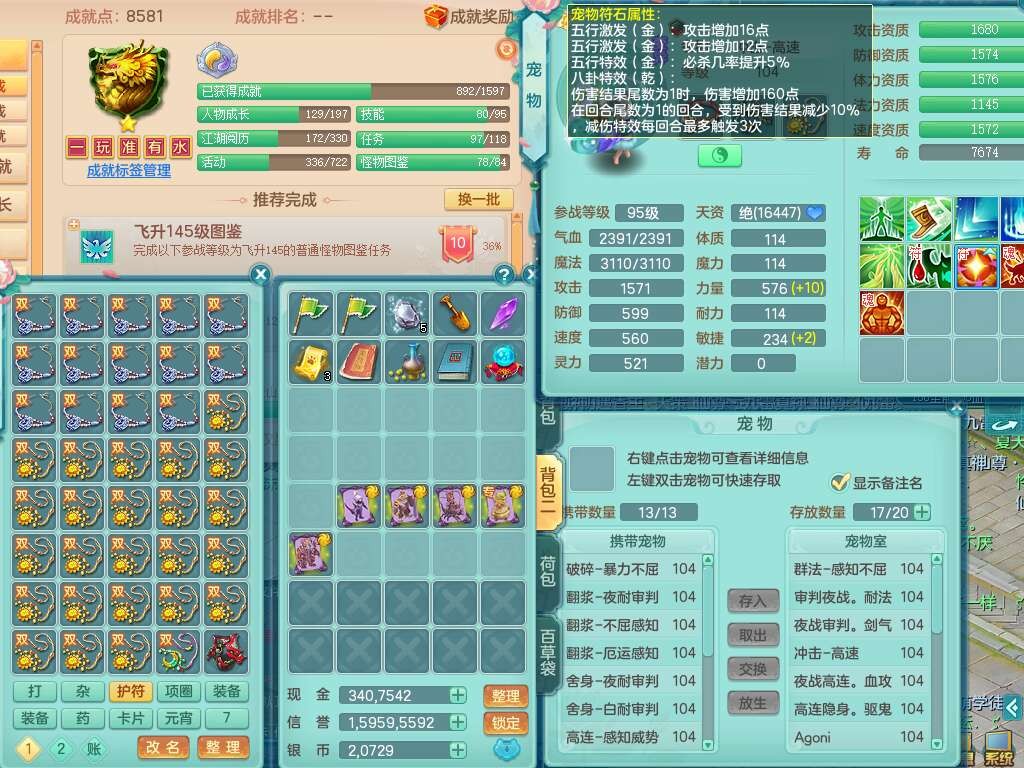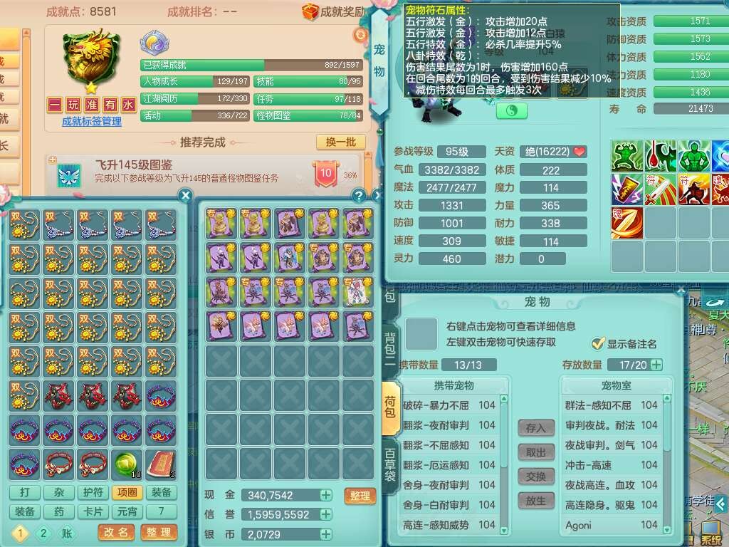 K22207彩云追月99女万兽,1内胆神,10只觉醒,8位靓号不含4,545狂暴破血单加武器,544易成长单加武器,崩山单加衣服,神佑单加链子,易成长单加33腰带,迅捷止戈单加31鞋子,迅捷玉清单加鞋子,2.5基础鼎+42攻+168血,2个纯六字,2个五字,11只满果子,宠排在榜,双人坐骑。