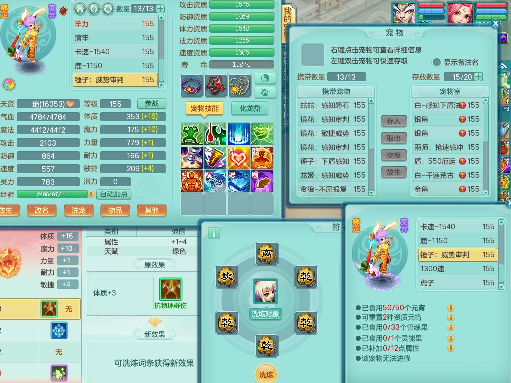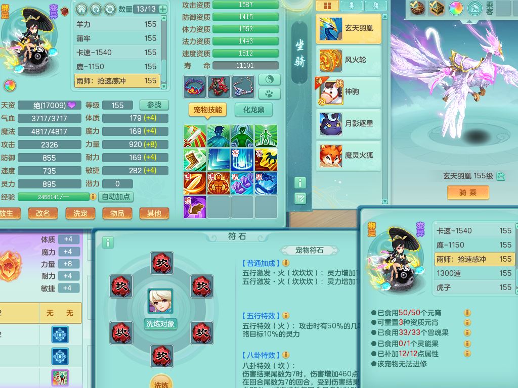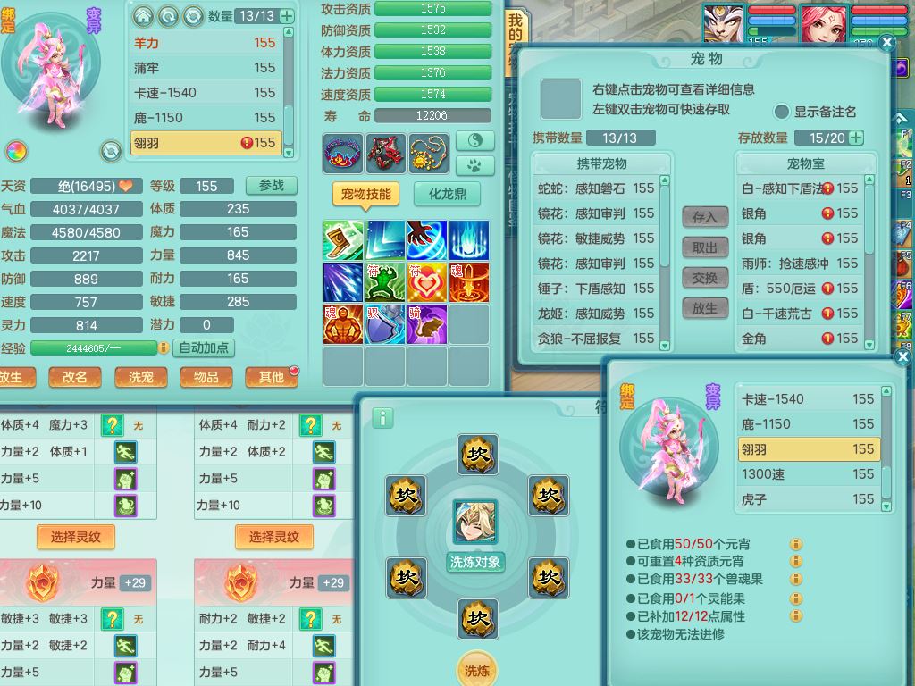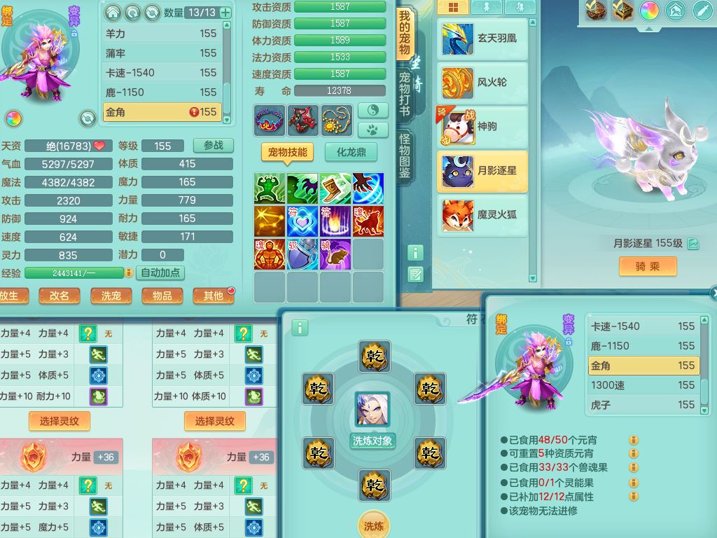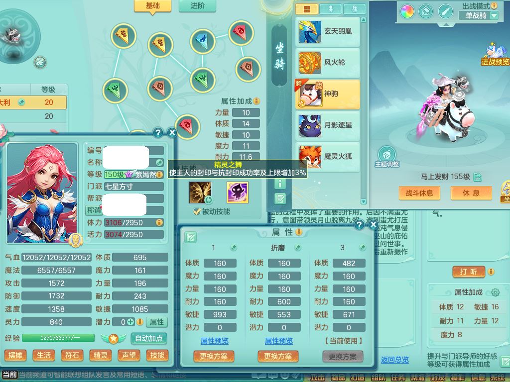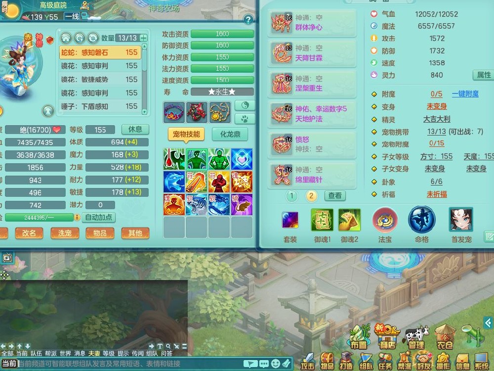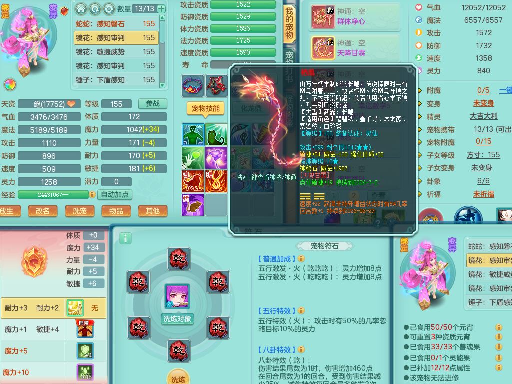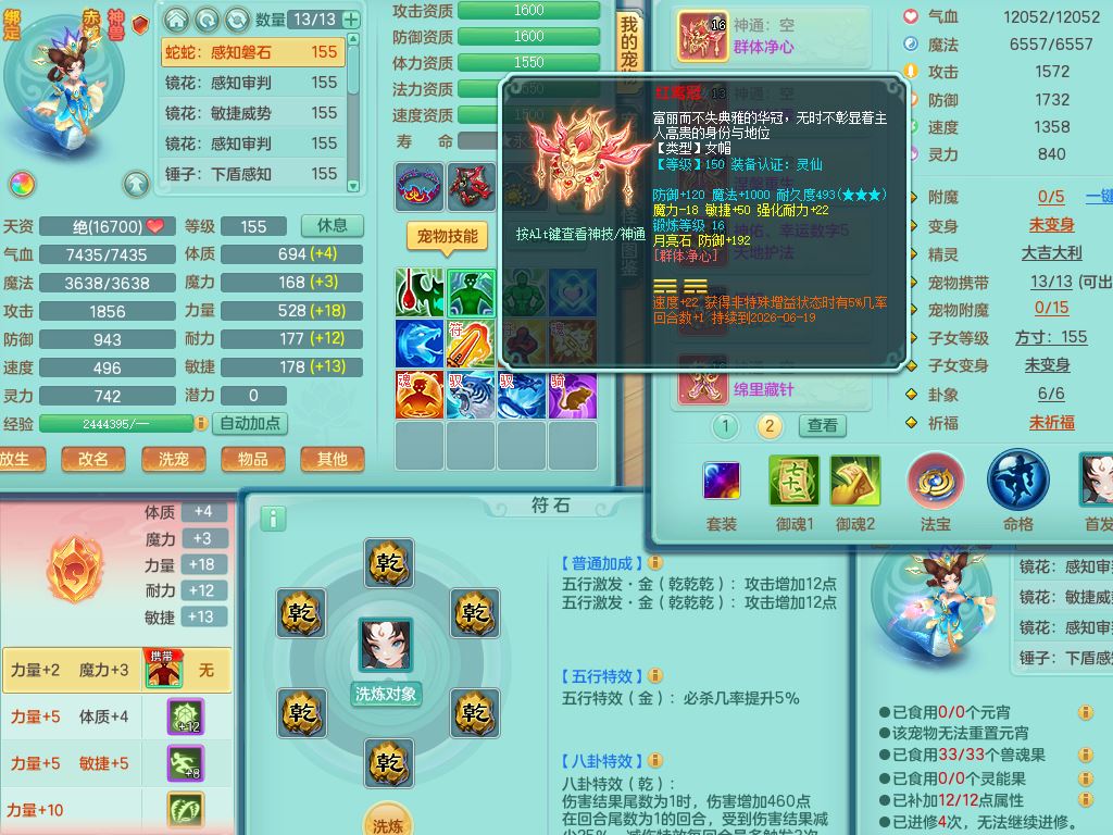 tx10353天下无双159女方寸【神驹马上发财】精灵舞,1内丹青蛇8皮1特殊荒古兽决,4镜花灵(1胚子)2龙姬(1胚子)15只满果子13觉醒13个纯6字,全身单加愤怒5特,神佑幸运罗汉项链,鼎5.5+70,144天月卡,永久外观精灵皮肤,24850金币,42内丹碎片,宠排在榜,3坐骑(1只飞行双人)