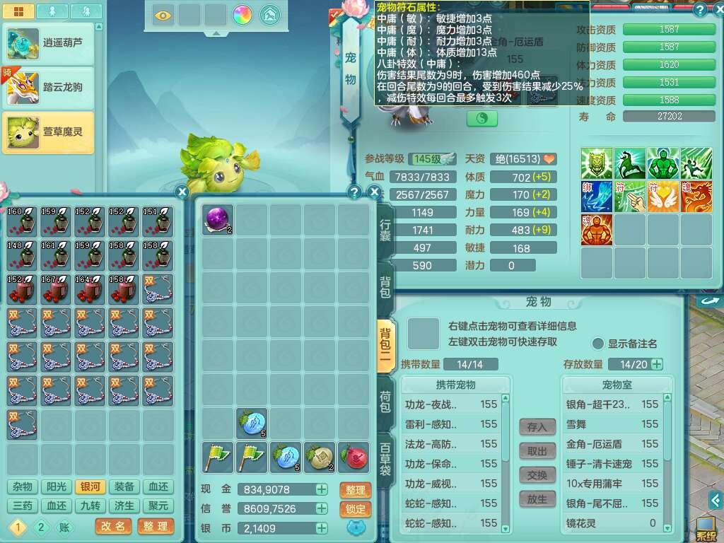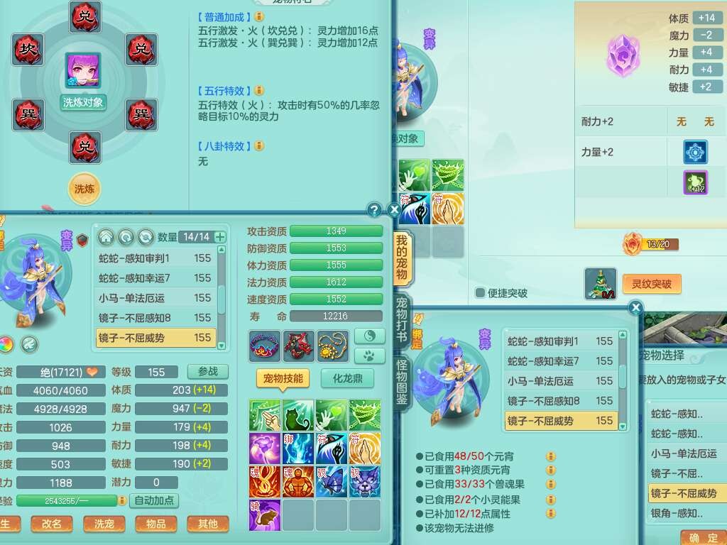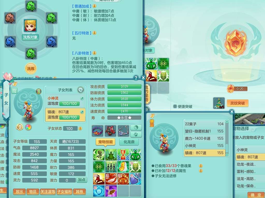 S22243浪淘沙159女魔王,精灵舞,5龙3内胆神,1破镜,9觉醒,4宠皮,4只六技能镜花灵,易成长单加54头,五雷单加56武器,易成长烽火单加50衣服,愤怒慈航单加57腰带,法缭单加51鞋子,5.0基础鼎+70攻+280血,3个纯六字,4个五字,16只满果子,宠排在榜,2只双人坐骑,带50天月卡。带4个153奶粉