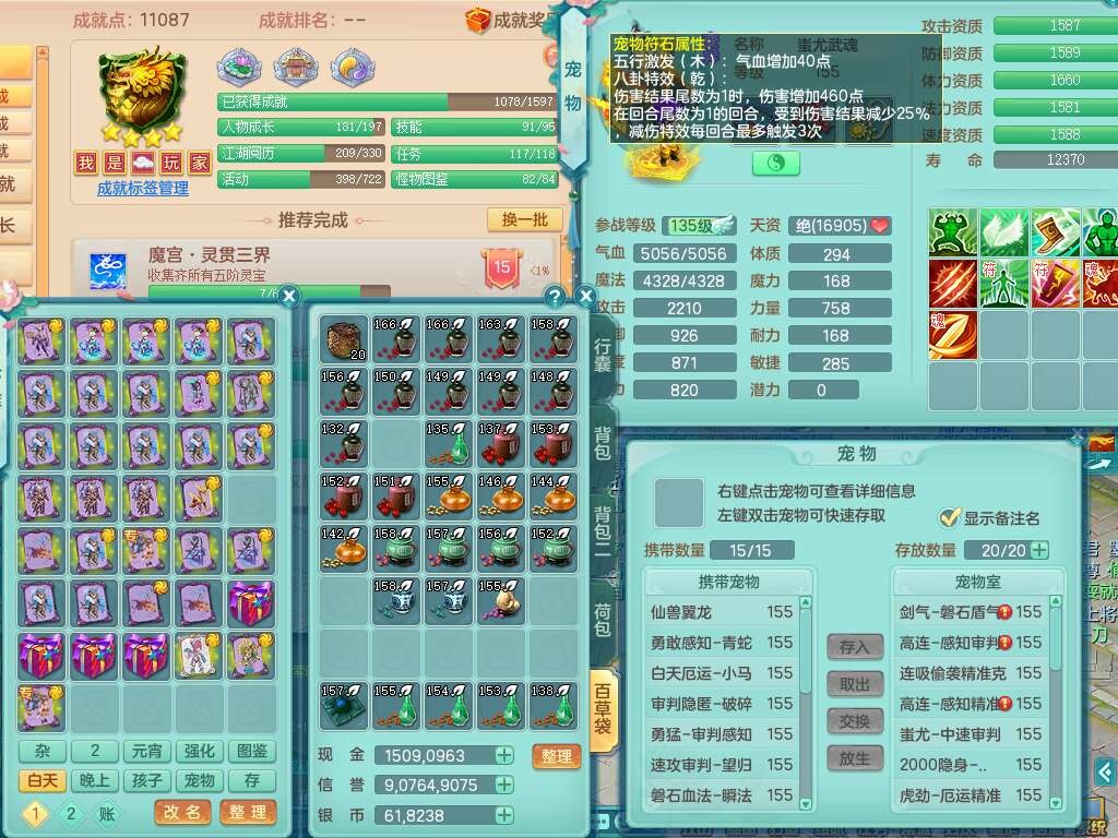 S22253风华绝代159男万兽,精灵歌,1龙无内,4内胆神,1破镜,1特殊(飞花),4只觉醒,4宠皮,2只六技能镜花灵,1只6技能龙姬,易成长单加50头,902狂暴单加54武器,强壮罗汉单加56衣服,神佑单加链子,崩山单加53腰带,易成长单加57鞋子,5.5基础鼎+70攻,13个格子,3个纯六字,5个5字,综合13只满果子,宠排在榜,修炼在榜,3个坐骑,带26天月卡。