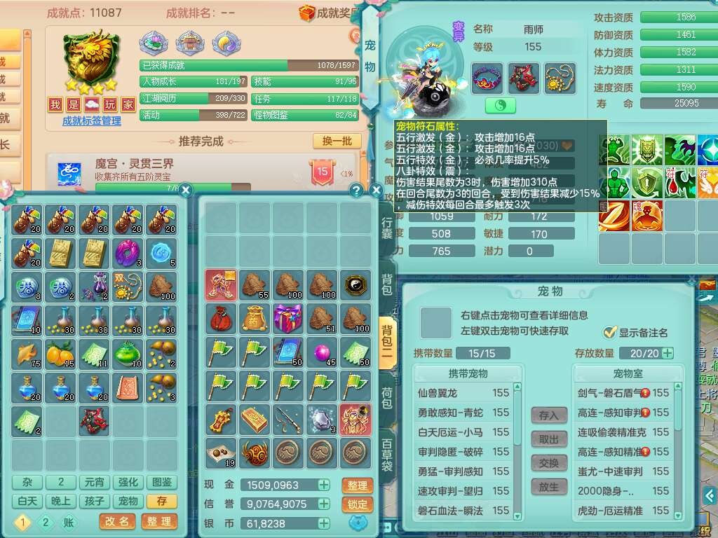 K22251风华绝代159男万兽,精灵歌,1龙无内,4内胆神,1破镜,1特殊(飞花),4只觉醒,4宠皮,2只六技能镜花灵,1只6技能龙姬,易成长单加50头,902狂暴单加54武器,强壮罗汉单加56衣服,神佑单加链子,崩山单加53腰带,易成长单加57鞋子,5.5基础鼎+70攻,13个格子,3个纯六字,5个5字,综合13只满果子,宠排在榜,修炼在榜,3个坐骑,带26天月卡。