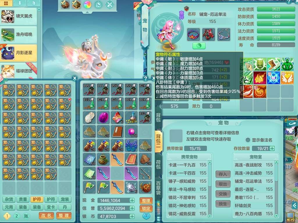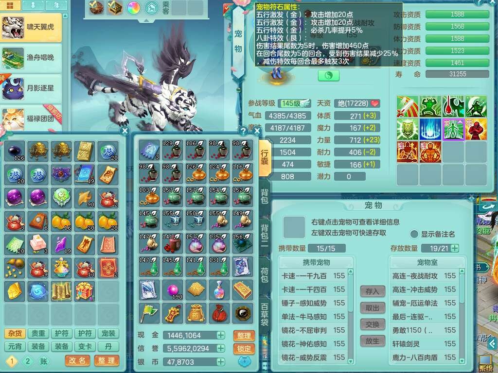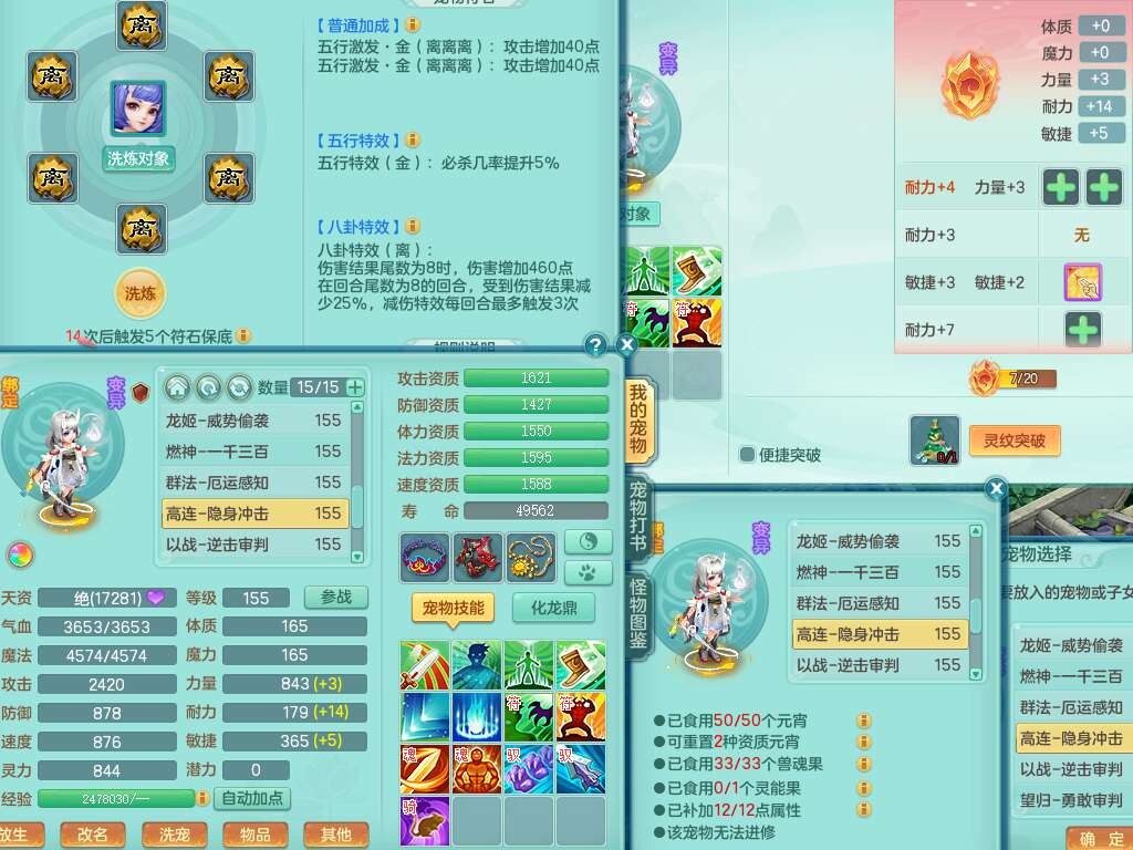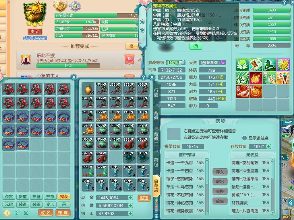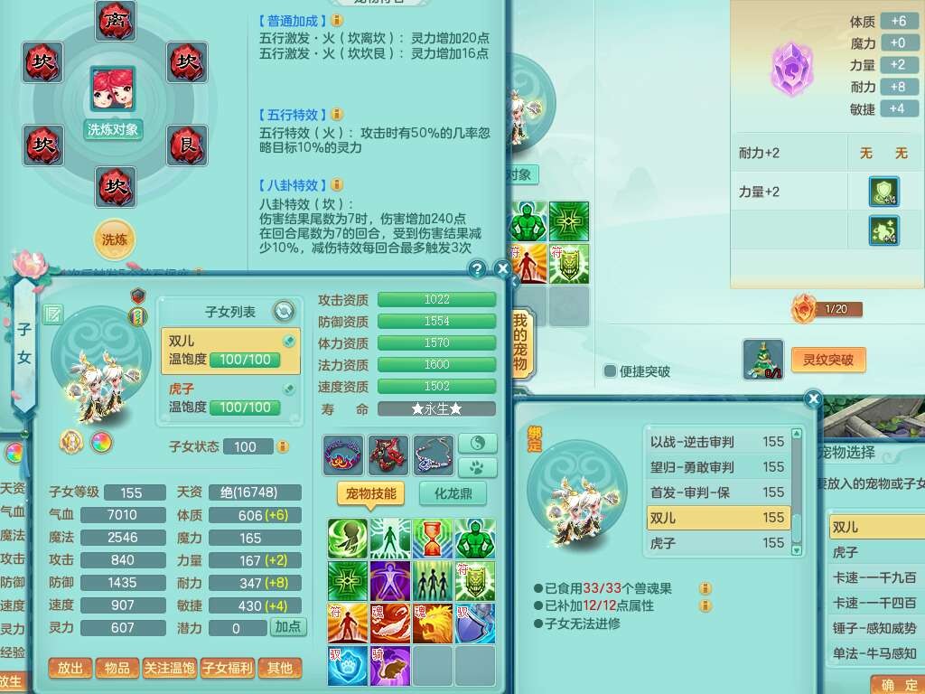 a22244七窍玲珑159女方寸,精灵舞,2龙(1龙没内),2内胆神,【10觉醒,已潜龙】,8位靓号不含4,2宠皮,4只六技能镜花灵,1只六技能龙姬,愤怒群体守备腰带,易成长罗汉单加57鞋子,六特,5.5基础鼎+70攻+280血,14个纯六字,1个五字,21只满果子,宠排在榜,2只双人坐骑,118天月卡。带1个155奶粉,1个152奶粉。