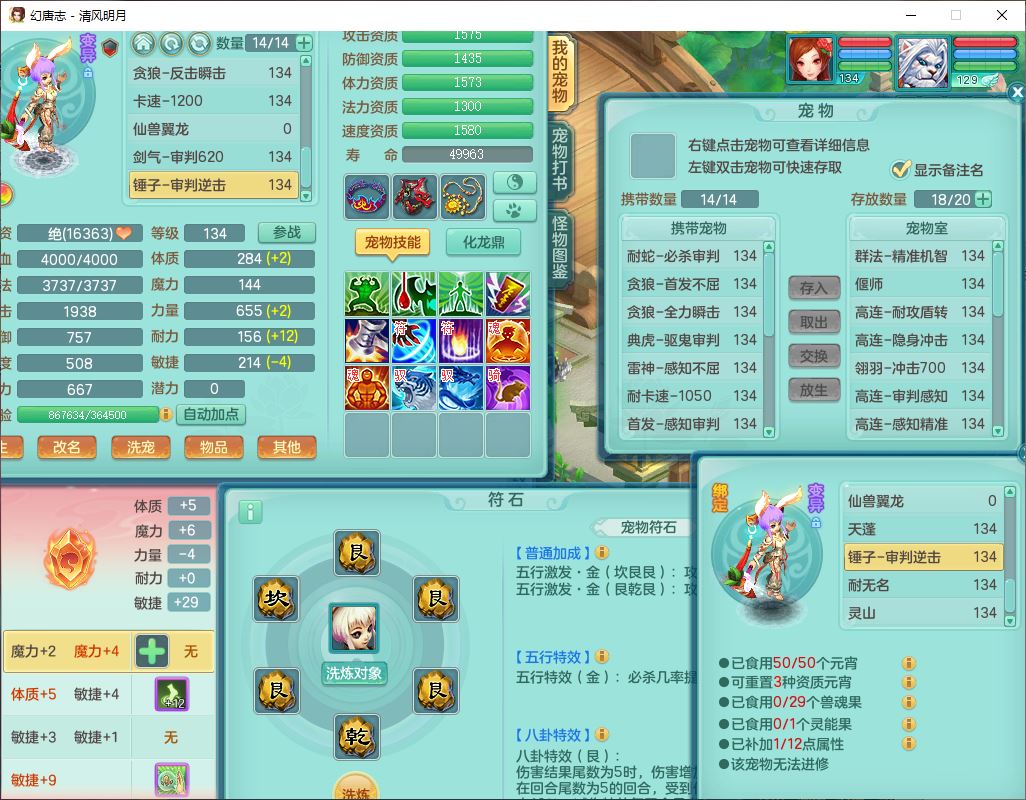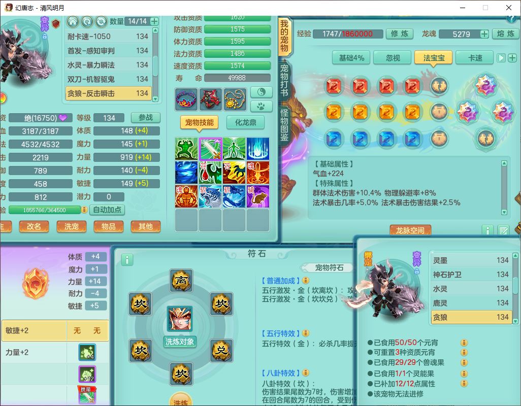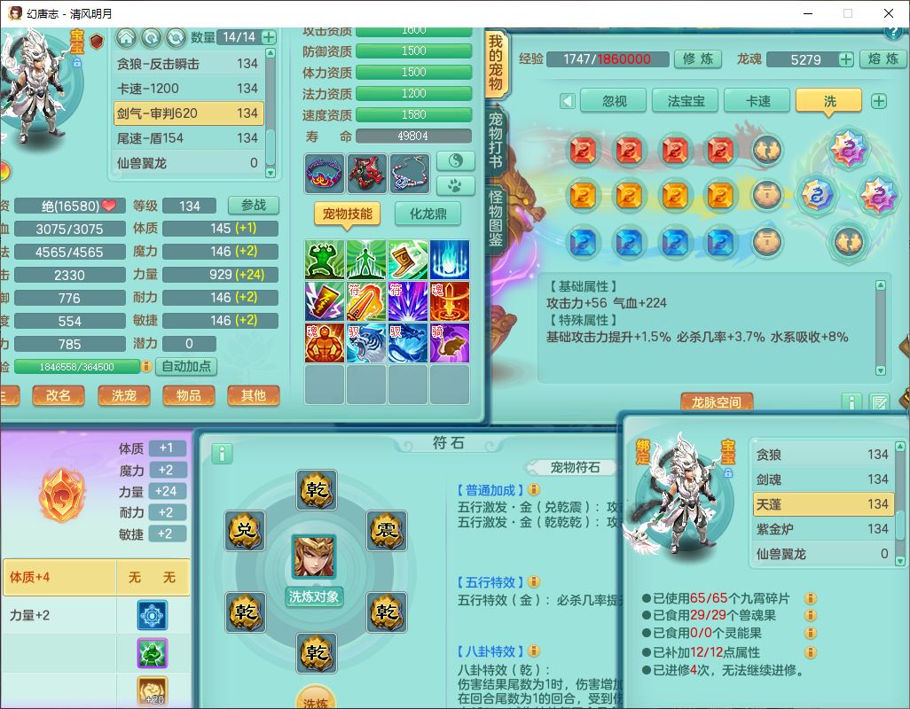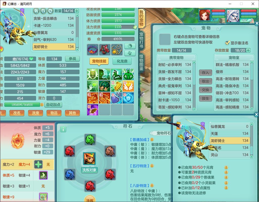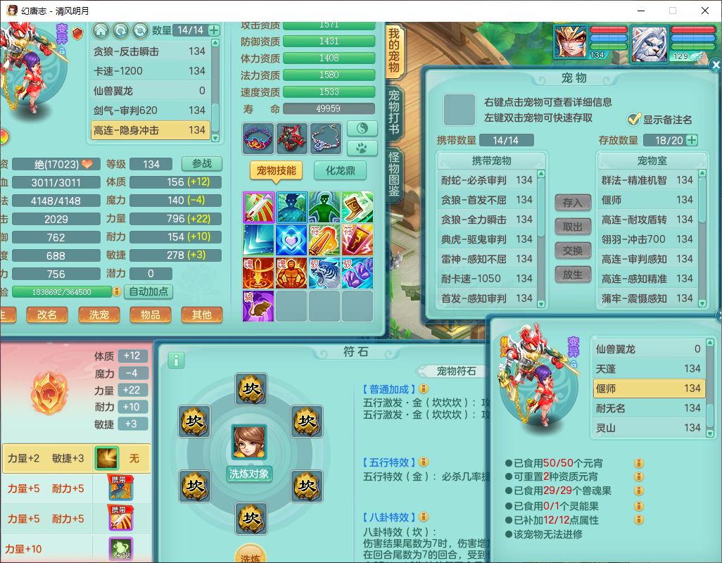 24297清风明月129男万兽【准潜龙号,差1只宝宝3条主符石1条附加】精灵歌,1龙(换、无内)1内丹青蛇3贪狼1神石1金炉,6觉醒7六字1五字13四字13只满果子,8红装备,必杀激励武器,崩山衣服,神佑项链,Y慈航腰带,仓库多双红,可搭星辰只有法系装,法爆回天武器,幸运法缭笑里衣服,鼎4.5+56+224,23个内丹碎片,1双人飞行坐骑
